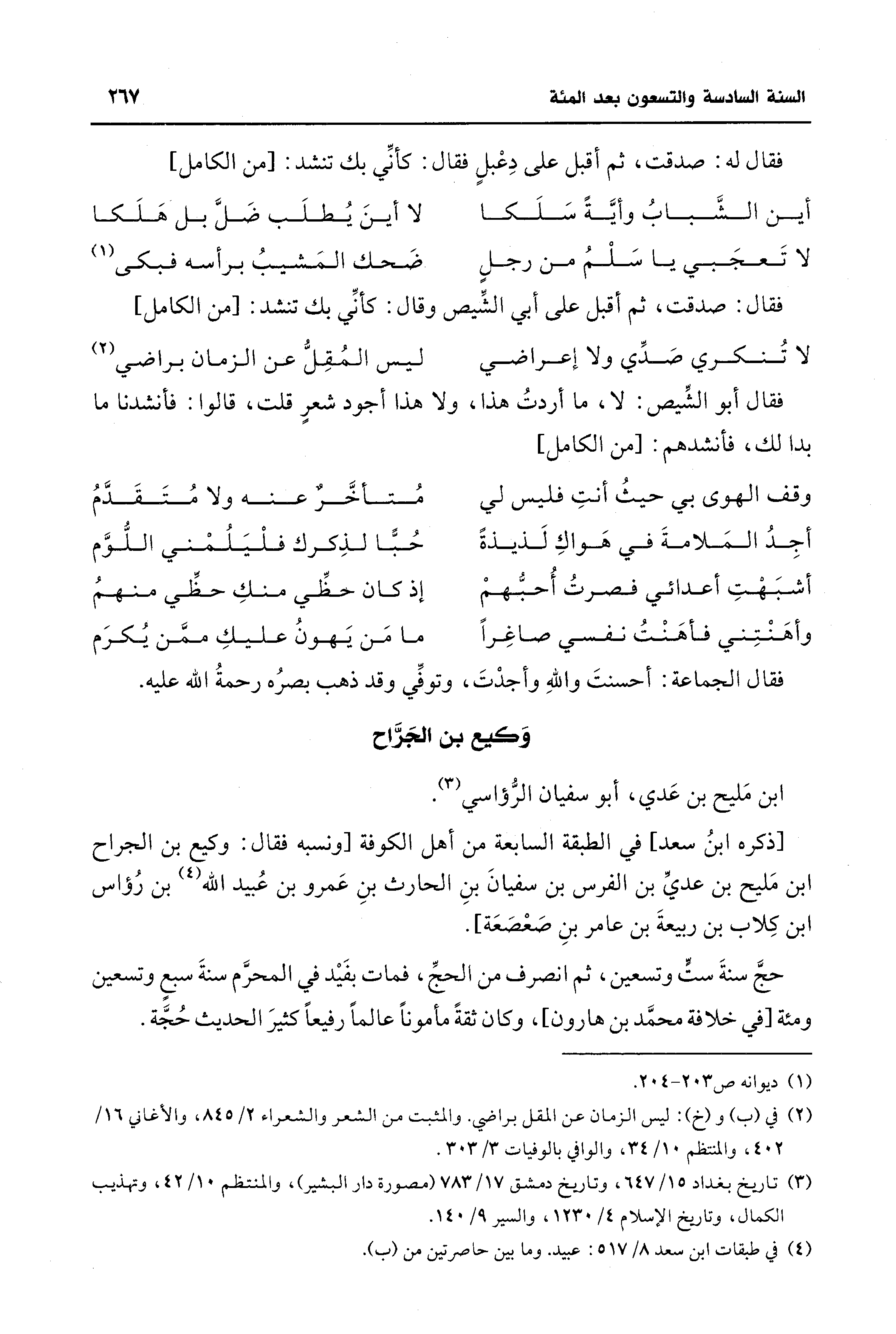 [ذكره ابنُ سعد] في الطبقة السابعة من أهل الكوفة [ونسبه فقال: وكيع بن الجراح بن مَليح بن عديِّ بن الفرس بن سفيانَ بنِ الحارث بنِ عَمرو بن عُبيد الله (¬4) بن رُؤاس بن كِلاب بن ربيعةَ بن عامر بن صَعْصَعَة].