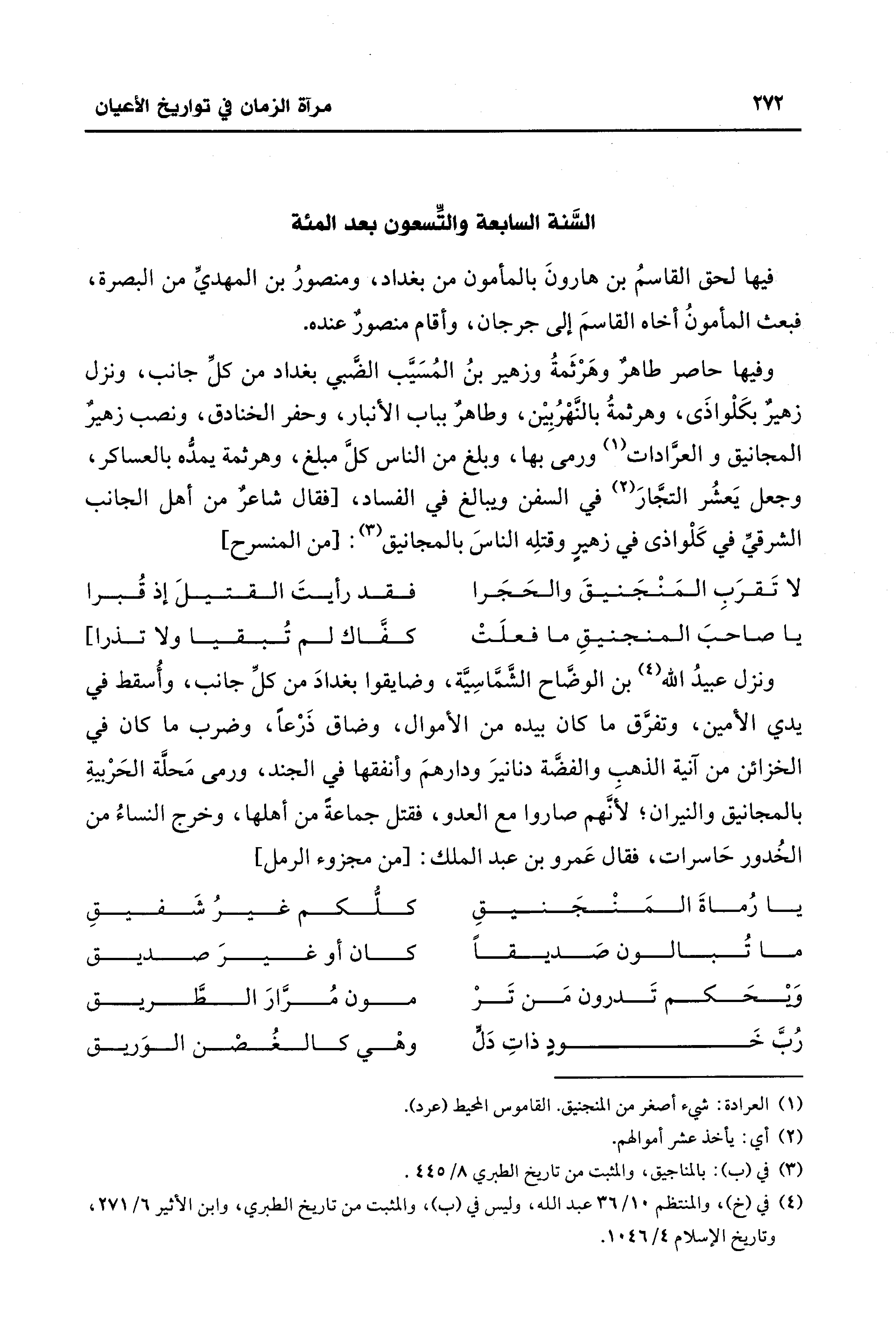 وفيها حاصر طاهرٌ وهَرْثَمةُ وزهير بنُ المُسَيَّب الضَّبي بغداد من كلِّ جانب، ونزل زهيرٌ بكَلْواذَى، وهرثمةُ بالنَّهْرُبِين، وطاهرٌ بباب الأنبار، وحفر الخنادق، ونصب زهيرٌ المجانيق والعرَّادات (¬1) ورمى بها، وبلغ من الناس كل مبلغ، وهرثمة يمدُّه بالعساكر، وجعل يَعشُر التجَّارَ (¬2) في السفن ويبالغ في الفساد، [فقال شاعر من أهل الجانب الشرقيِّ في كَلْواذى في زهيرٍ وقتلِه الناسَ بالمجانيق (¬3): [من المنسرح]