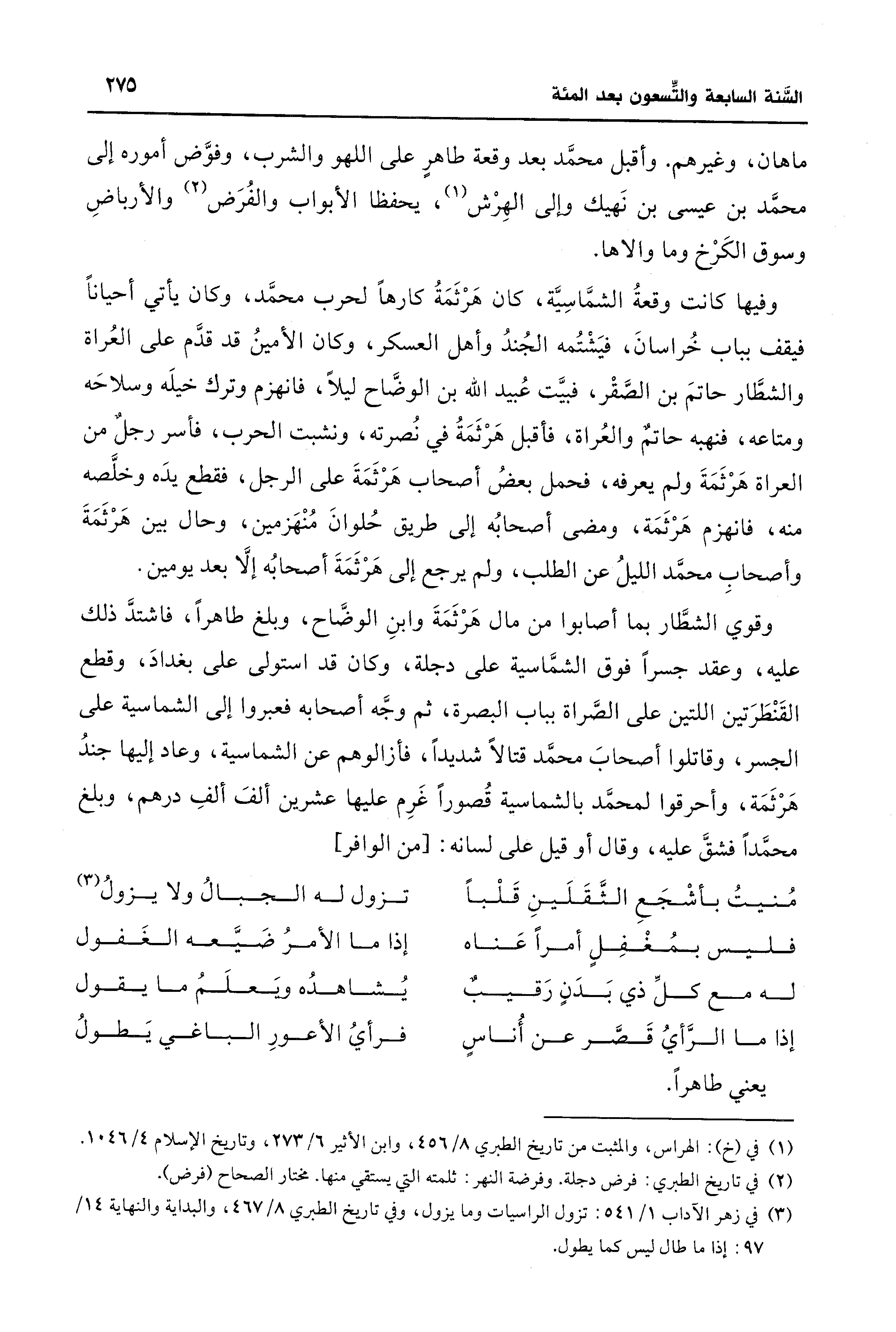 وقوي الشطَّار بما أصابوا من مال هَرْثَمَةَ وابنِ الوضَّاح، وبلغ طاهرًا، فاشتدَّ ذلك عليه، وعقد جسرًا فوق الشمَّاسية على دجلة، وكان قد استولى على بغدادَ، وقطع القَنْطَرَتين اللتين على الصَّراة بباب البصرة، ثم وجَّه أصحابه فعبروا إلى الشماسية على الجسر، وقاتلوا أصحابَ محمَّد قتالًا شديدًا، فأزالوهم عن الشماسية، وعاد إليها جندُ هَرْثَمَة، وأحرقوا لمحمَّد بالشماسية قُصورًا غَرِم عليها عشرين ألفَ ألفِ درهم، وبلغ محمَّدًا فشقَّ عليه، وقال أو قيل على لسانه: [من الوافر]