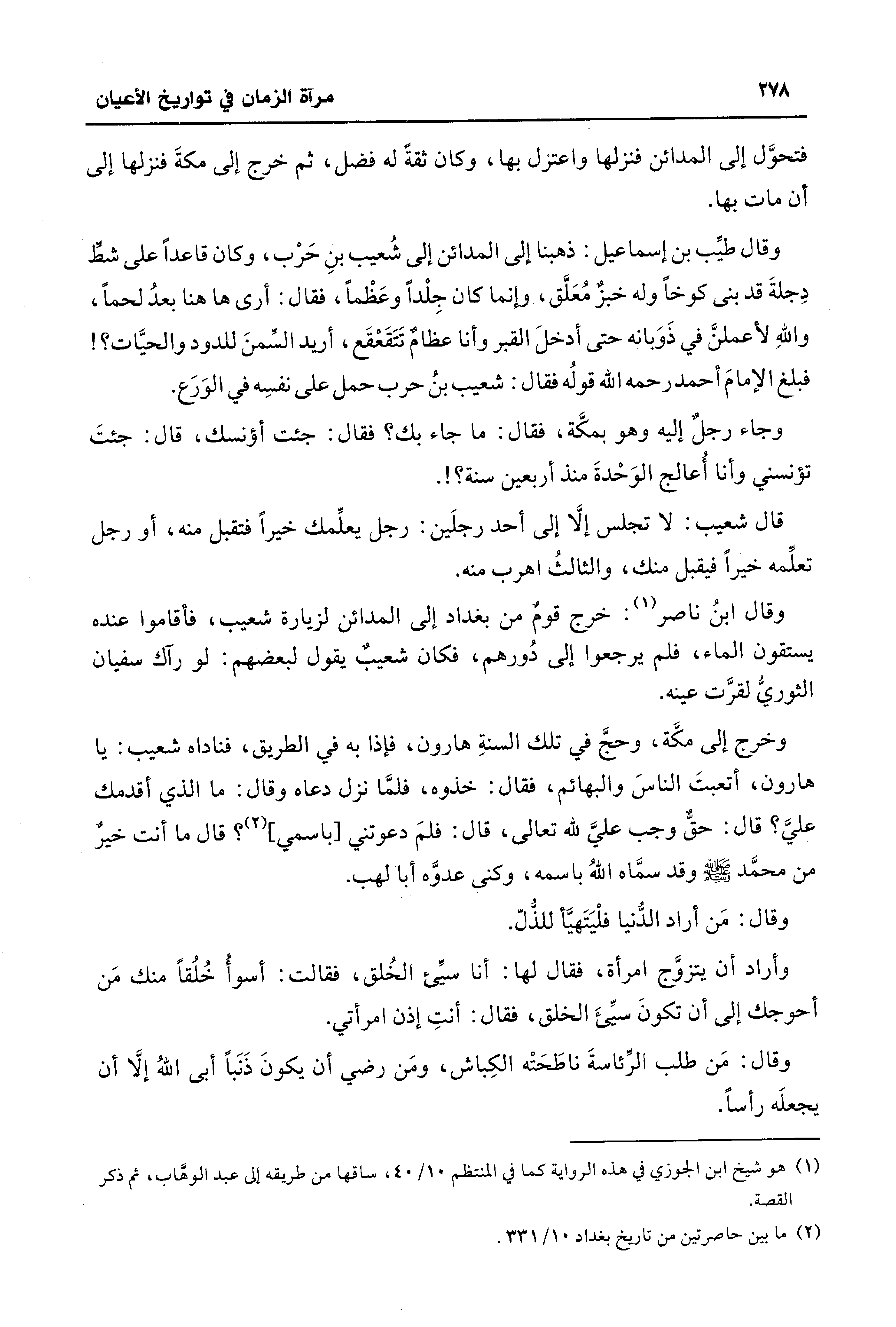 وخرج إلى مكَّة، وحجَّ في تلك السُّنةِ هارون، فإذا به في الطريق، فناداه شعيب: يا هارون، أتعبتَ الناسَ والبهائم، فقال: خذوه، فلمَّا نزل دعاه وقال: ما الذي أقدمك عليَّ؟ قال: حقٌّ وجب عليَّ لله تعالى، قال: فلمَ دعوتني [باسمي] (¬2)؟ قال ما أنت خيرٌ من محمَّد - صلى الله عليه وسلم - وقد سمَّاه اللهُ باسمه، وكنى عدوَّه أبا لهب.