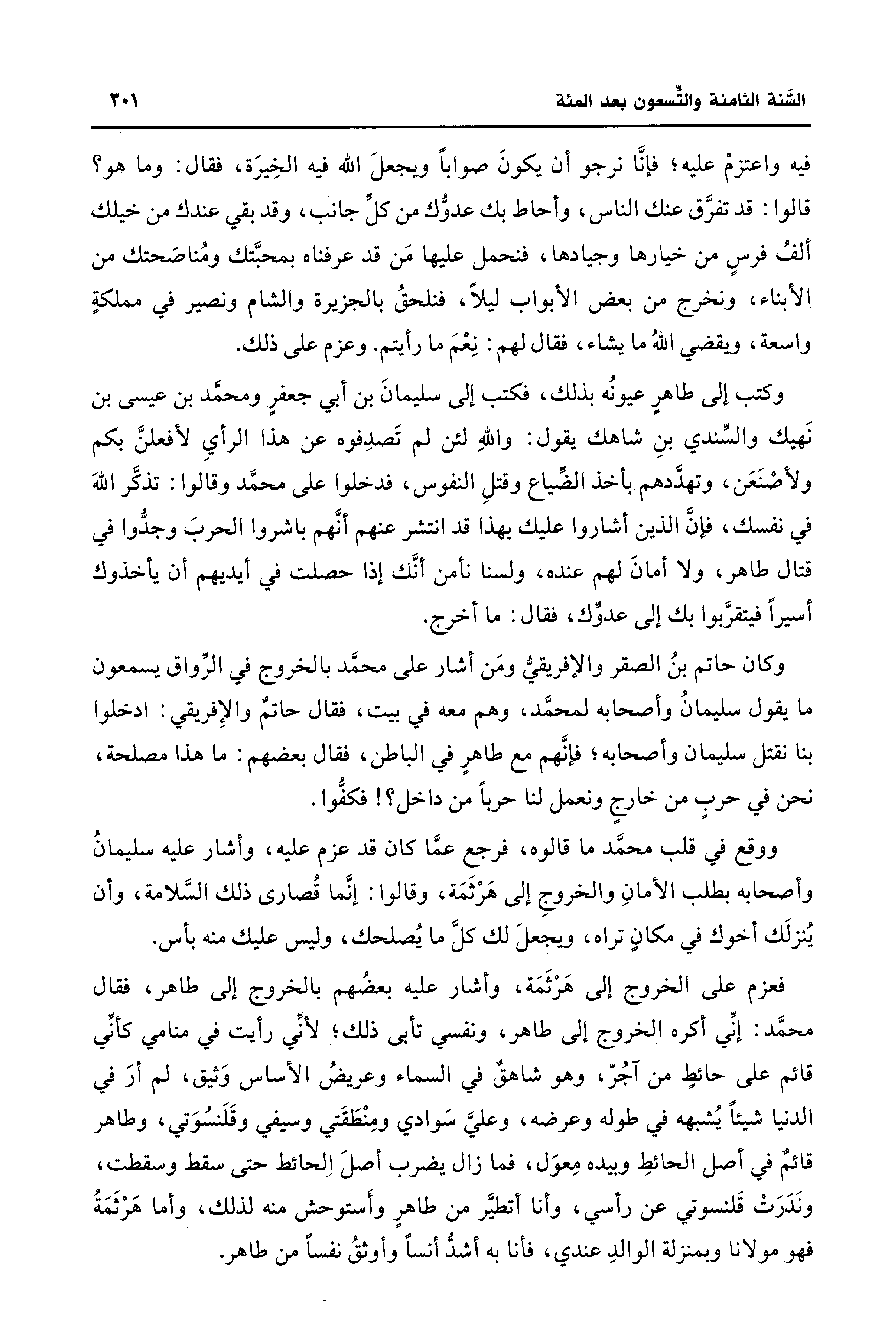 وكان حاتم بنُ الصقر والإفريقيُّ ومَن أشار على محمَّد بالخروج في الرِّواق يسمعون ما يقول سليمانُ وأصحابه لمحمَّد، وهم معه في بيت، فقال حاتمٌ والإِفريقي: ادخلوا بنا نقتل سليمان وأصحابه؛ فإنَّهم مع طاهرٍ في الباطن، فقال بعضهم: ما هذا مصلحة، نحن في حربٍ من خارجٍ ونعمل لنا حربًا من داخل؟ ! فكفُّوا.