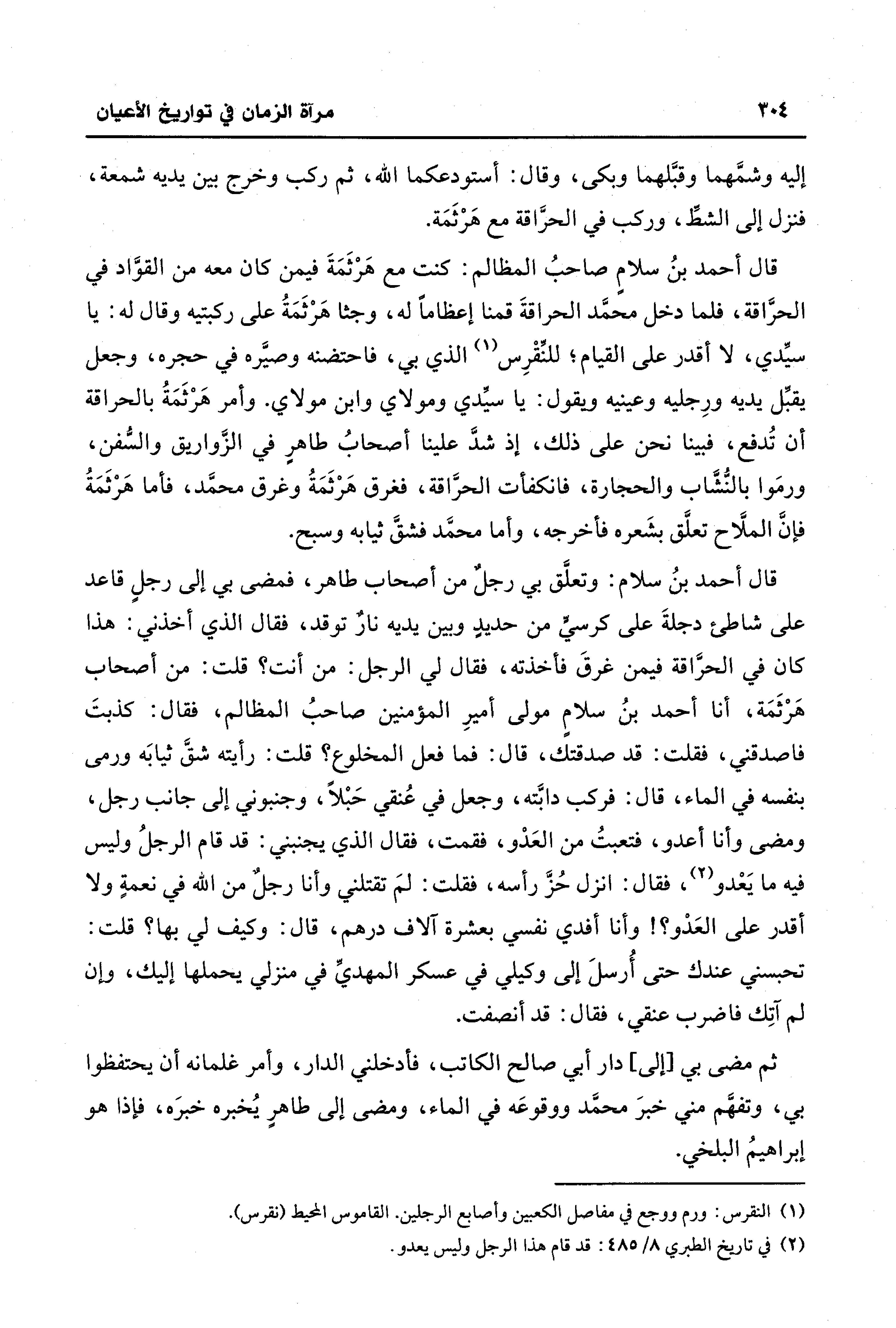 قال أحمد بنُ سلام: وتعلق بي رجلٌ من أصحاب طاهر، فمضى بي إلى رجلٍ قاعد على شاطئ دجلةَ على كرسيٍّ من حديدٍ وبين يديه نارٌ توقد، فقال الذي أخذني: هذا كان في الحرَّاقة فيمن غرقَ فأخذته، فقال لي الرجل: من أنت؟ قلت: من أصحاب هَرْثَمَة، أنا أحمد بنُ سلامٍ مولى أميرِ المؤمنين صاحبُ المظالم، فقال: كذبتَ فاصدقني، فقلت: قد صدقتك، قال: فما فعل المخلوع؟ قلت: رأيته شقَّ ثيابَه ورمى بنفسه في الماء، قال: فركب دابَّته، وجعل في عُنقي حَبْلًا، وجنبوني إلى جانب رجل، ومضى وأنا أعدو، فتعبتُ من العَدْو، فقمت، فقال الذي يجنبني: قد قام الرجلُ وليس فيه ما يَعْدو (¬2)، فقال: أنزل حُزَّ رأسه، فقلت: لمَ تقتلني وأنا رجل من الله في نعمةٍ ولا أقدر على العَدْو؟ ! وأنا أفدي نفسي بعشرة آلاف درهم، قال: وكيف لي بها؟ قلت: تحبسني عندك حتى أُرسلَ إلى وكيلي في عسكر المهديِّ في منزلي يحملها إليك، وإن لم آتِك فاضرب عنقي، فقال: قد أنصفت.