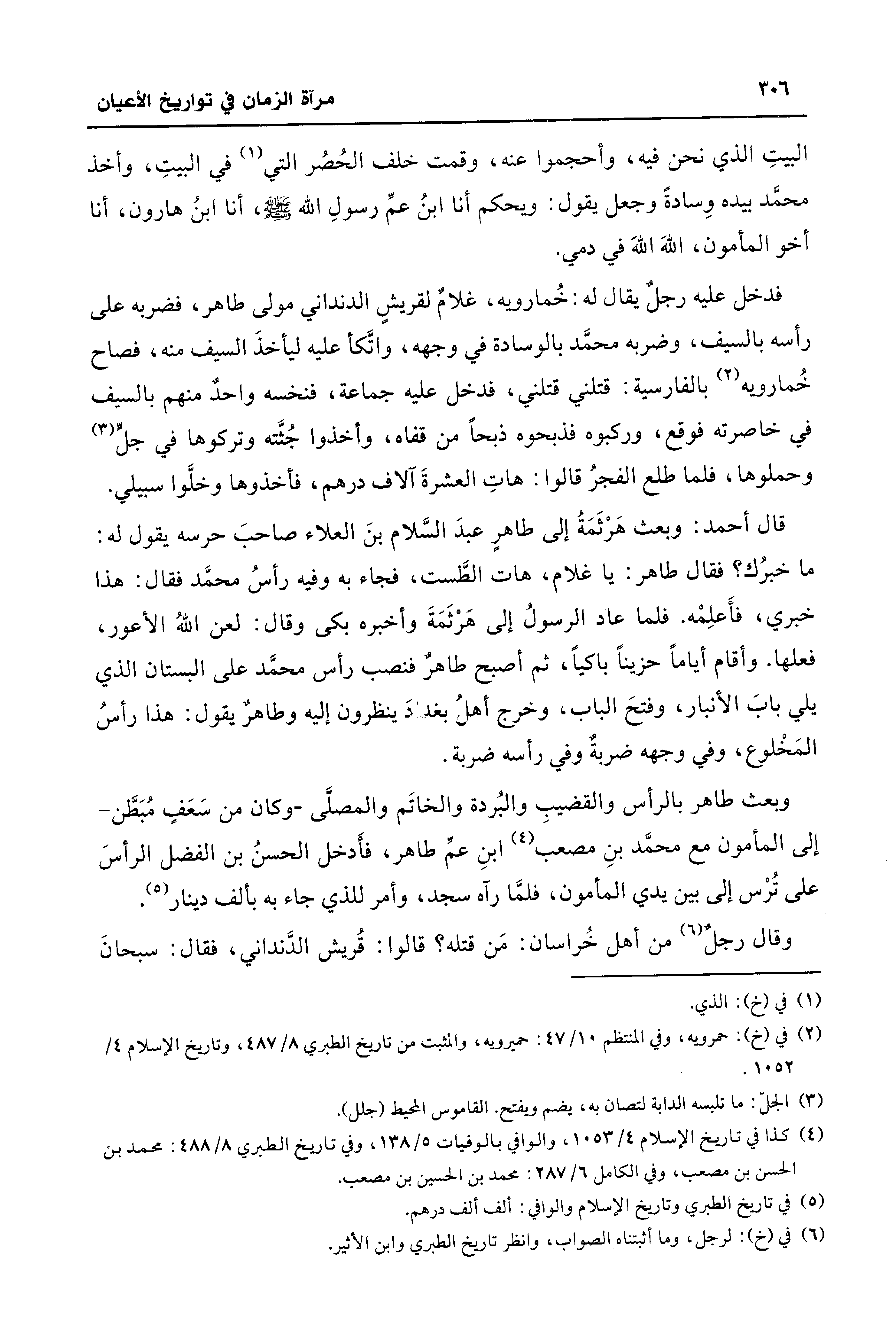 فدخل عليه رجلٌ يقال له: خُمارويه، غلامٌ لقريشٍ الدنداني مولى طاهر، فضربه على رأسه بالسيف، وضربه محمَّد بالوسادة في وجهه، واتَّكأ عليه ليأخذَ السيف منه، فصاح خُمارويه (¬2) بالفارسية: قتلني قتلني، فدخل عليه جماعة، فنخسه واحدٌ منهم بالسيف في خاصرته فوقع، وركبوه فذبحوه ذبحًا من قفاه، وأخذوا جُثَّته وتركوها في جلٍّ (¬3) وحملوها، فلما طلع الفجرُ قالوا: هاتِ العشرةَ آلاف درهم، فأخذوها وخلَّوا سبيلي.