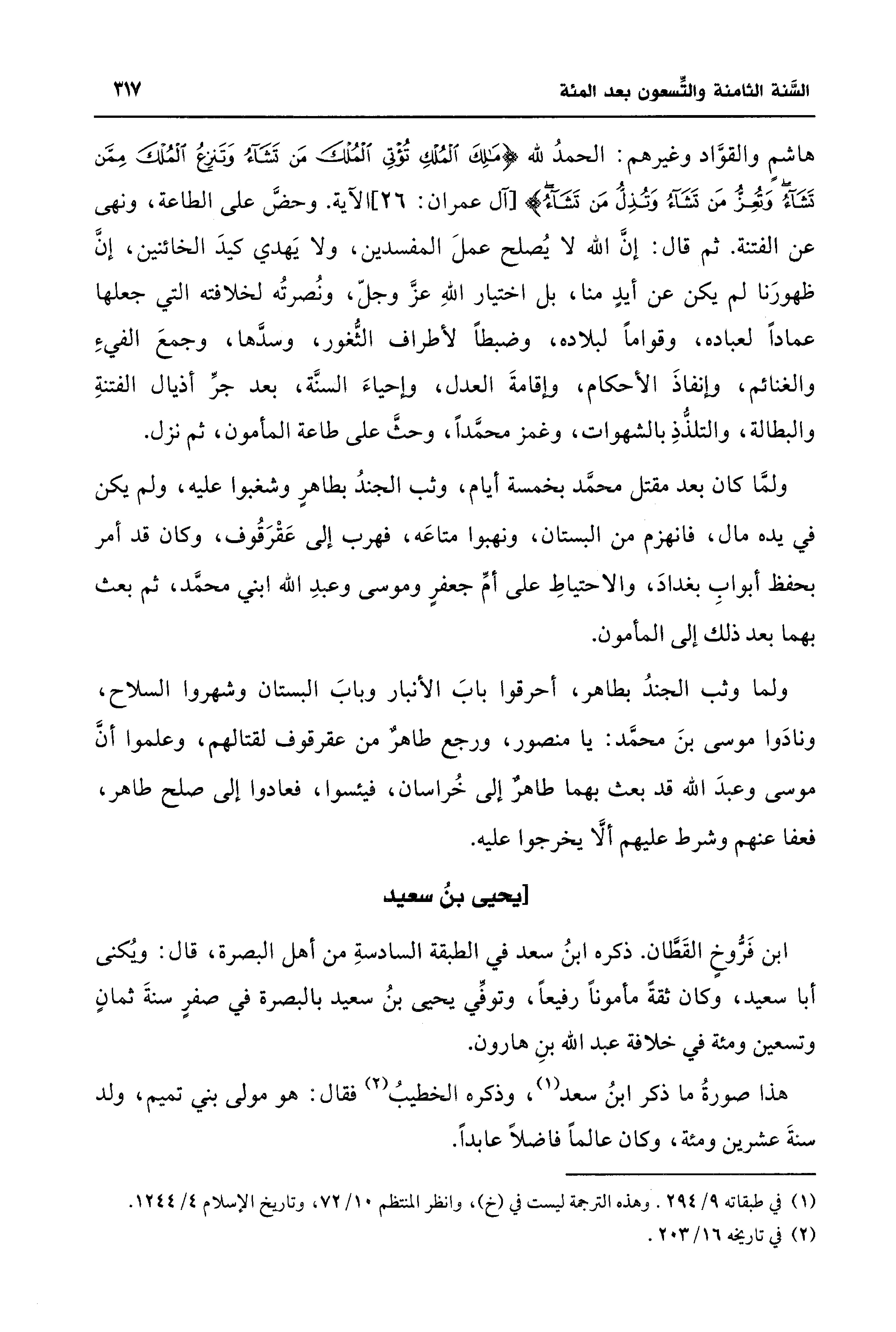 هاشمٍ والقوَّاد وغيرهم: الحمدُ لله {مَالِكَ الْمُلْكِ تُؤْتِي الْمُلْكَ مَنْ تَشَاءُ وَتَنْزِعُ الْمُلْكَ مِمَّنْ تَشَاءُ وَتُعِزُّ مَنْ تَشَاءُ وَتُذِلُّ مَنْ تَشَاءُ} [آل عمران: 26] الآية. وحضَّ على الطاعة، ونهى عن الفتنة. ثم قال: إنَّ الله لا يُصلح عملَ المفسدين، ولا يَهدي كيدَ الخائنين، إنَّ ظهورَنا لم يكن عن أبيدٍ منا، بل اختيار اللهِ عزَّ وجلّ، ونُصرتُه لخلافته التي جعلها عمادًا لعباده، وقوامًا لبلاده، وضبطًا لأطراف الثُّغور، وسدَّها، وجمعَ الفيءِ والغنائم، وإنفاذَ الأحكام، وإقامةَ العدل، وإحياءَ السنَّة، بعد جرِّ أذيال الفتنةِ والبطالة، والتلذُّذِ بالشهوات، وغمز محمَّدًا، وحثَّ على طاعة المأمون، ثم نزل.