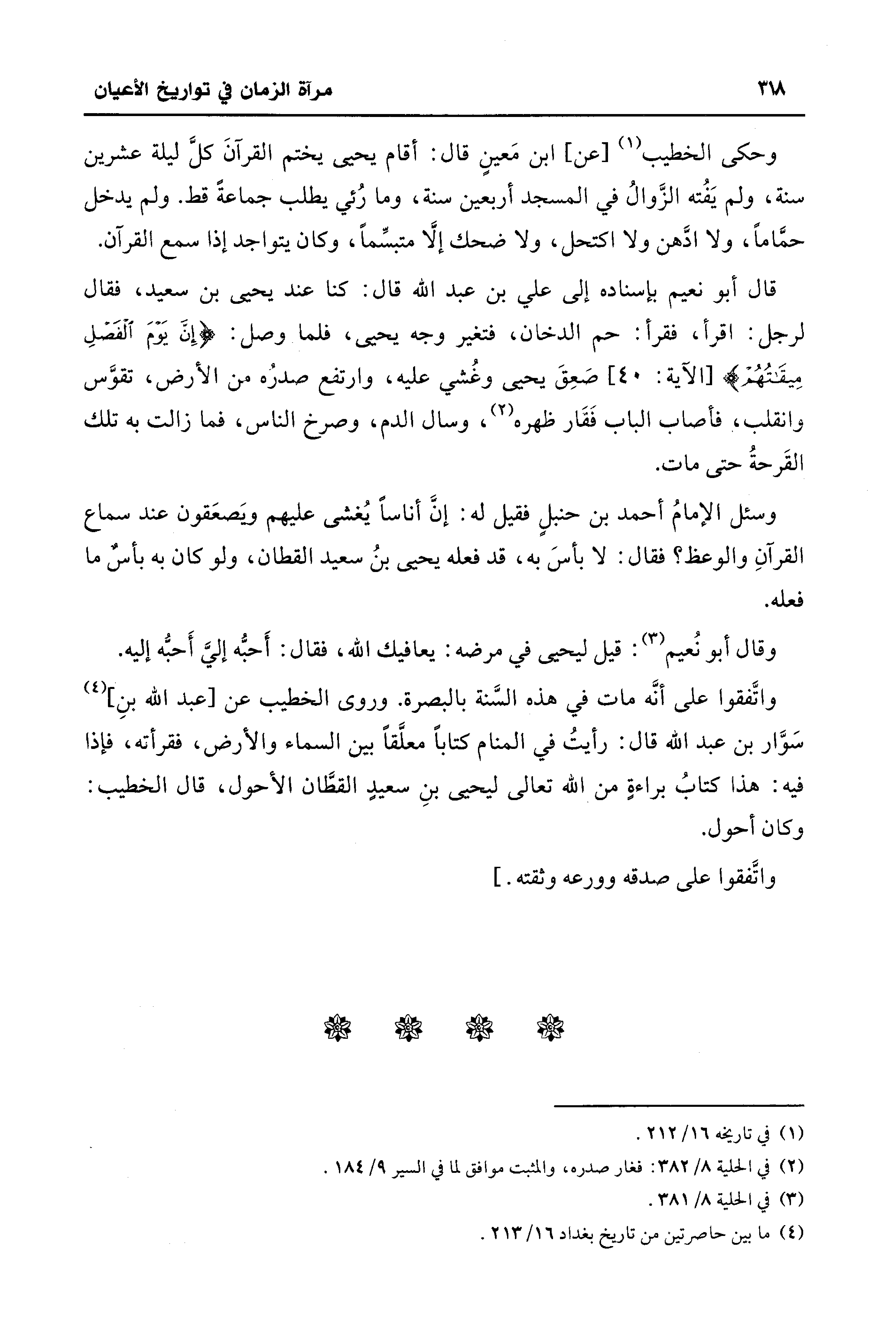 وحكى الخطيب (¬1) [عن] ابن مَعينٍ قال: أقام يحيى يختم القرآنَ كلَّ ليلة عشرين سنة، ولم يَفُته الزَّوالُ في المسجد أربعين سنة، وما رُئي يطلب جماعة قط. ولم يدخل حمَّامًا، ولا ادَّهن ولا اكتحل، ولا ضحك إلَّا متبسِّما، وكان يتواجد إذا سمع القرآن.