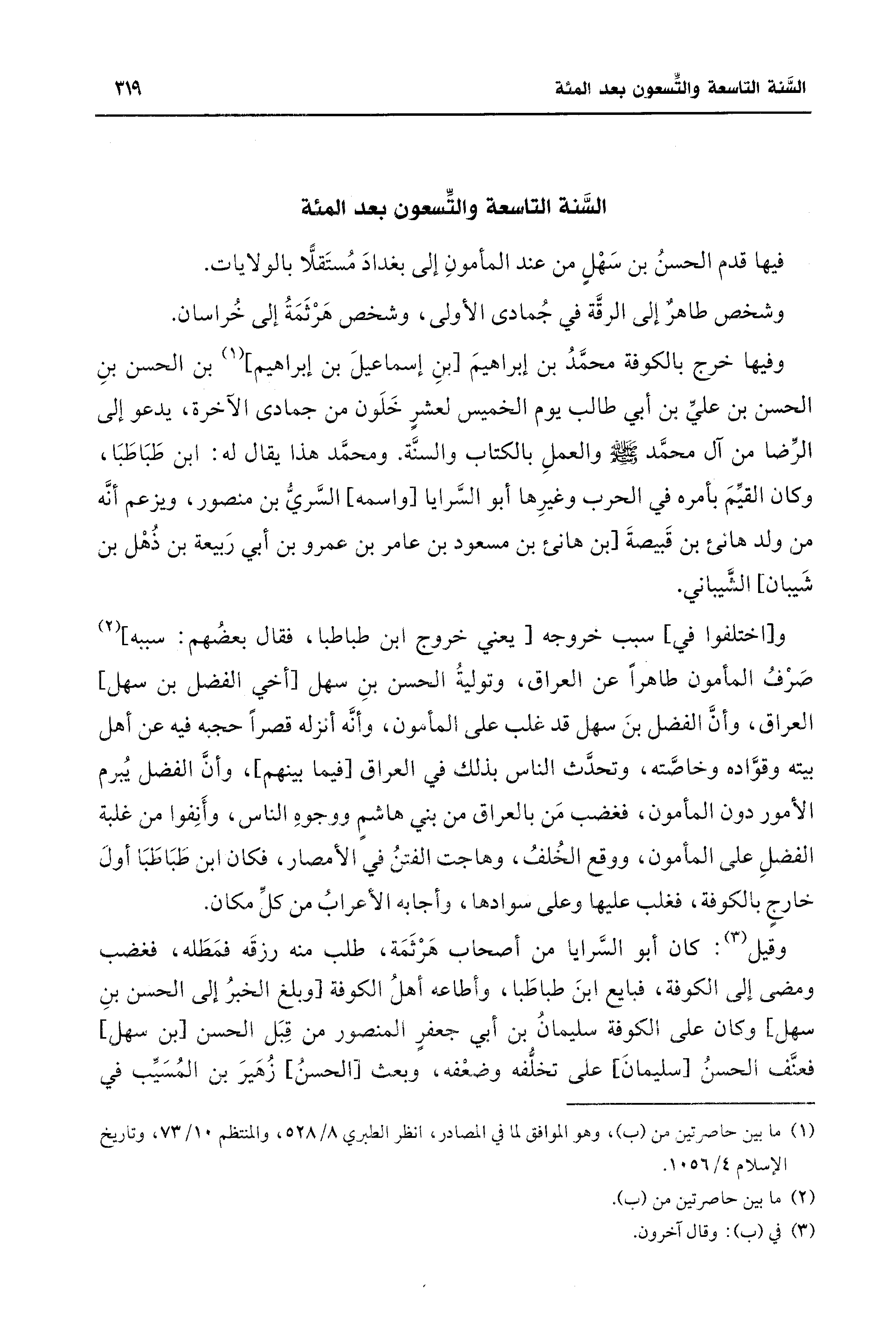 وقيل (¬3): كان أبو السَّرايا من أصحاب هرثمة، طلب منه رزقَه فمَطَله، فغضب ومضى إلى الكوفة، فبايع ابنَ طباطَبا، وأطاعه أهل الكوفة [وبلغ الخبرُ إلى الحسن بنِ سهل] وكان على الكوفة سليمان بن أبي جعفر المنصور من قبل الحسن [بن سهل] فعنف الحسن [سليمان] على وتخلُّفه، وضعْفه, [الحسن]، زُهَير بن المسيب في