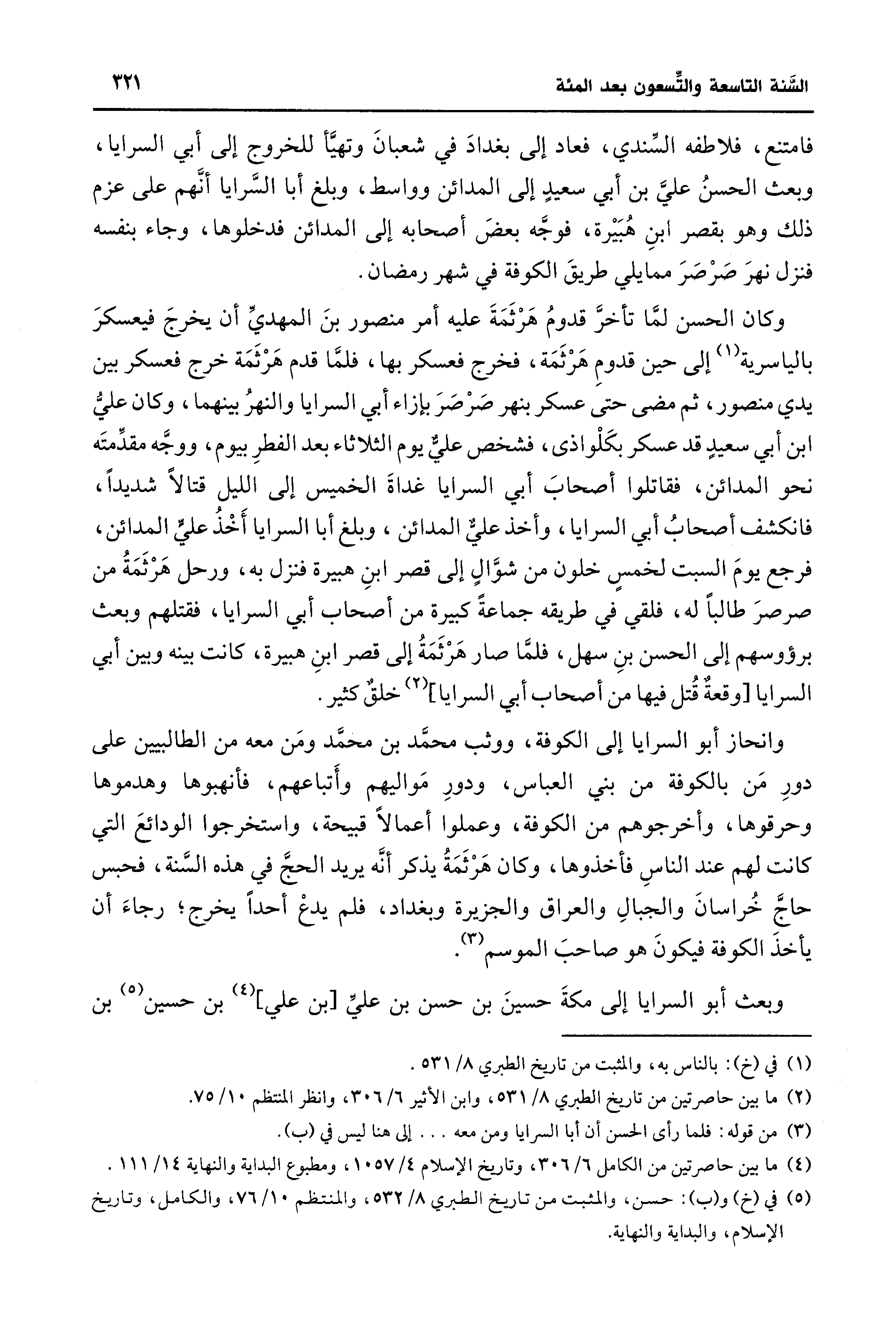 وانحاز أبو السرايا إلى الكوفة، ووثب محمَّد بن محمد ومَن معه من الطالبيين على دورِ مَن بالكوفة من بني العباس، ودورِ مَواليهم وأَتباعهم، فأنهبوها وهدموها وحرقوها، وأخرجوهم من الكوفة، وعملوا أعمالًا قبيحة، واستخرجوا الودائعَ التي كانت لهم عند الناسِ فأخذوها، وكان هَرْثَمَةُ يذكر أنَّه يريد الحجَ في هذه السنة، فحبس حاجَّ خُراسانَ والجبالِ والعراق والجزيرة وبغداد، فلم يدعْ أحدًا يخرج؛ رجاءَ أن يأخذَ الكوفة فيكونَ هو صاحبَ الموسم (¬3).