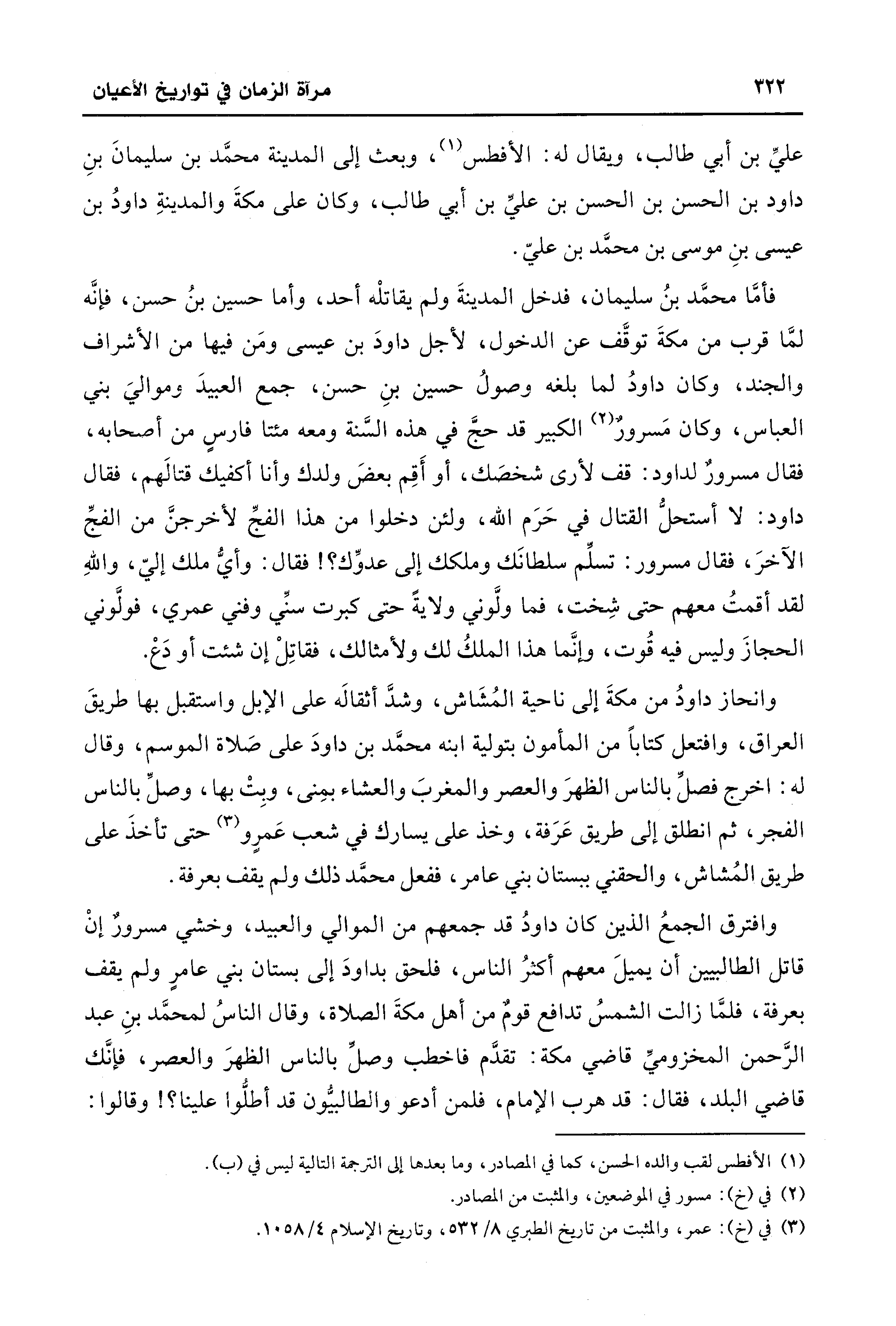 وافترق الجمعُ الذين كان داودُ قد جمعهم من الموالي والعبيد، وخشي مسرورٌ إنْ قاتل الطالبيين أن يميلَ معهم أكثرُ الناس، فلحق بداودَ إلى بستان بني عامر ولم يقف بعرفة، فلمَّا زالت الشمس تدافع قومٌ من أهل مكةَ الصلاة، وقال الناسُ لمحمَّد بنِ عبد الرَّحمن المخزوميِّ قاضي مكة: تقدَّم فاخطب وصلِّ بالناس الظهرَ والعصر، فإنَّك قاضي البلد، فقال: قد هرب الإِمام، فلمن أدعو والطالبيُّون قد أطلوا علينا؟ ! وقالوا: