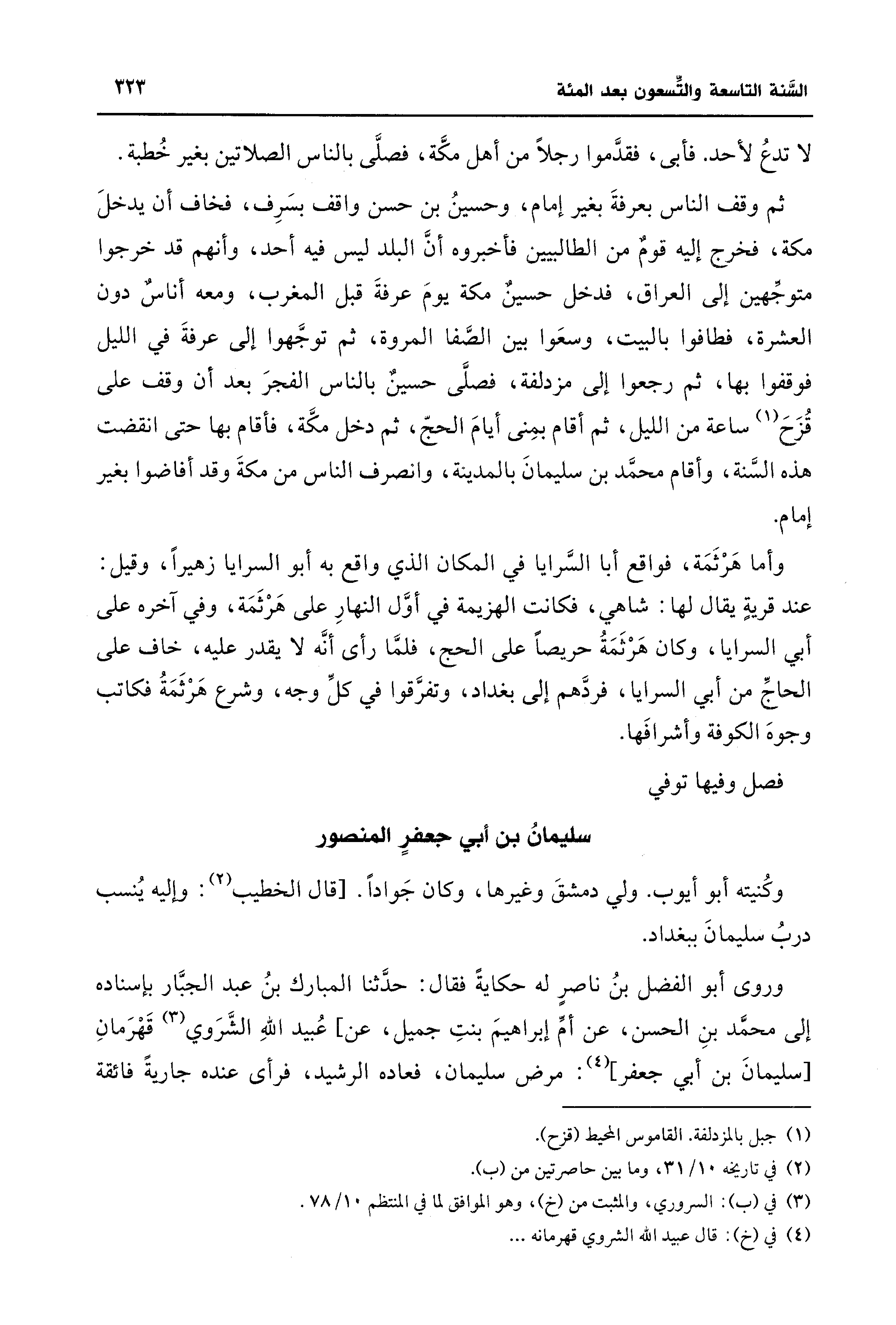 ثم وقف الناس بعرفةَ بغير إمام، وحسينُ بن حسن واقف بسَرِف، فخاف أن يدخلَ مكة، فخرج إليه قومٌ من الطالبيين فأخبروه أنَّ البلد ليس فيه أحد، وأنهم قد خرجوا متوجهين إلى العراق، فدخل حسينٌ مكة يومَ عرفةَ قبل المغرب، ومعه أناسٌ دون العشرة، فطافوا بالبيت، وسعَوا بين الصَّفا المروة، ثم توجَّهوا إلى عرفةَ في الليل فوقفوا بها، ثم رجعوا إلى مزدلفة، فصلَّى حسين بالناس الفجرَ بعد أن وقف على قُزَحَ (¬1) ساعة من الليل، ثم أقام بمِنى أيامَ الحج، ثم دخل مكَّة، فأقام بها حتى انقضت هذه السَّنة، وأقام محمَّد بن سليمانَ بالمدينة، وانصرف الناس من مكةَ وقد أفاضوا بغير إمام.
