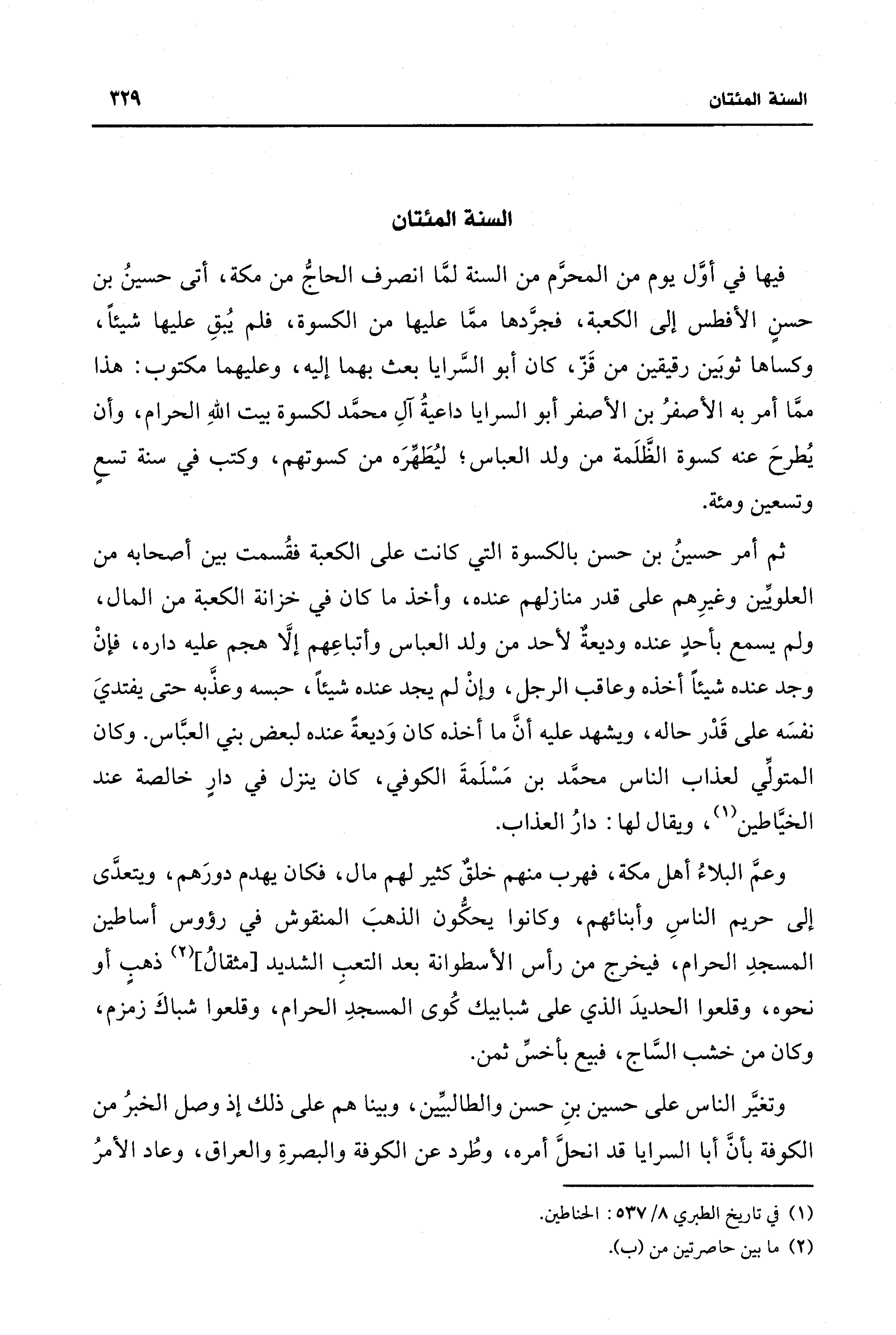 فيها في أوَّل يوم من المحرَّم من السنة لمَّا انصرف الحاجُّ من مكة، أتى حسينُ بن حسنٍ الأفطس إلى الكعبة، فجرَّدها مما عليها من الكسوة، فلم يُبقِ عليها شيئًا، وكساها ثوبَين رقيقين من قَزّ، كان أبو السرايا بعث بهما إليه، وعليهما مكتوب: هذا ممَّا أمر به الأصفرُ بن الأصفر أبو السرايا داعيةُ آلِ محمَّد لكسوة بيت اللهِ الحرام، وأن يُطرحَ عنه كسوة الظَّلَمة من ولد العباس؛ ليُطَهِّرَه من كسوتهم، وكتب في سنة تسعٍ وتسعين ومئة.