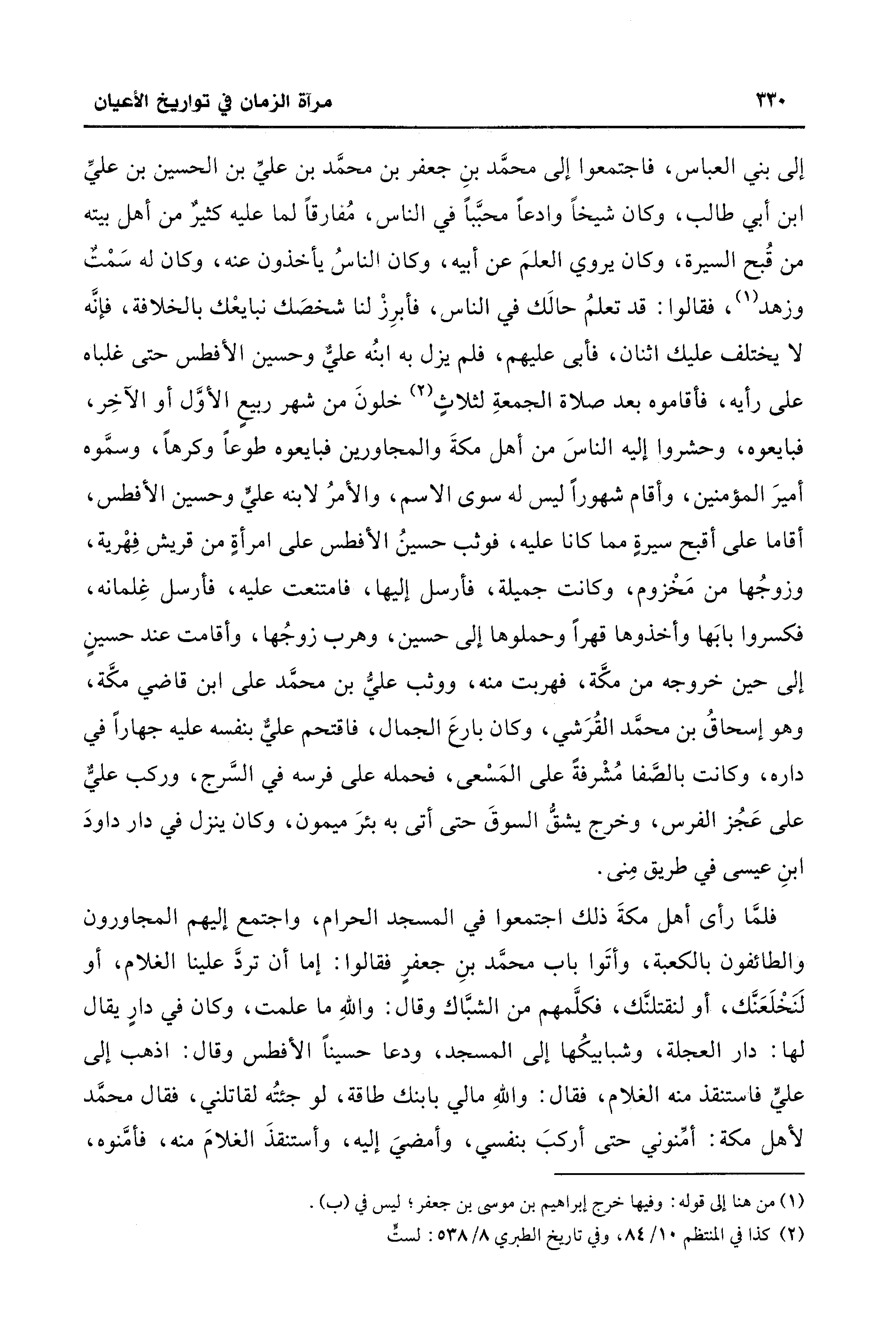 إلى بني العباس، فاجتمعوا إلى محمَّد بنِ جعفر بن محمَّد بن عليّ بن الحسين بن عليِّ بن أبي طالب، وكان شيخَا وادعًا محبَّبًا في الناس، مُفارقًا لما عليه كثير من أهل بيته من قُبح السيرة، وكان يروي العلمَ عن أبيه، وكان الناسُ يأخذون عنه، وكان له سَمت وزهد (¬1)، فقالوا: قد تعلمُ حالك في الناس، فأبرِزْ لنا شخصَك نبايعْك بالخلافة، فإنَّه لا يختلف عليك اثنان، فأبى عليهم، فلم يزل به ابنُه عليٌّ وحسين الأفطس حتى غلباه على رأيه، فأقاموه بعد صلاة الجمعةِ لثلاثٍ (¬2) خلونَ من شهر ربيع الأوَّل أو الآخِر، فبايعوه، وحشروا إليه الناسَ من أهل مكةَ والمجاورين فبايعوه طوعًا وكرهًا، وسمَّوه أميرَ المؤمنين، وأقام شهورًا ليس له سوى الاسم، والأمرُ لابنه عليٍّ وحسين الأفطس، أقاما على أقبح سيرةٍ مما كانا عليه، فوثب حسينُ الأفطس على امرأةٍ من قريش فِهْرية، وزوجُها من مَخْزوم، وكانت جميلة، فأرسل إليها، فامتنعت عليه، فأرسل غِلمانه، فكسروا بابَها وأخذوها قهرًا وحملوها إلى حسين، وهرب زوجُها، وأقامت عند حسينٍ إلى حين خروجه من مكَّة، فهربت منه، ووثب عليُّ بن محمَّد على ابن قاضي مكَّة، وهو إسحاقُ بن محمد القُرَشي، وكان بارعَ الجمال، فاقتحم عليّ بنفسه عليه جهارًا في داره، وكانت بالصَّفا مُشْرفةً على المَسْعى، فحمله على فرسه في السَّرج، وركب عليّ على عَجُز الفرس، وخرج يشقُّ السوقَ حتى أتى به بئرَ ميمون، وكان ينزل في دار داودَ بنِ عيسى في طريق مِنى.