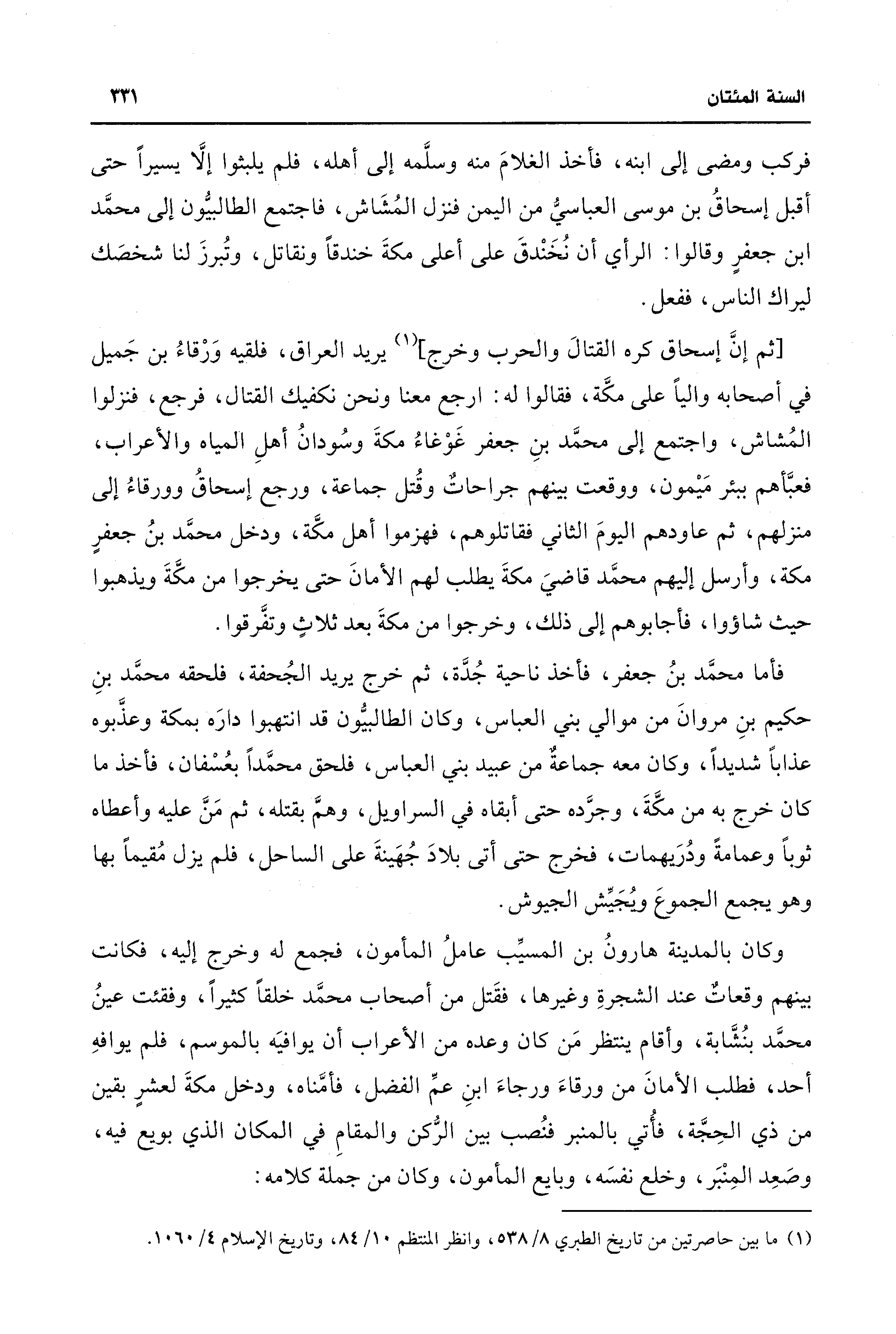 وكان بالمدينة هارونُ بن المسيِّب عاملُ المأمون، فجمع له وخرج إليه، فكانت بينهم وقعاتٌ عند الشجرةِ وغيرها، فقَتل من أصحاب محمَّد خلقًا كثيرًا، وفقئت عينُ محمَّد بنُشَّابة، وأقام ينتظر مَن كان وعده من الأعراب أن يوافيَه بالموسم، فلم يوافهِ أحد، فطلب الأمانَ من ورقاءَ ورجاءَ ابنِ عمِّ الفضل، فأمَّناه، ودخل مكةَ لعشرٍ بقين من ذي الحِجَّة، فأُتي بالمنبر فنُصب بين الرُّكن والمقامِ في المكان الذي بويع فيه، وصَعِد المِنْبَر، وخلع نفسَه، وبايع المأمون، وكان من جملة كلامه: