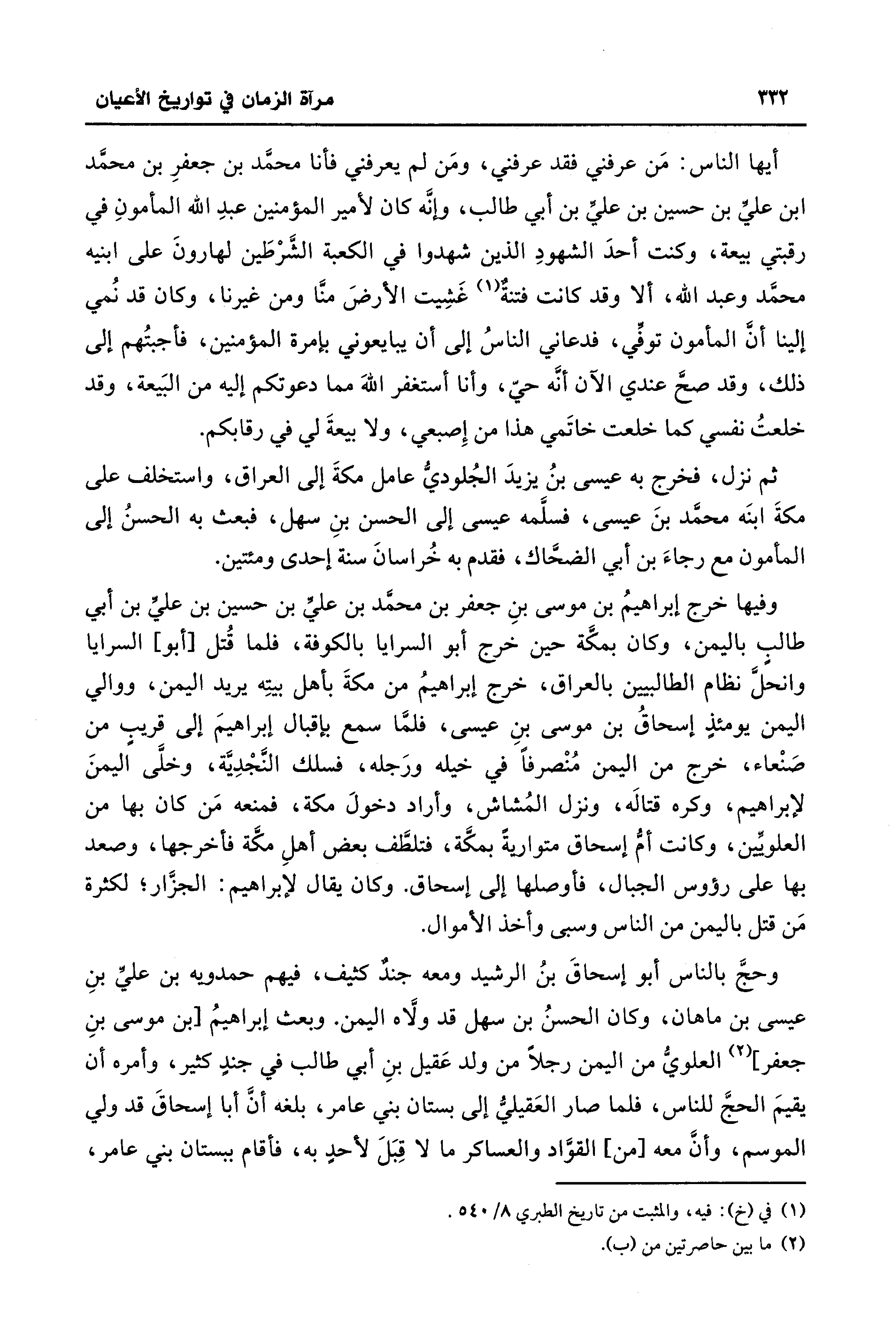 أيها الناس: مَن عرفني فقد عرفني، ومَن لم يعرفني فأنا محمَّد بن جعفرِ بن محمَّد بن عليِّ بن حسين بن عليِّ بن أبي طالب، وإنَّه كان لأمير المؤمنين عبدِ الله المأمونِ في رقبتي بيعة، وكنت أحدَ الشهودِ الذين شهدوا في الكعبة الشَّرْطَين لهارونَ على ابنيه محمَّد وعبد الله، ألا وقد كانت فتنةٌ (¬1) غَشِيت الأرضَ منَّا ومن غيرنا، وكان قد نُمي إلينا أنَّ المأمون توفِّي، فدعاني الناسُ إلى أن يبايعوني بإمرة المؤمنين، فأجبتُهم إلى ذلك، وقد صحَّ عندي الآن أنَّه حيّ، وأنا أستغفر الله مما دعوتكم إليه من البَيعة، وقد خلعتُ نفسي كما خلعت خاتَمي هذا من إِصبعي، ولا بيعةَ لي في رقابكم.