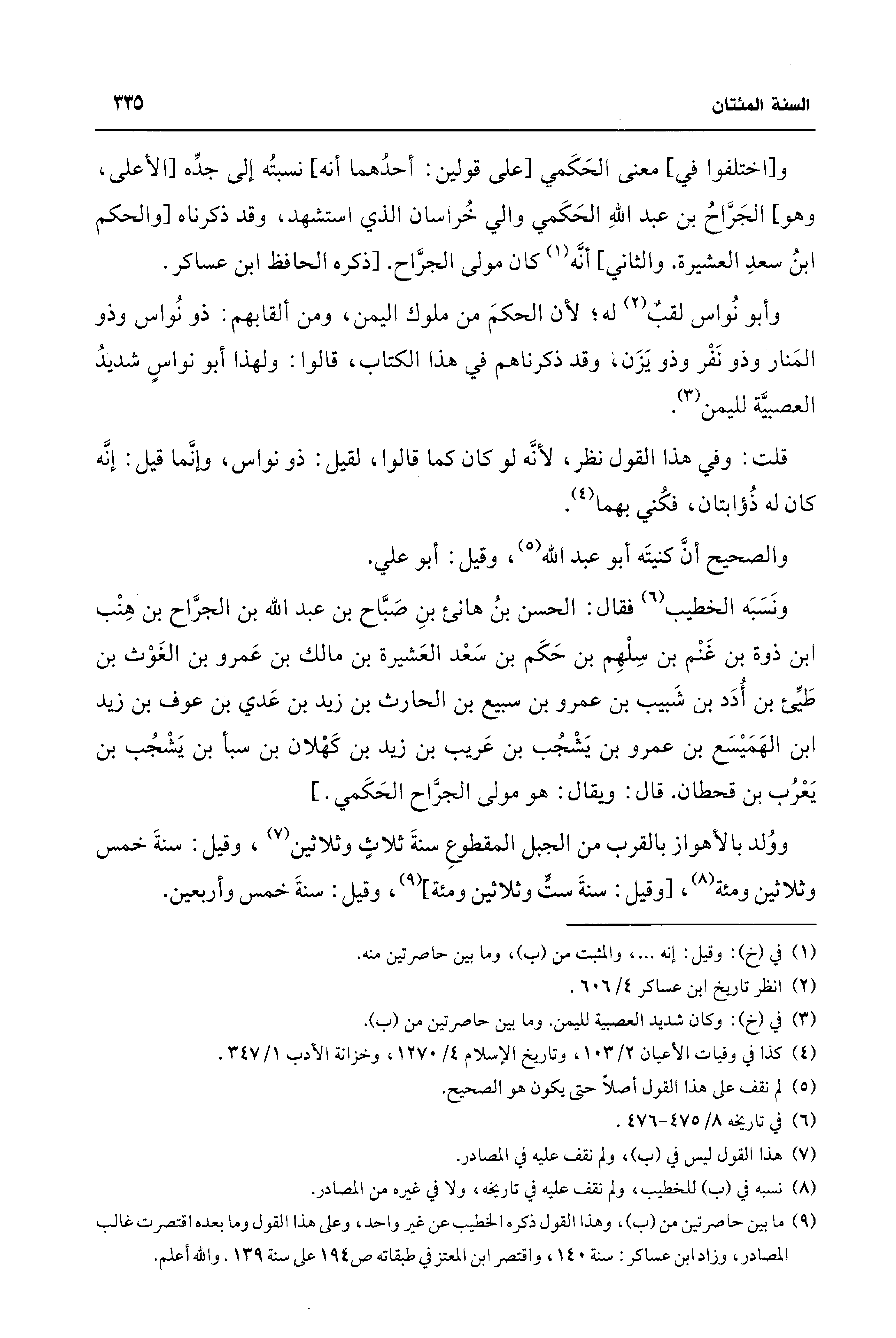 و [اختلفوا في] معنى الحَكَمي [على قولين: أحدُهما أنه] نسبتُه إلى جدِّه [الأعلى، وهو] الجَرَّاحُ بن عبد اللهِ الحَكَمي والي خُراسان الذي استشهد، وقد ذكَرناه [والحكم بنُ سعدِ العشيرة. والثاني] أنَّه (¬1) كان مولى الجرَّاح. [ذكره الحافظ ابن عساكر.