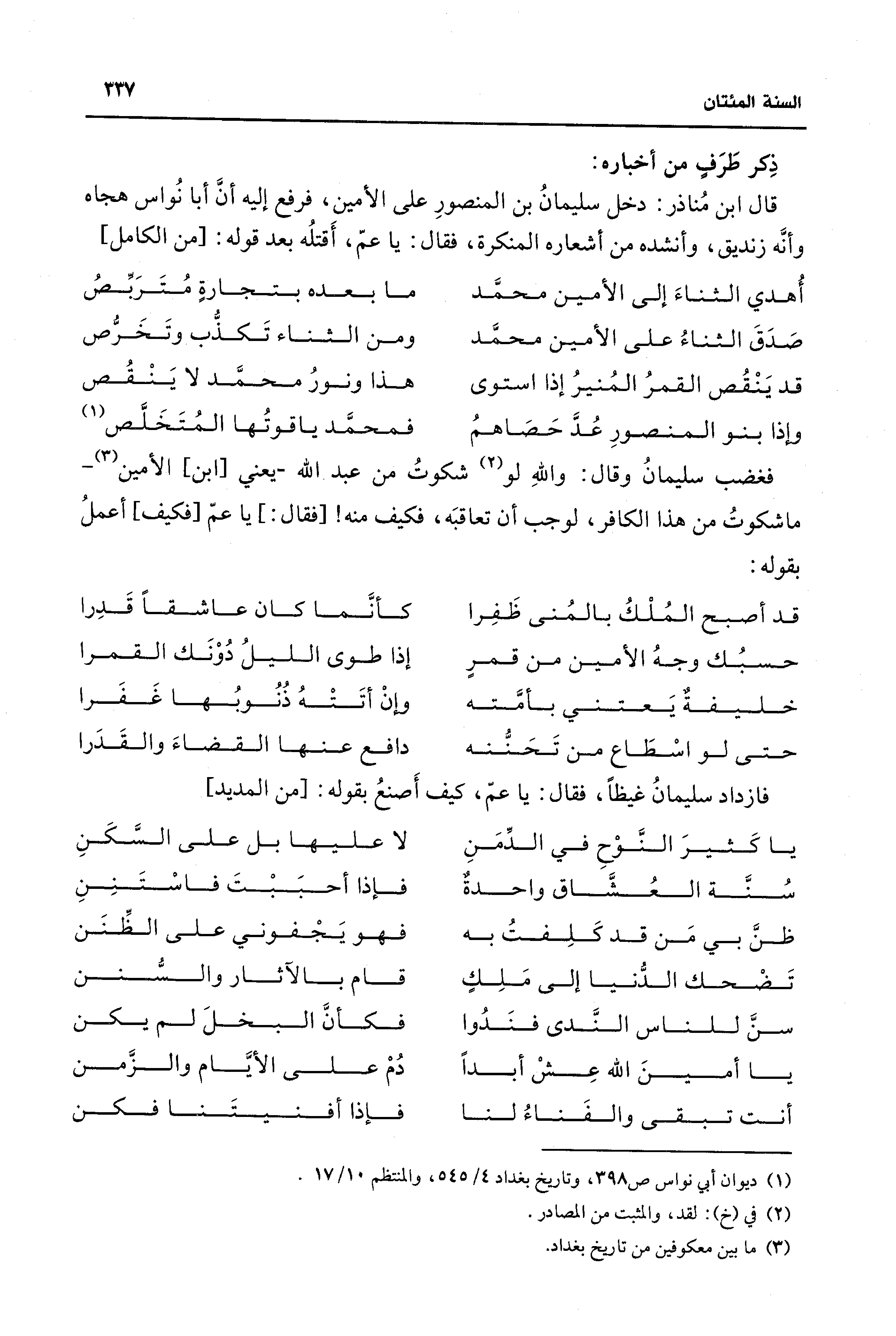 قال ابن مُناذر: دخل سليمانُ بن المنصورِ على الأمين، فرفع إليه أن أبا نُواس هجاه وأنَّه زنديق، وأنشده من أشعاره المنكرة، فقال: يا عمّ، أَقتلُه بعد قوله: [من الكامل]
