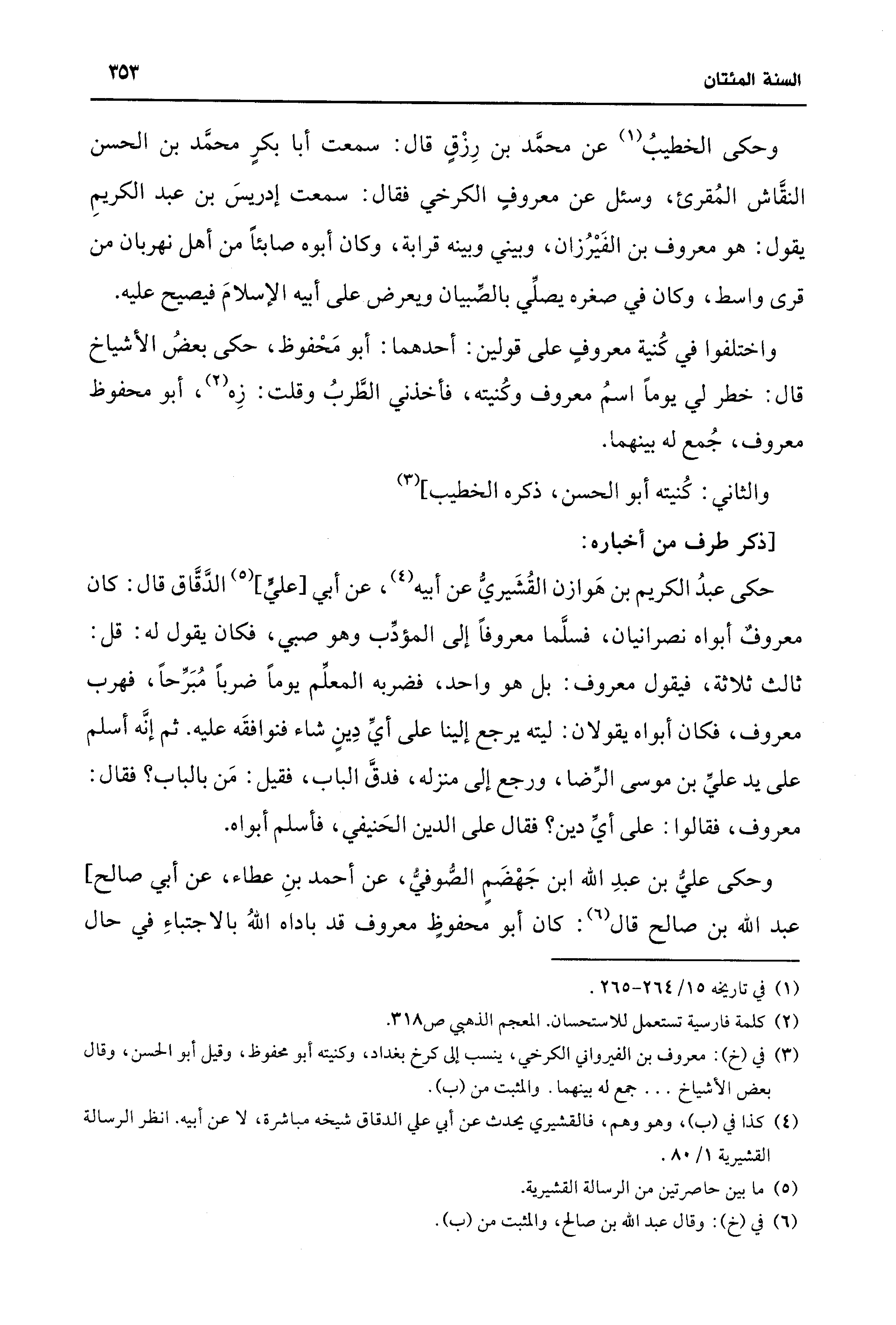 (¬3) في (خ): معروف بن الفيرواني الكرخي، ينسب إلى كرخ بغداد، وكنيته أبو محفوظ، وقيل أبو الحسن، وقال بعض الأشياخ ... جمع له بينهما. والمثبت من (ب).