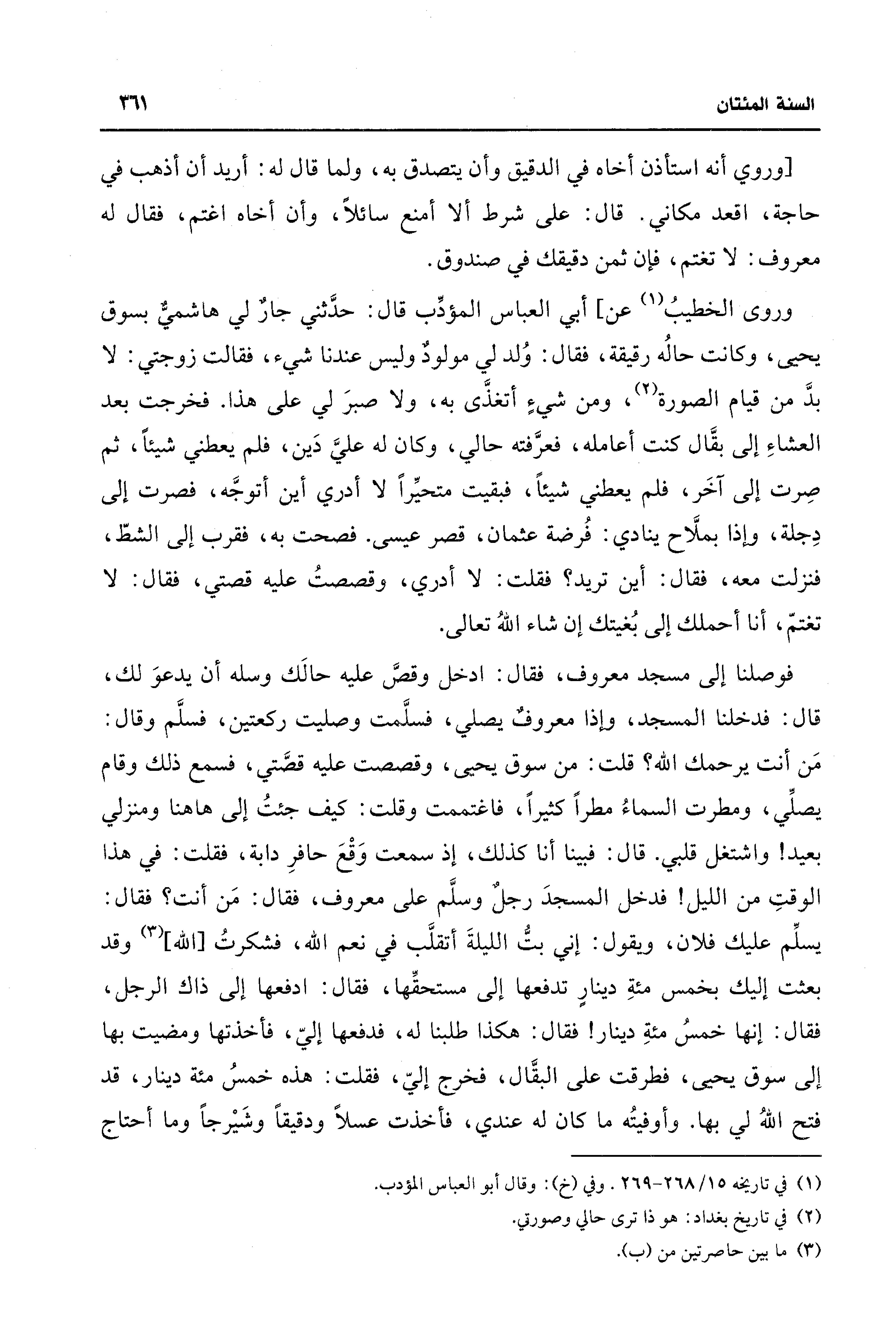 فوصلنا إلى مسجد معروف، فقال: ادخل وقصَّ عليه حالك وسله أن يدعوَ لك، قال: فدخلنا المسجد، وإذا معروفٌ يصلي، فسلَّمت وصليت ركعتين، فسلَّم وقال: مَن أنت يرحمك الله؟ قلت: من سوق يحيى، وقصصت عليه قصَّتي، فسمع ذلك وقام يصلِّي، ومطرت السماءُ مطرًا كثيرًا، فاغتممت وقلت: كيف جئتُ إلى هاهنا ومنزلي بعيد! واشتغل قلبي. قال: فبينا أنا كذلك، إذ سمعت وَقْعَ حافرِ دابة، فقلت: في هذا الوقتِ من الليل! فدخل المسجدَ رجل وسلَّم على معروف، فقال: مَن أنت؟ فقال: يسلِّم عليك فلان، ويقول: إني بتُّ الليلةَ أتقلَّب في نعم الله، فشكرتُ [الله] (¬3) وقد بعثت إليك بخمس مئةِ دينارٍ تدفعها إلى مستحقِّها، فقال: ادفعها إلى ذاك الرجل، فقال: إنها خمسُ مئةِ دينار! فقال: هكذا طلبنا له، فدفعها إليّ، فأخذتها ومضيت بها إلى سوق يحيى، فطرقت على البقَّال، فخرج إليّ، فقلت: هذه خمسُ مئة دينار، قد فتح اللهُ لي بها. وأوفيتُه ما كان له عندي، فأخذت عسلًا ودقيقًا وشَيرجًا وما أحتاج
