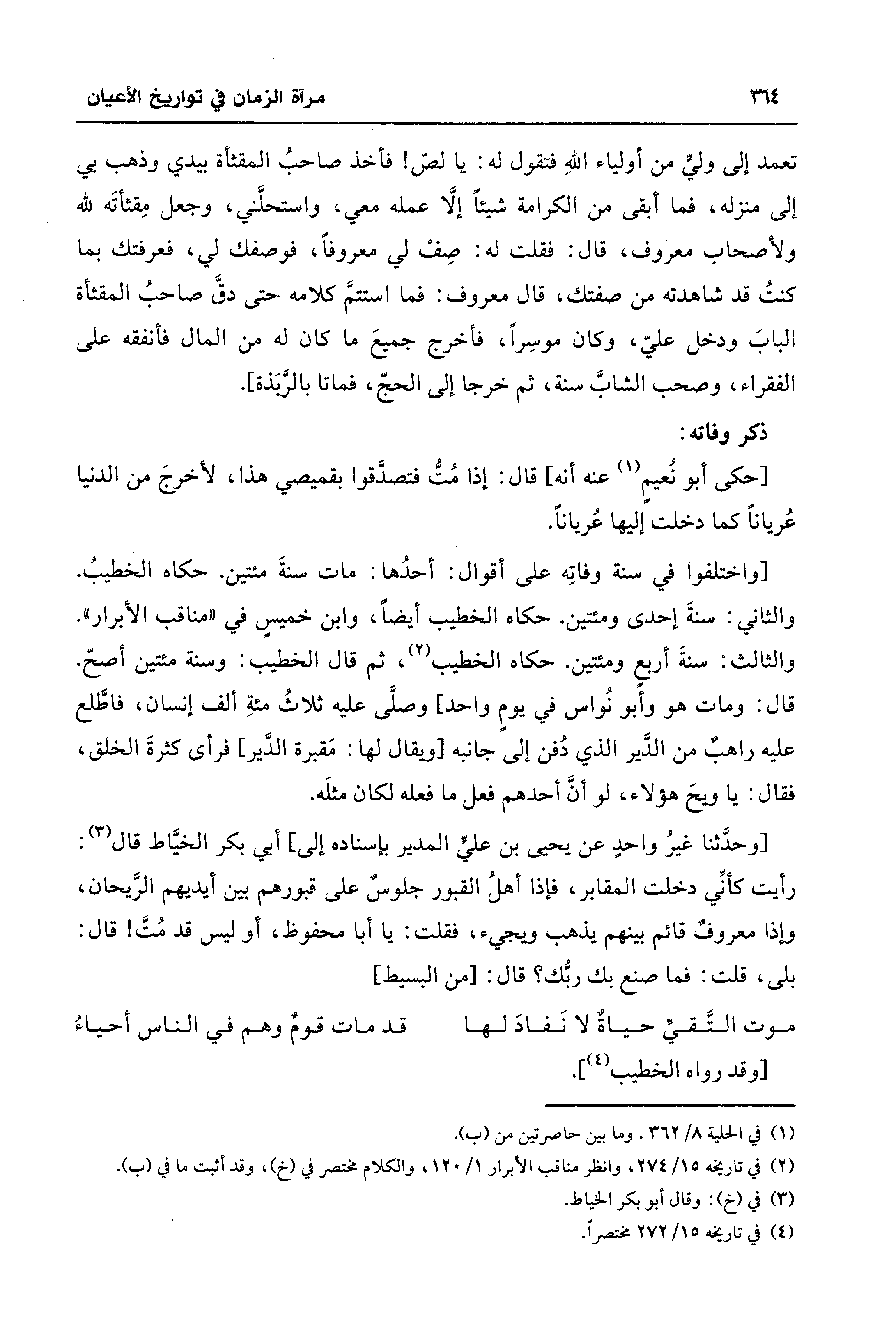 تعمد إلى وليٍّ من أولياء الله فتقول له: يا لصّ! فأخذ صاحبُ المقثأة بيدي وذهب بي إلى منزله، فما أبقى من الكرامة شيئًا إلَّا عمله معي، واستحلَّني، وجعل مِقثأتَه لله ولأصحاب معروف، قال: فقلت له: صِفْ لي معروفًا، فوصفك لي، فعرفتك بما كنتُ قد شاهدته من صفتك، قال معروف: فما استتمَّ كلامه حتى دقَّ صاحبُ المقثأة البابَ ودخل علي، وكان موسِرًا، فأخرج جميعَ ما كان له من المال فأنفقه على الفقراء، وصحب الشابَّ سنة، ثم خرجا إلى الحجّ، فماتا بالرَّبَذة].