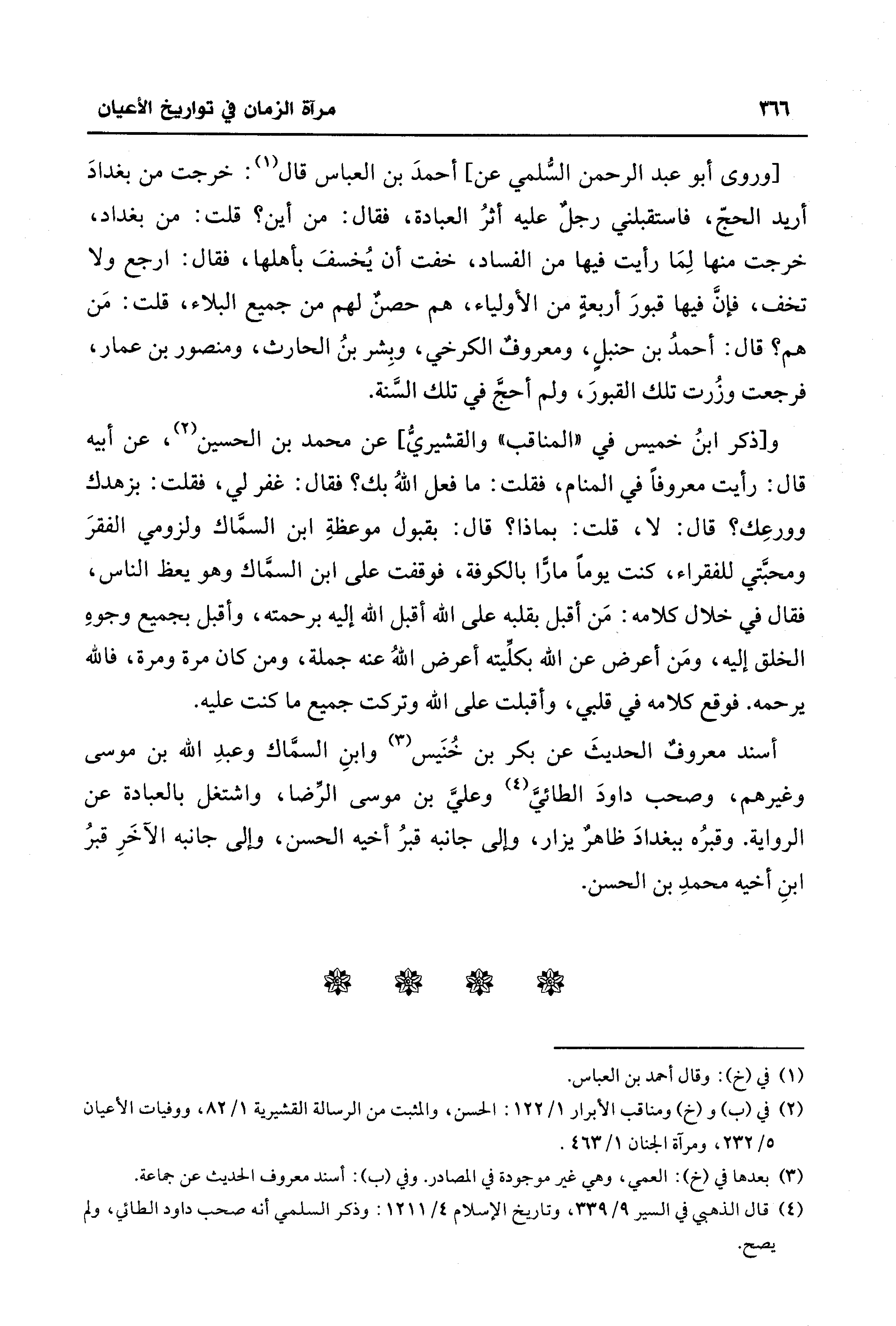 [وروى أبو عبد الرحمن السُّلمي عن] أحمدَ بن العباس قال (¬1): خرجت من بغدادَ أريد الحجّ، فاستقبلني رجلٌ عليه أثرُ العبادة، فقال: من أين؟ قلت: من بغداد، خرجت منها لِمَا رأيت فيها من الفساد، خفت أن يُخسفَ باهلها، فقال: ارجع ولا تخف، فإنَّ فيها قبورَ أربعةٍ من الأولياء، هم حصنٌ لهم من جميع البلاء، قلت: مَن هم؟ قال: أحمدُ بن حنبل، ومعروفٌ الكرخي، وبِشر بنُ الحارث، ومنصور بن عمار، فرجعت وزُرت تلك القبورَ، ولم أحجَّ في تلك السَّنة.