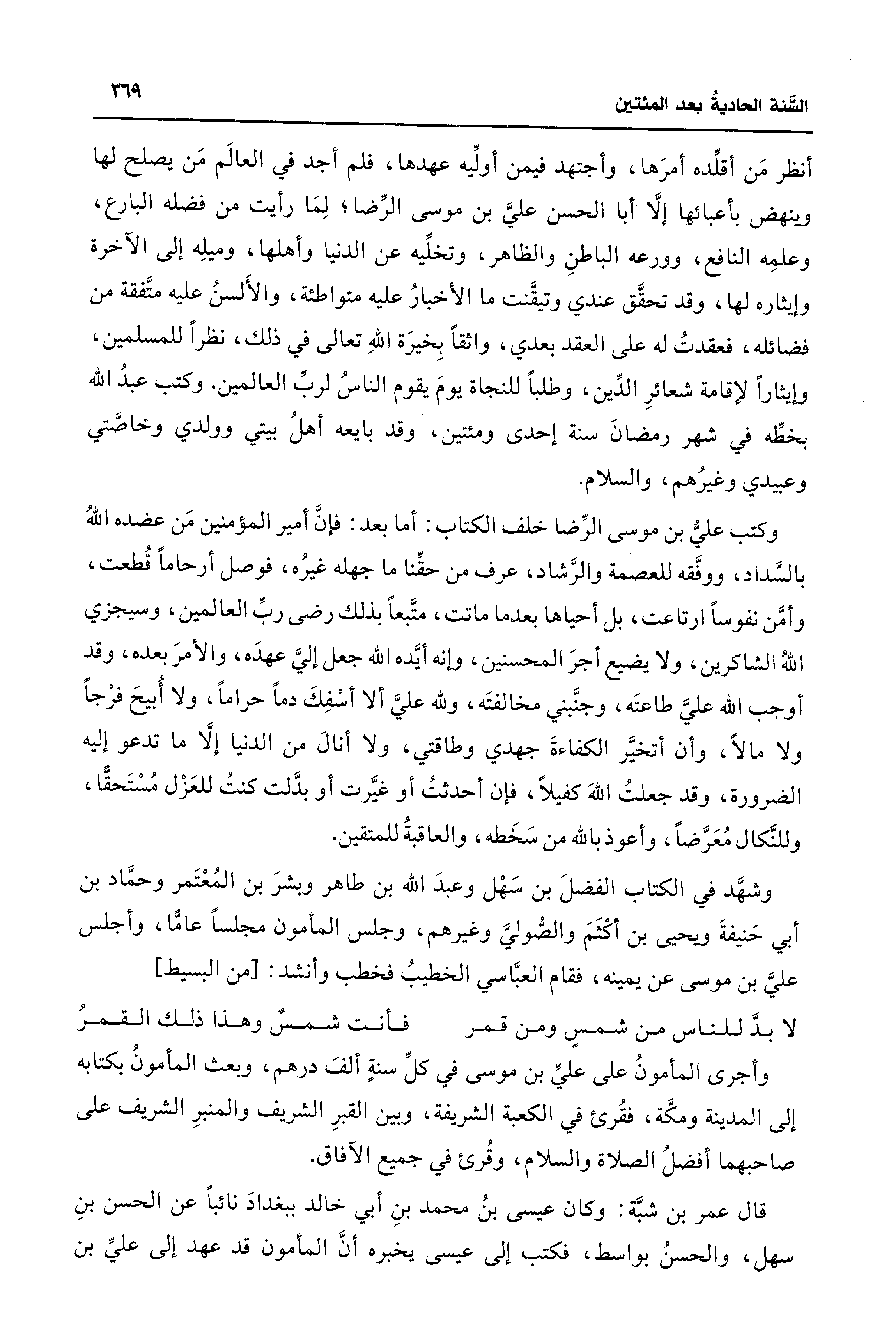 أنظر مَن أقلِّده أمرَها، وأجتهد فيمن أولِّيه عهدها، فلم أجد في العالم مَن يصلح لها وينهض بأعبائها إلَّا أبا الحسن عليَّ بن موسى الرِّضا، لِمَا رأيت من فضله البارع، وعلمِه النافع، وورعه الباطنِ والظاهر، وتخلِّيه عن الدنيا وأهلها، وميلِه إلى الآخرة وإيثاره لها، وقد تحقَّق عندي وتيقَّنت ما الأخبارُ عليه متواطئة، والأَلسنُ عليه متَّفقة من فضائله، فعقدتُ له على العقد بعدي، واثقًا بِخيرَة اللهِ تعالى في ذلك، نظرًا للمسلمين، وإيثارًا لإقامة شعائرِ الدِّين، وطلبًا للنجاة يومَ يقوم الناسُ لربِّ العالمين. وكتب عبدُ الله بخطِّه في شهر رمضانَ سنة إحدى ومئتين، وقد بايعه أهلُ بيتي وولدي وخاصَّتي وعبيدي وغيرُهم، والسلام.
