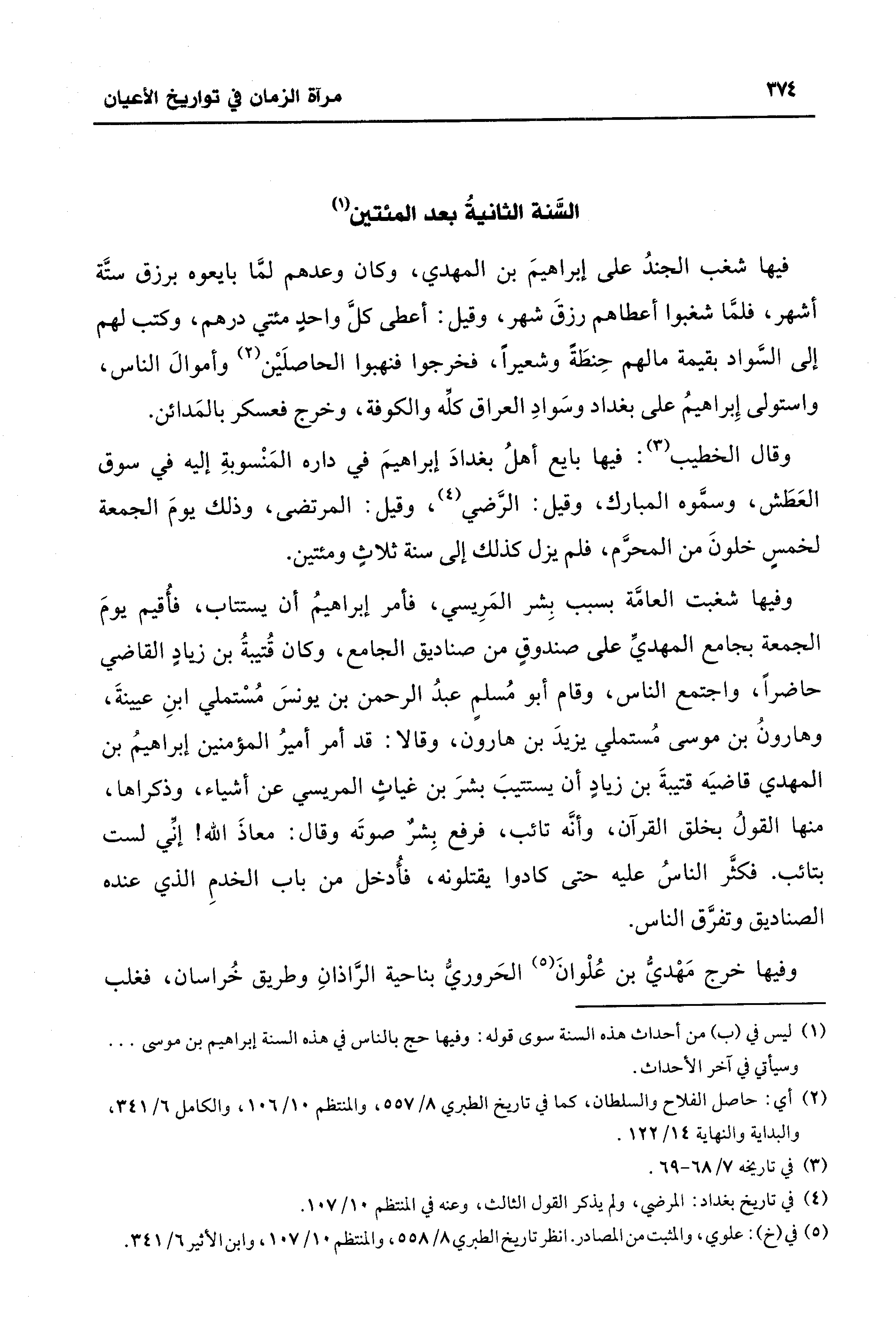 وفيها شغبت العامَّة بسبب بِشر المَرِيسي، فأمر إبراهيمُ أن يستتاب، فأُقيم يومَ الجمعة بجامع المهديِّ على صندوقٍ من صناديق الجامع، وكان قُتيبةُ بن زياب القاضي حاضرًا، واجتمع الناس، وقام أبو مُسلمٍ عبدُ الرحمن بن يونسَ مُسْتملي ابنِ عيينةَ، وهارونُ بن موسى مُستملي يزيدَ بن هارون، وقالا: قد أمر أميرُ المؤمنين إبراهيمُ بن المهدي قاضيطَه قتيبةَ بن زيادٍ أن يستتيبَ بشرَ بن غياثٍ المريسي عن أشياء، وذكراها، منها القولُ بخلق القرآن، وأنَّه تائب، فرفع بِشرٌ صوتَه وقال: معاذَ الله! إني لست بتائب. فكثَّر الناسُ عليه حتى كادوا يقتلونه، فأُدخل من باب الخدمِ الذي عنده الصناديق وتفرَّق الناس.