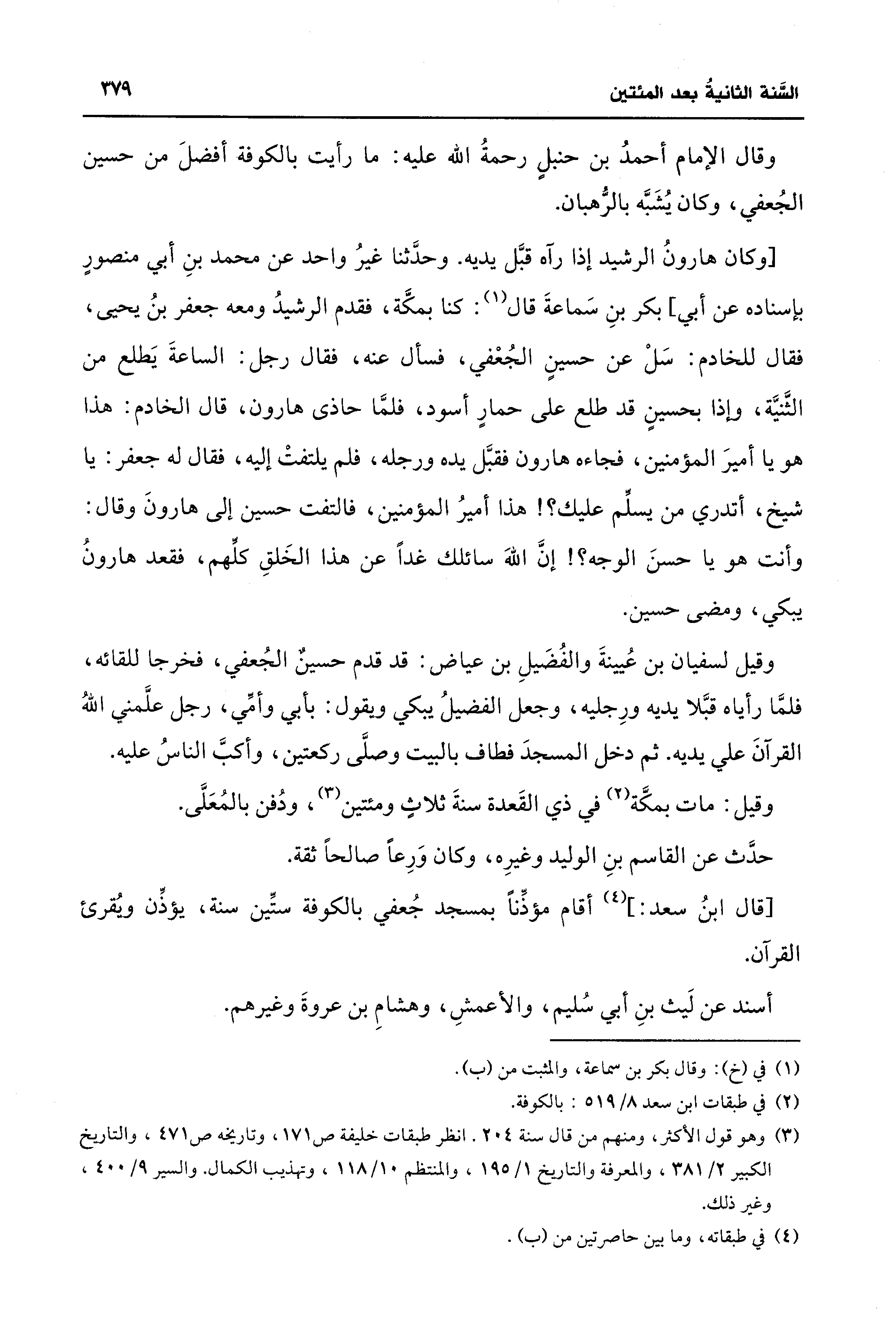 [وكان هارونُ الرشيد إذا رآه قبَّل يديه. وحدَّثنا غيرُ واحد عن محمد بنِ أبي منصورٍ بإسناده عن أبي] بكر بنِ سَماعةَ قال (¬1): كنا بمكَّة، فقدم الرشيدُ ومعه جعفر بنُ يحيى، فقال للخادم: سَلْ عن حسينٍ الجُعْفي، فسأل عنه، فقال رجل: الساعةَ يَطلع من الثَّنيَّة، وإذا بحسينٍ قد طلع على حمارٍ أسود، فلمَّا حاذى هارون، قال الخادم: هذا هو يا أميرَ المؤمنين، فجاءه هارون فقبَّل يده ورجله، فلم يلتفتْ إليه، فقال له جعفر: يا شيخ، أتدري من يسلِّم عليك؟ ! هذا أميرُ المؤمنين، فالتفت حسين إلى هارونَ وقال: وأنت هو يا حسنَ الوجه؟ ! إنَّ اللهَ سائلك غدًا عن هذا الخَلقِ كلِّهم، فقعد هارونُ يبكي، ومضى حسين.