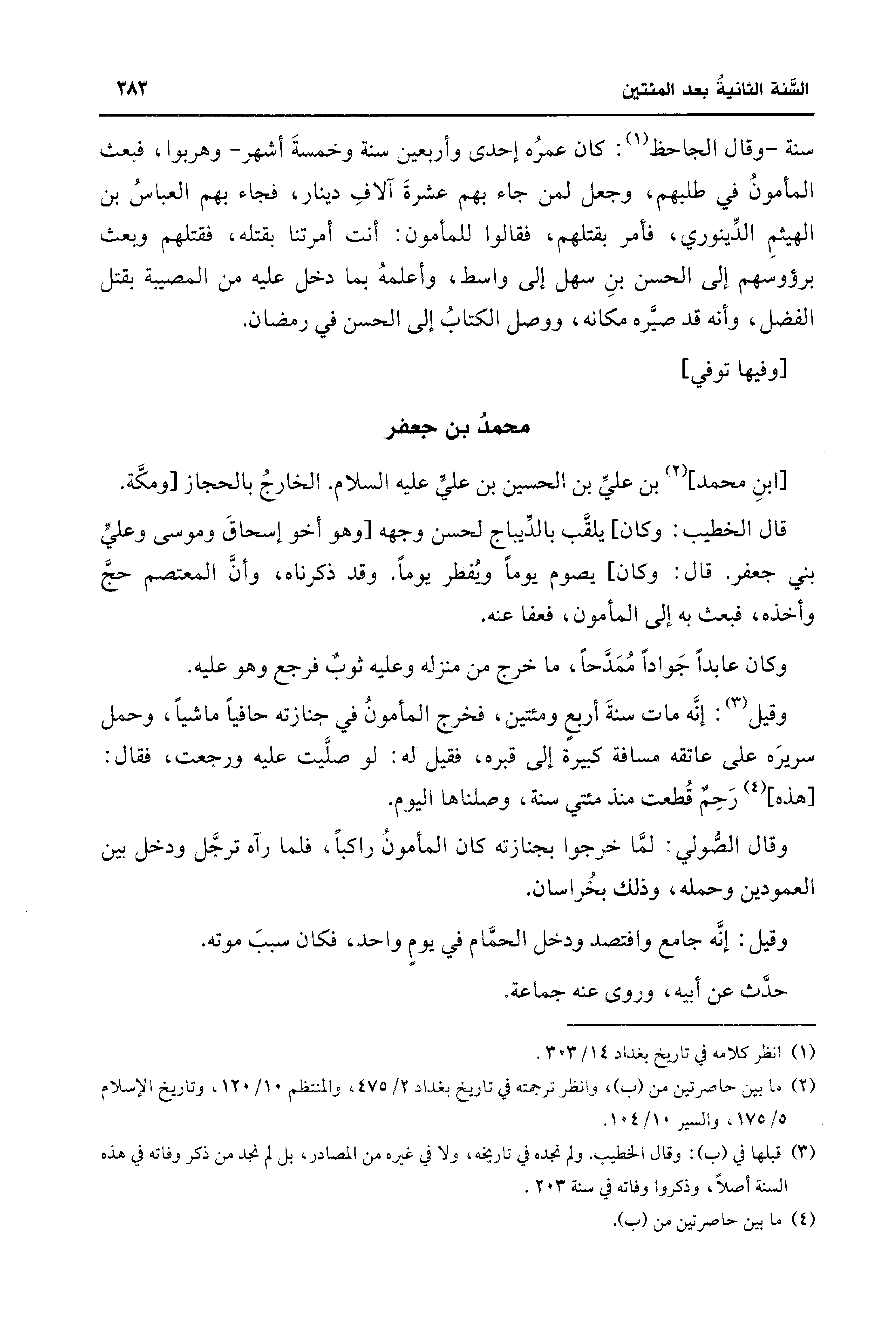 قال الخطيب: وكان] يلقَّب بالدِّيباج لحسن وجهه [وهو أخو إسحاقَ وموسى وعليٍّ بني جعفر. قال: وكان] يصوم يومًا ويُفطر يومًا. وقد ذكرناه، وأنَّ المعتصم حجَّ وأخذه، فبعث به إلى المأمون، فعفا عنه.