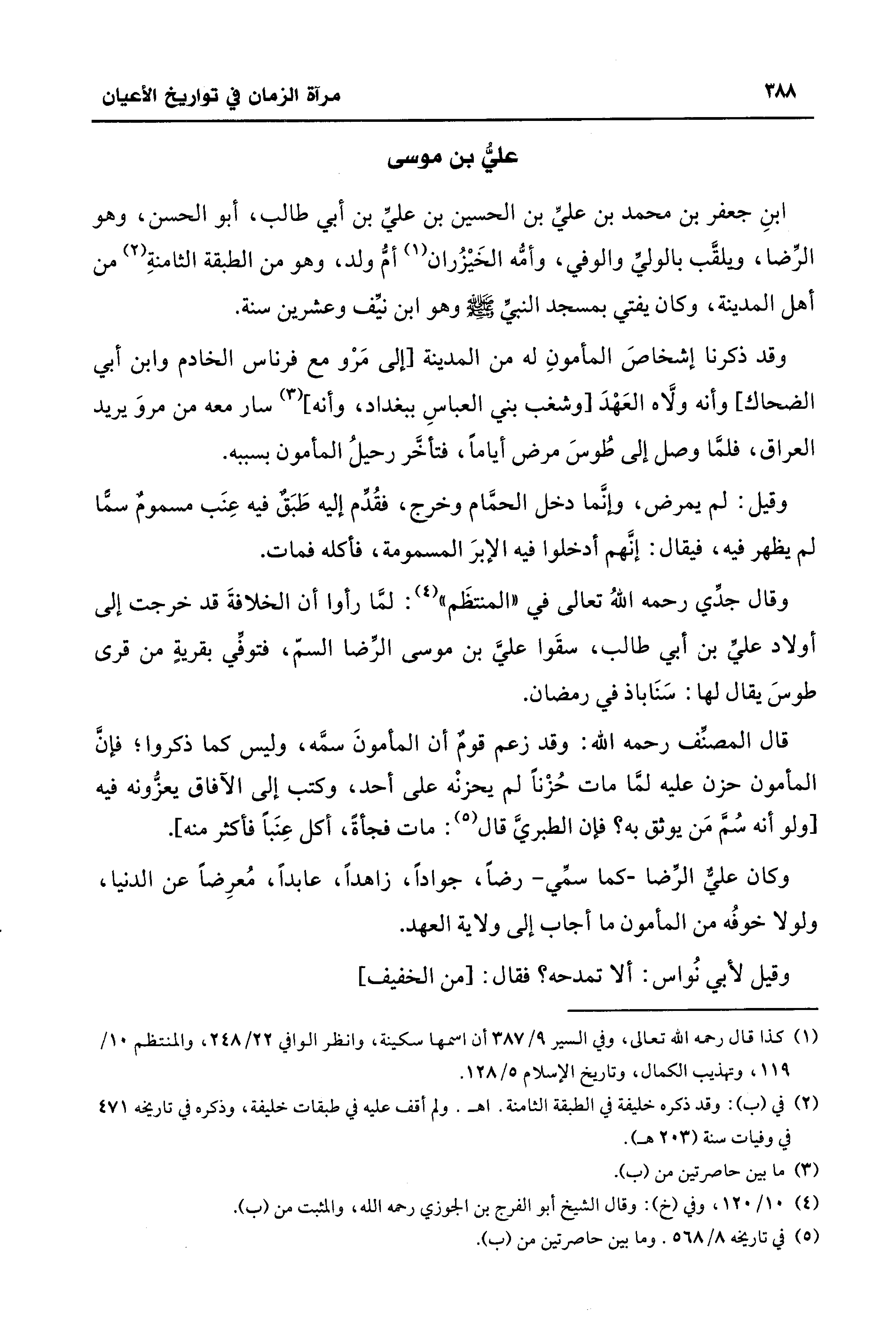 قال المصنِّف رحمه الله: وقد زعم قوم أن المأمونَ سمَّه، وليس كما ذكروا؛ فإنَّ المأمون حزن عليه لمَّا مات حُزْنًا لم يحزنْه على أحد، وكتب إلى الآفاق يعزُّونه فيه [ولو أنه سُمَّ مَن يوثق به؟ فإن الطبريَّ قال (¬5): مات فجأةً، أكل عِنَبًا فأكثر منه].
