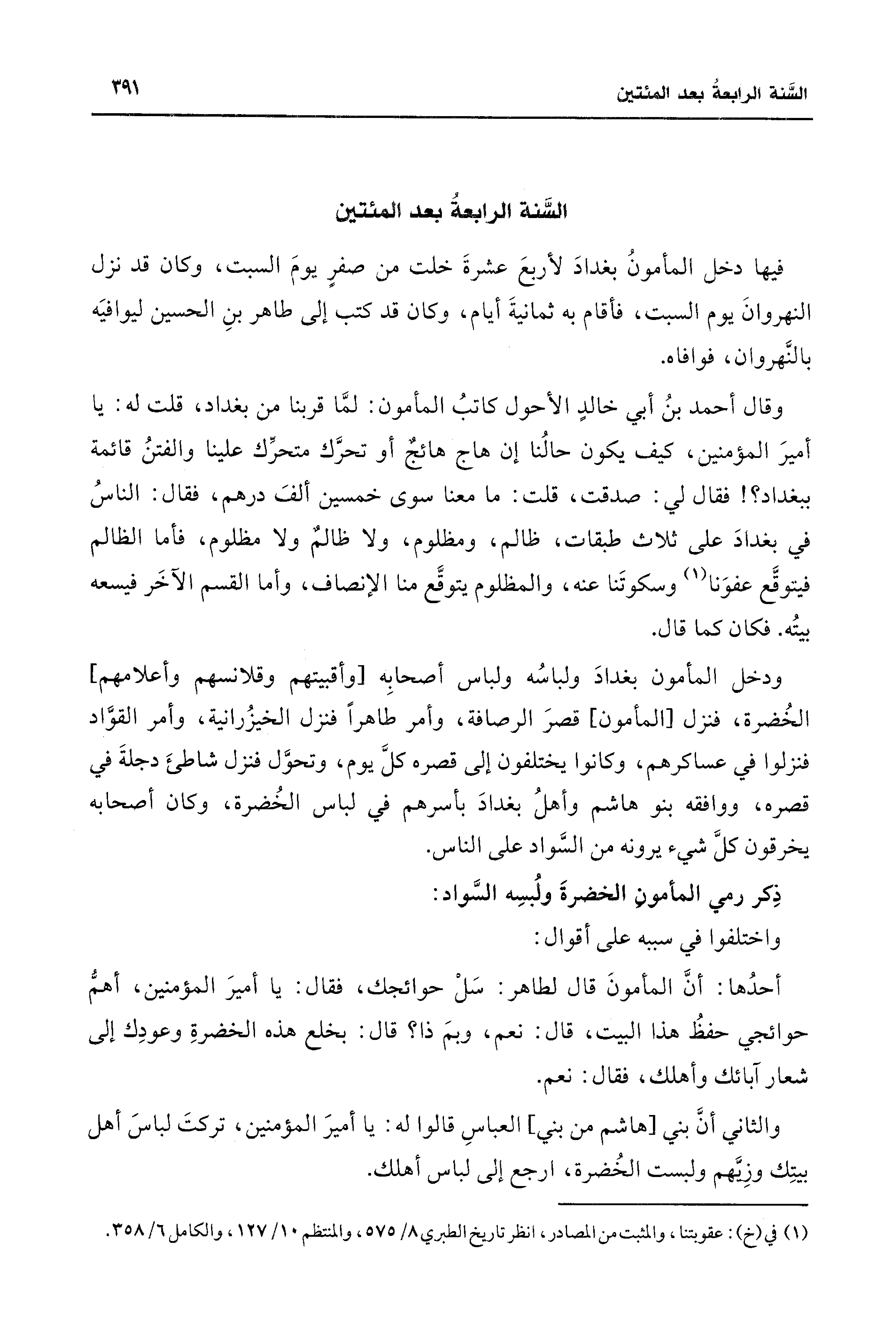ودخل المأمون بغدادَ ولباسُه ولباس أصحابِه [وأقبيتهم وقلانسهم وأعلامهم] الخُضرة، فنزل [المأمون] قصرَ الرصافة، وأمر طاهرًا فنزل الخيزُرانية، وأمر القوَّاد فنزلوا في عساكرهم، وكانوا يختلفون إلى قصره كلَّ يوم، وتحوَّل فنزل شاطئَ دجلةَ في قصره، ووافقه بنو هاشم وأهلُ بغدادَ بأسرهم فِي لباس الخُضرة، وكان أصحابه يخرقون كلَّ شيء يوونه من السَّواد على الناس.