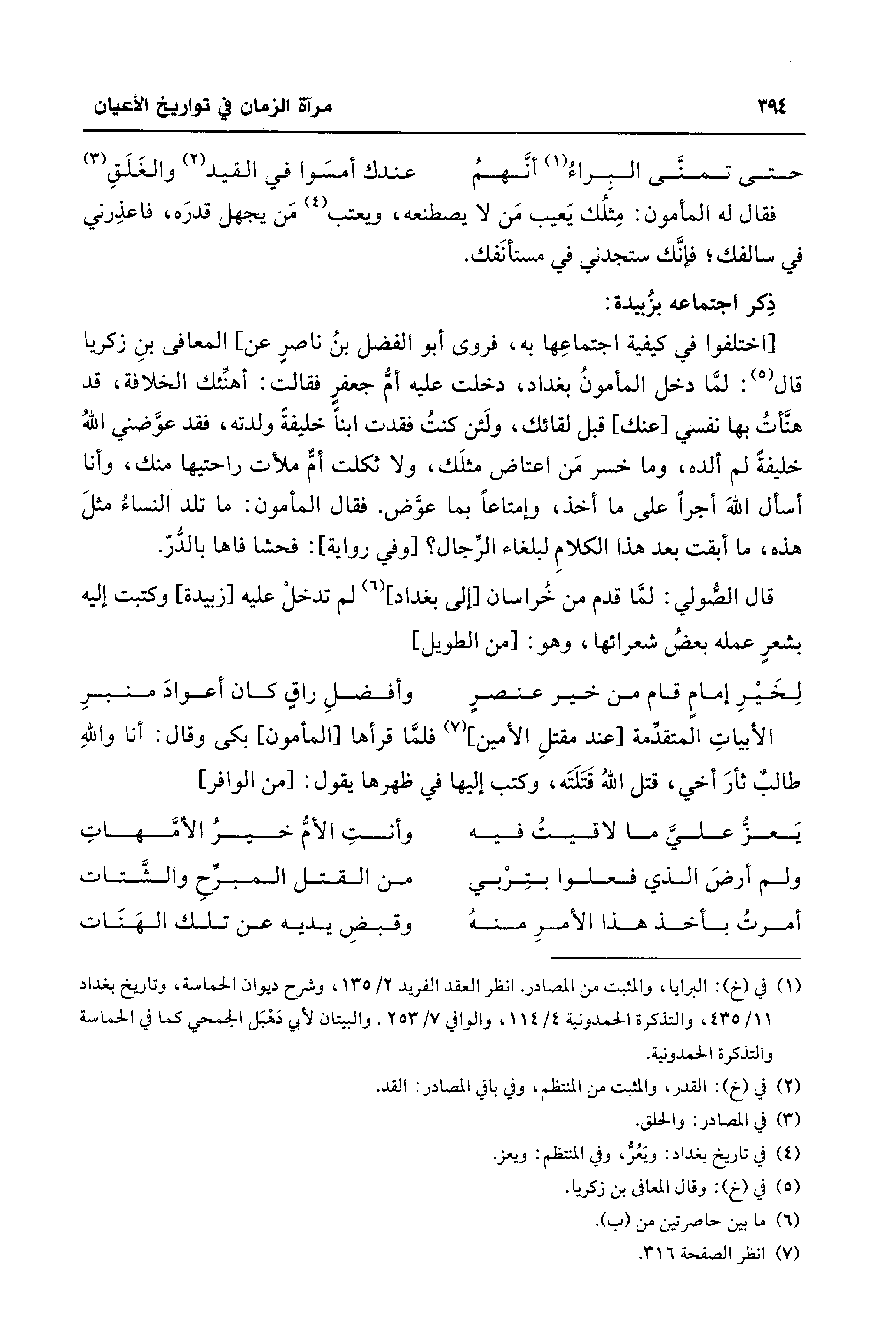 [اختلفوا في كيفية اجتماعِها به، فروى أبو الفضل بنُ ناصرٍ عن] المعافى بنِ زكريا قال (¬5): لمَّا دخل المأمونُ بغداد، دخلت عليه أمُّ جعفرٍ فقالت: أهنئك الخلافة، قد هنَّأتُ بها نفسي [عنك] قبل لقائك، ولَئن كنتُ فقدت ابنًا خليفةً ولدته، فقد عوَّضني اللهُ خليفةً لم ألده، وما خسر مَن اعتاض مثلَك، ولا ثكلت أمٌّ ملأت راحتيها منك، وأنا أسأل اللهَ أجرًا على ما أخذ، وإمتاعًا بما عوَّض. فقال المأمون: ما تلد النساءُ مثلَ هذه، ما أبقت بعد هذا الكلامِ لبلغاء الرِّجال؟ [وفي رواية]: فحشا فاها بالدُّرّ.