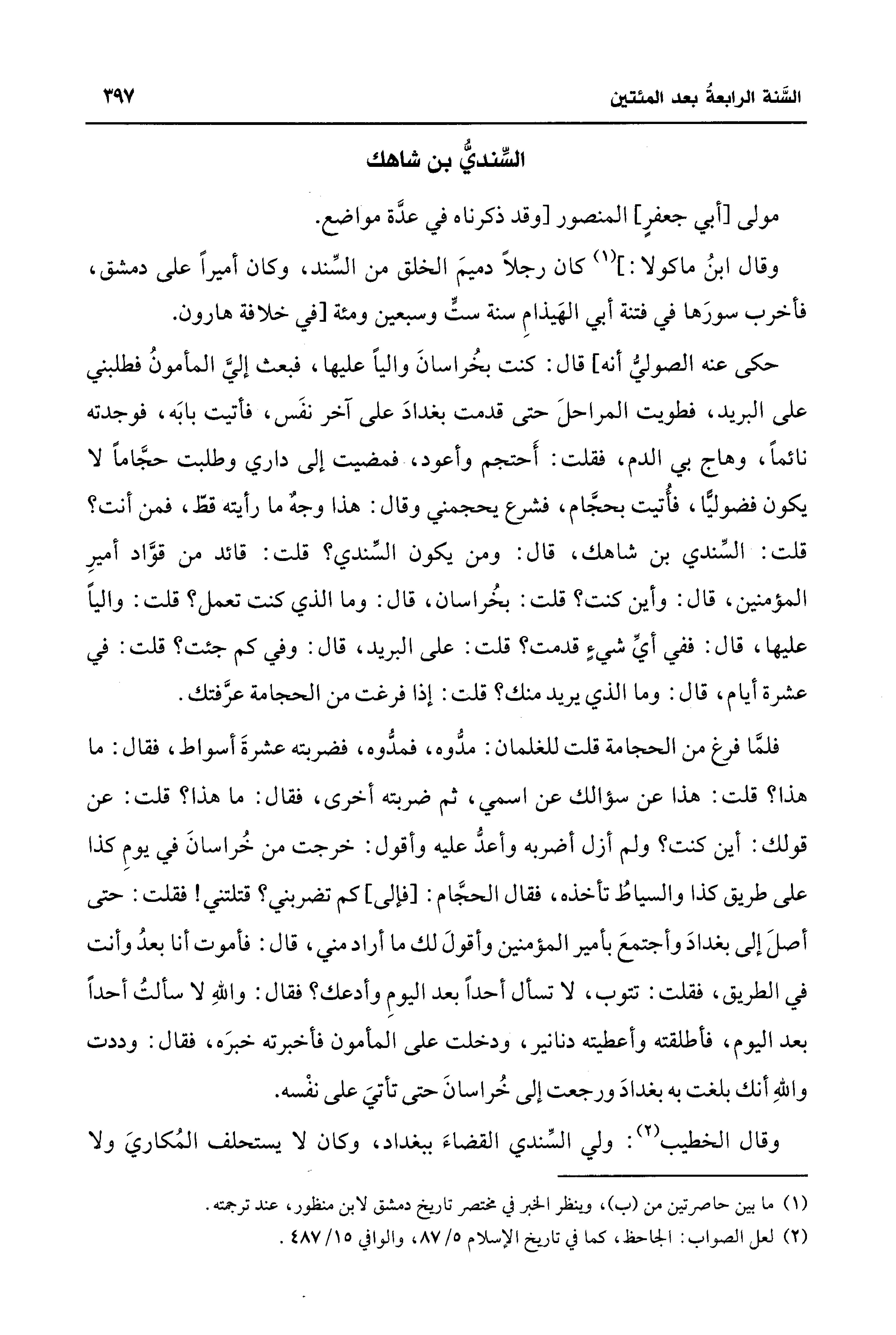 حكى عنه الصوليُّ أنه] قال: كنت بخُراسانَ واليًا عليها، فبعث إليَّ المأمونُ فطلبني على البريد، فطويت المراحلَ حتى قدمت بغدادَ على آخر نفَس، فأتيت بابَه، فوجدته نائمًا، وهاج بي الدم، فقلت: أَحتجم وأعود، فمضيت إلى داري وطلبت حجَّامًا لا يكون فضوليًّا، فأُتيت بحجَّام، فشرع يحجمني وقال: هذا وجهٌ ما رأيته قطّ، فمن أنت؟ قلت: السِّندي بن شاهك، قال: ومن يكون السِّندي؟ قلت: قائد من قوَّاد أميرِ المؤمنين، قال: وأين كنت؟ قلت: بخُراسان، قال: وما الذي كنت تعمل؟ قلت: واليًا عليها، قال: ففي أيِّ شيءٍ قدمت؟ قلت: على البريد، قال: وفي كم جئت؟ قلت: في عشرة أيام، قال: وما الذي يريد منك؟ قلت: إذا فرغت من الحجامة عرَّفتك.
