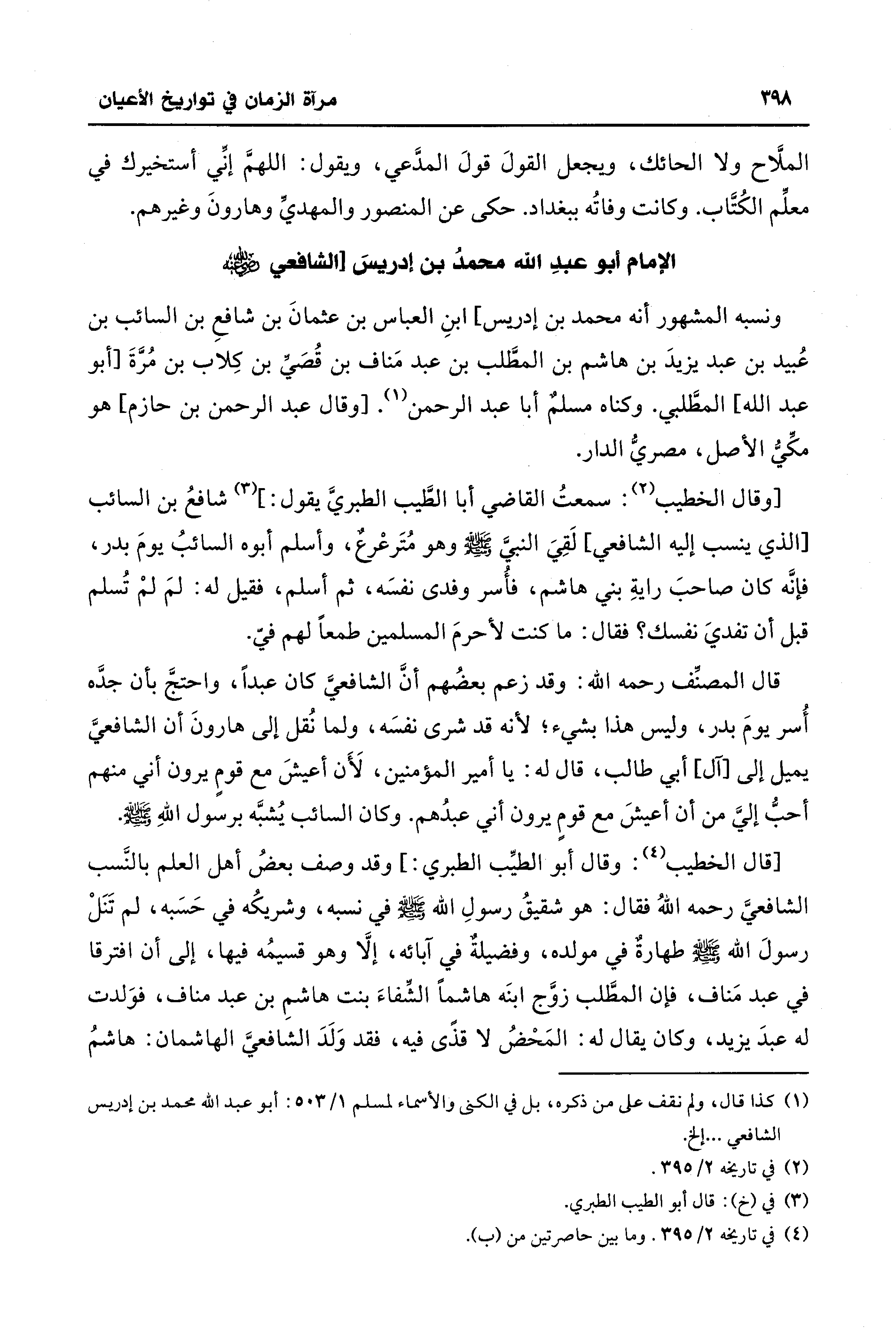 قال المصنِّف رحمه الله: وقد زعم بعضُهم أنَّ الشافعيَّ كان عبدًا، واحتجَّ بأن جدَّه أُسر يومَ بدر، وليس هذا بشيء؛ لأنه قد شرى نفسَه، ولما نُقل إلى هارونَ أن الشافعيَّ يميل إلى [آل] أبي طالب، قال له: يا أمير المؤمنين، لَأَن أعيشَ مع قومٍ يرون أني منهم أحبُّ إليَّ من أن أعيشَ مع قومٍ يرون أني عبدُهم. وكان السائب يُشبَّه برسول اللهِ - صلى الله عليه وسلم -.
