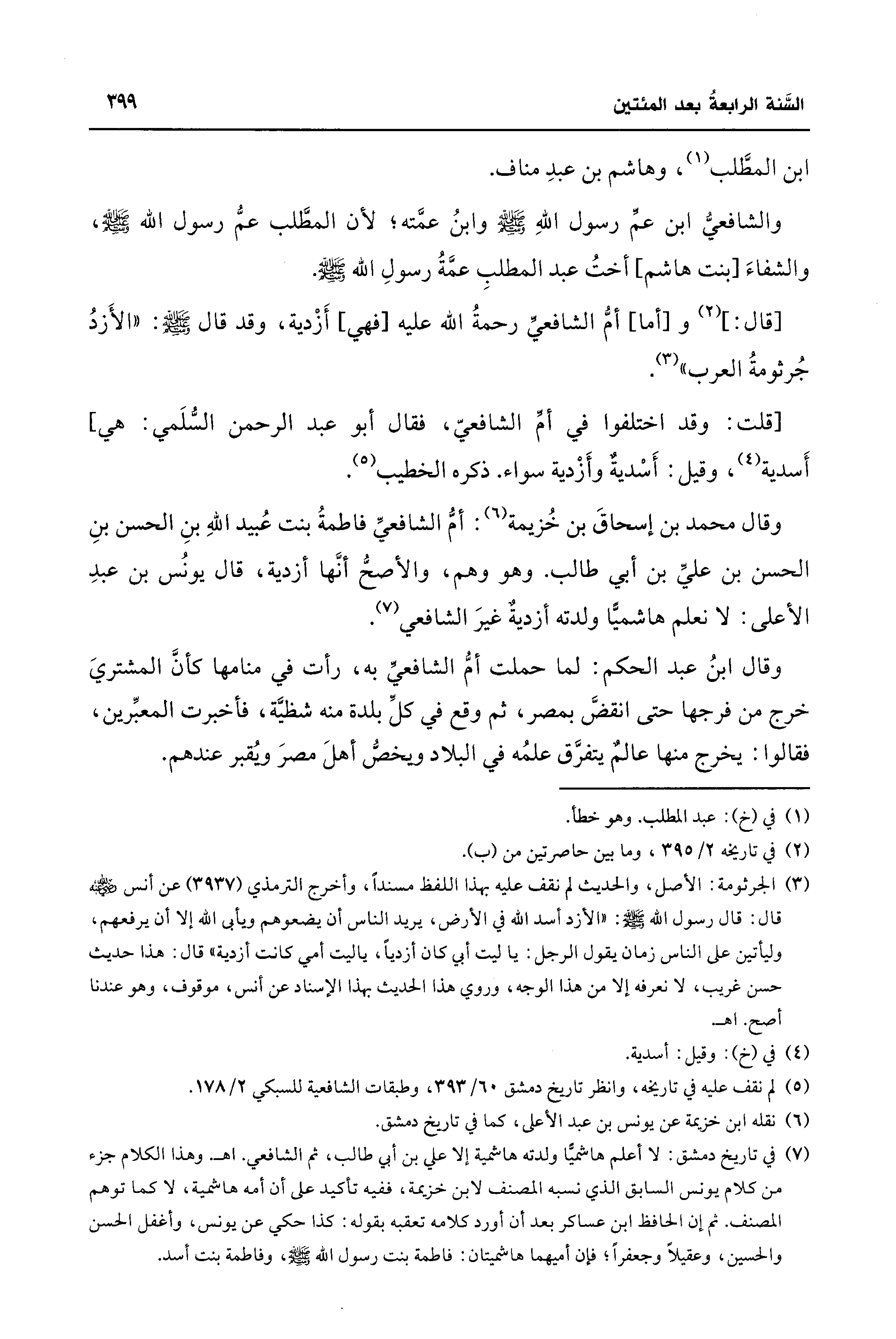 [قلت: وقد اختلفوا في أمِّ الشافعيّ، فقال أبو عبد الرحمن السُّلَمي: هي] أَسدية (¬4)، وقيل: أَسْديةٌ وأَزْدية سواء. ذكره الخطيب (¬5).