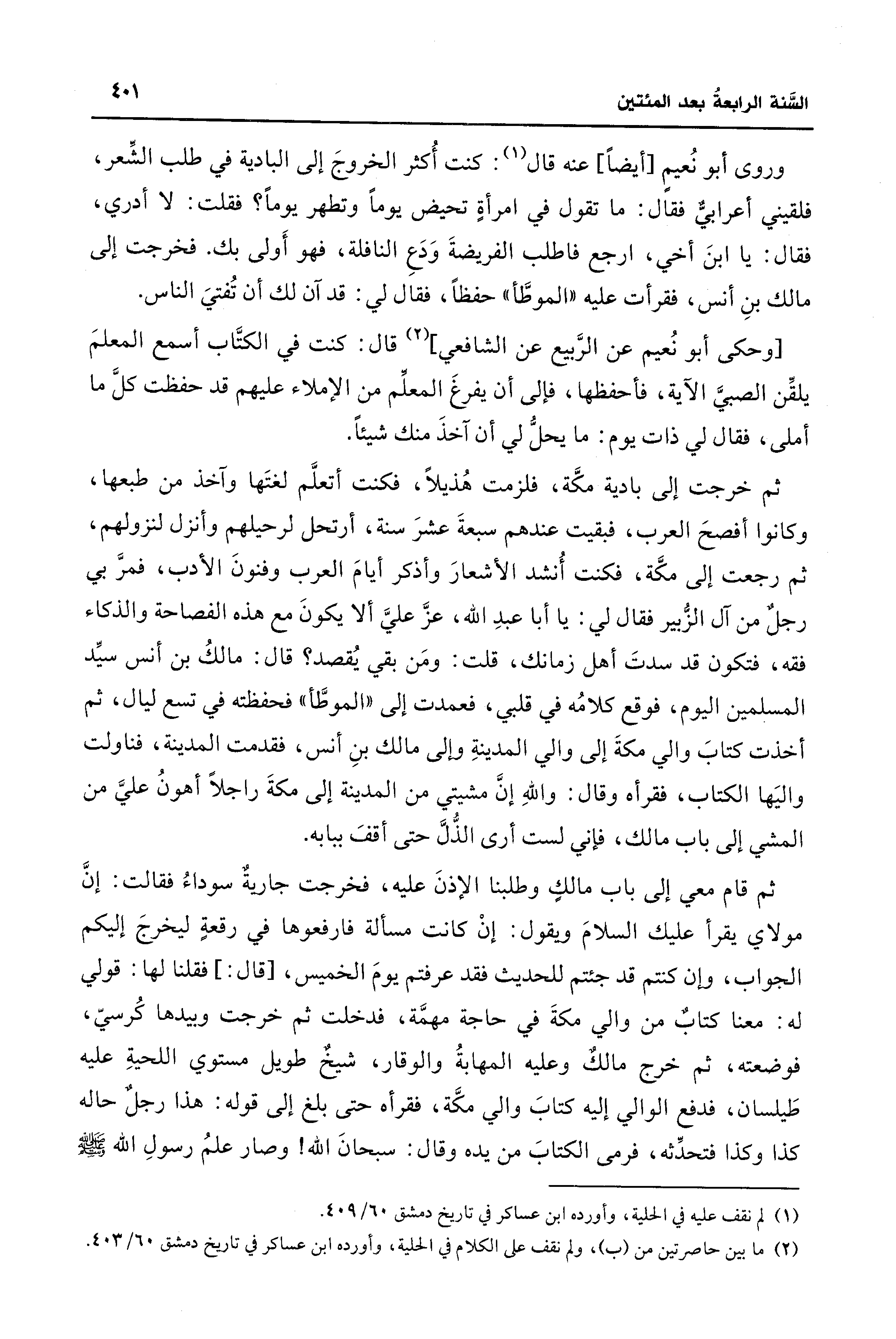 ثم خرجت إلى بادية مكَّة، فلزمت هُذيلًا، فكنت أتعلَّم لغتَها وآخذ من طبعها، وكانوا أفصحَ العرب، فبقيت عندهم سبعةَ عشرَ سنة، أرتحل لرحيلهم وأنزل لنزولهم، ثم رجعت إلى مكَّة، فكنت أُنشد الأشعارَ وأذكر أيامَ العرب وفنونَ الأدب، فمرَّ بي رجلٌ من آل الزُّبير فقال لي: يا أبا عبدِ الله، عزَّ عليَّ ألا يكونَ مع هذه الفصاحة والذكاء فقه، فتكون قد سدتَ أهل زمانك، قلت: ومَن بقي يُقصد؟ قال: مالكُ بن أنس سيِّد المسلمين اليوم، فوقع كلامُه في قلبي، فعمدت إلى "الموطَّأ" فحفظته في تسع ليال، ثم أخذت كتابَ والي مكةَ إلى والي المدينةِ وإلى مالك بنِ أنس، فقدمت المدينة، فناولت واليَها الكتاب، فقرأه وقال: واللهِ إنَّ مشيتي من المدينة إلى مكةَ راجلًا أهونُ عليَّ من المشي إلى باب مالك، فإني لست أرى الذُّلَّ حتى أقفَ ببابه.