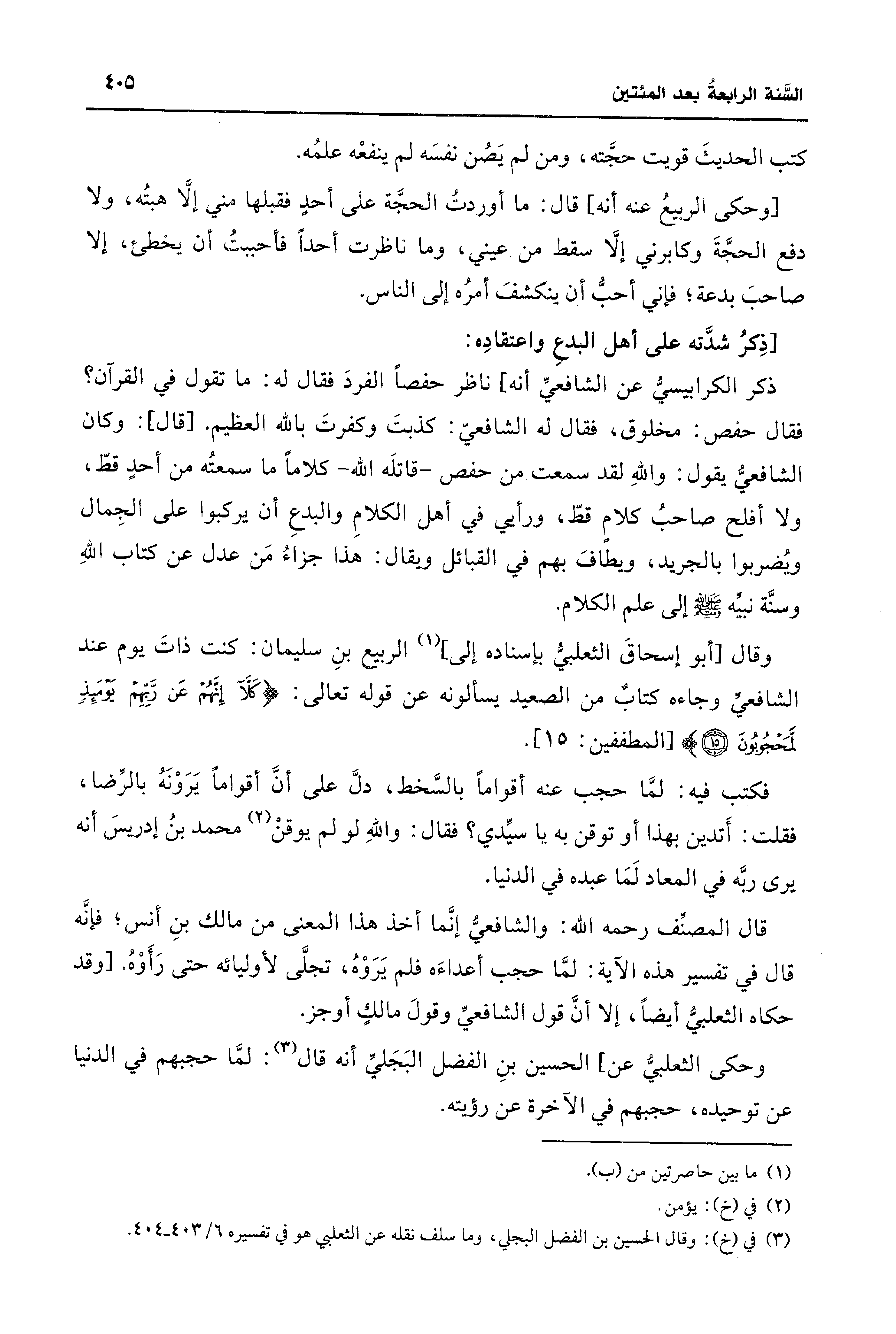 وقال [أبو إسحاقَ الثعلبيُّ بإسناده إلى] (¬1) الربيع بنِ سليمان: كنت ذاتَ يوم عند الشافعيِّ وجاءه كتابٌ من الصعيد يسألونه عن قوله تعالى: {كَلَّا إِنَّهُمْ عَنْ رَبِّهِمْ يَوْمَئِذٍ لَمَحْجُوبُونَ (15)} [المطففين: 15].