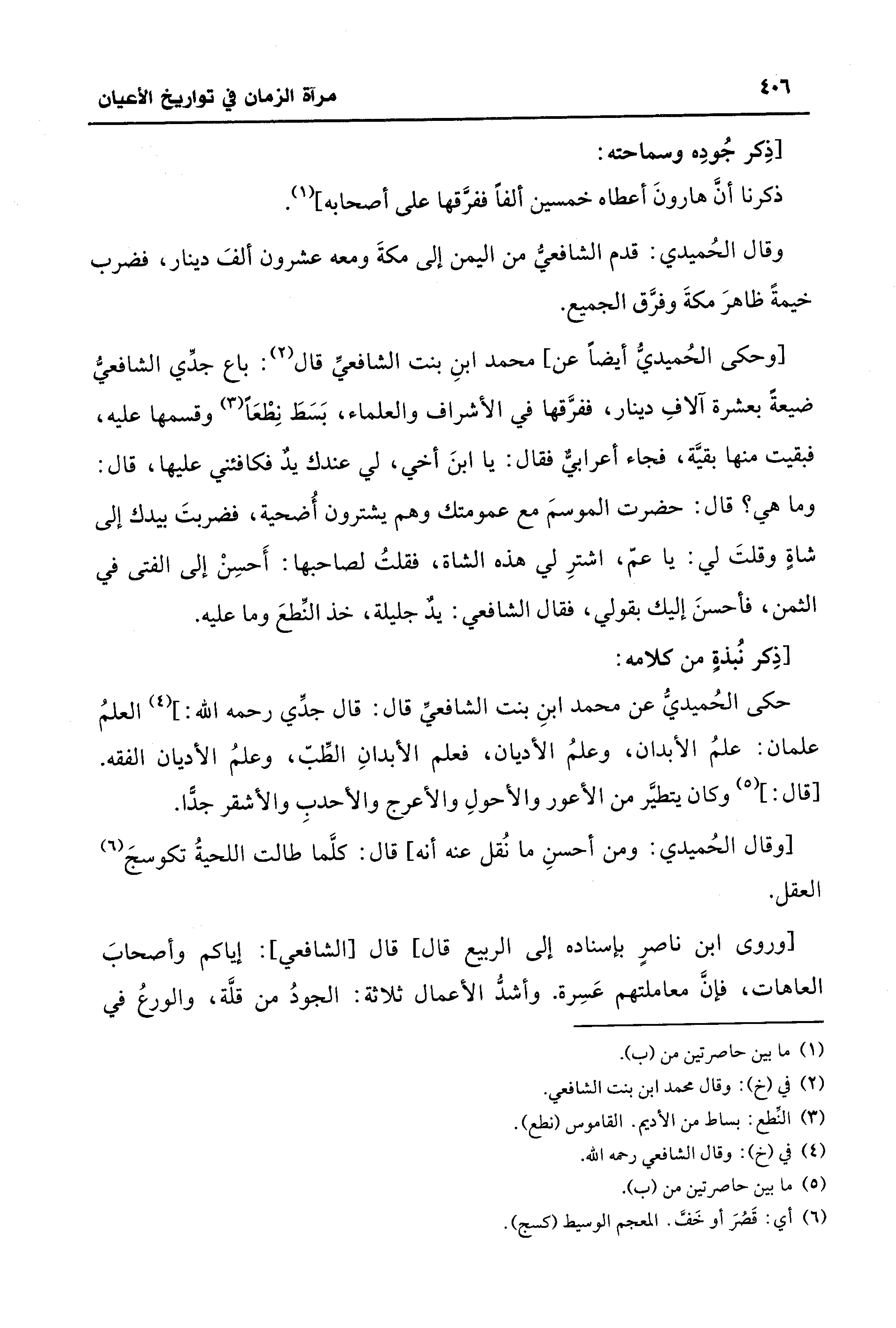 [وحكى الحُميديُّ أيضًا عن] محمد ابنِ بنت الشافعيِّ قال (¬2): باع جدِّي الشافعيُّ ضيعةً بعشرة آلافِ دينار، ففرَّقها في الأشراف والعلماء، بَسَطَ نِطْعًا (¬3) وقسمها عليه، فبقيت منها بقيَّة، فجاء أعرابيٌّ فقال: يا ابنَ أخي، لي عندك يدٌ فكافئني عليها، قال: وما هي؟ قال: حضرت الموسمَ مع عمومتك وهم يشترون أُضحية، فضربتَ بيدك إلى شاةٍ وقلتَ لي: يا عمّ، اشترِ لي هذه الشاة، فقلتُ لصاحبها: أَحسِنْ إلى الفتى في الثمن، فأحسنَ إليك بقولي، فقال الشافعي: يدٌ جليلة، خذ النِّطعَ وما عليه.