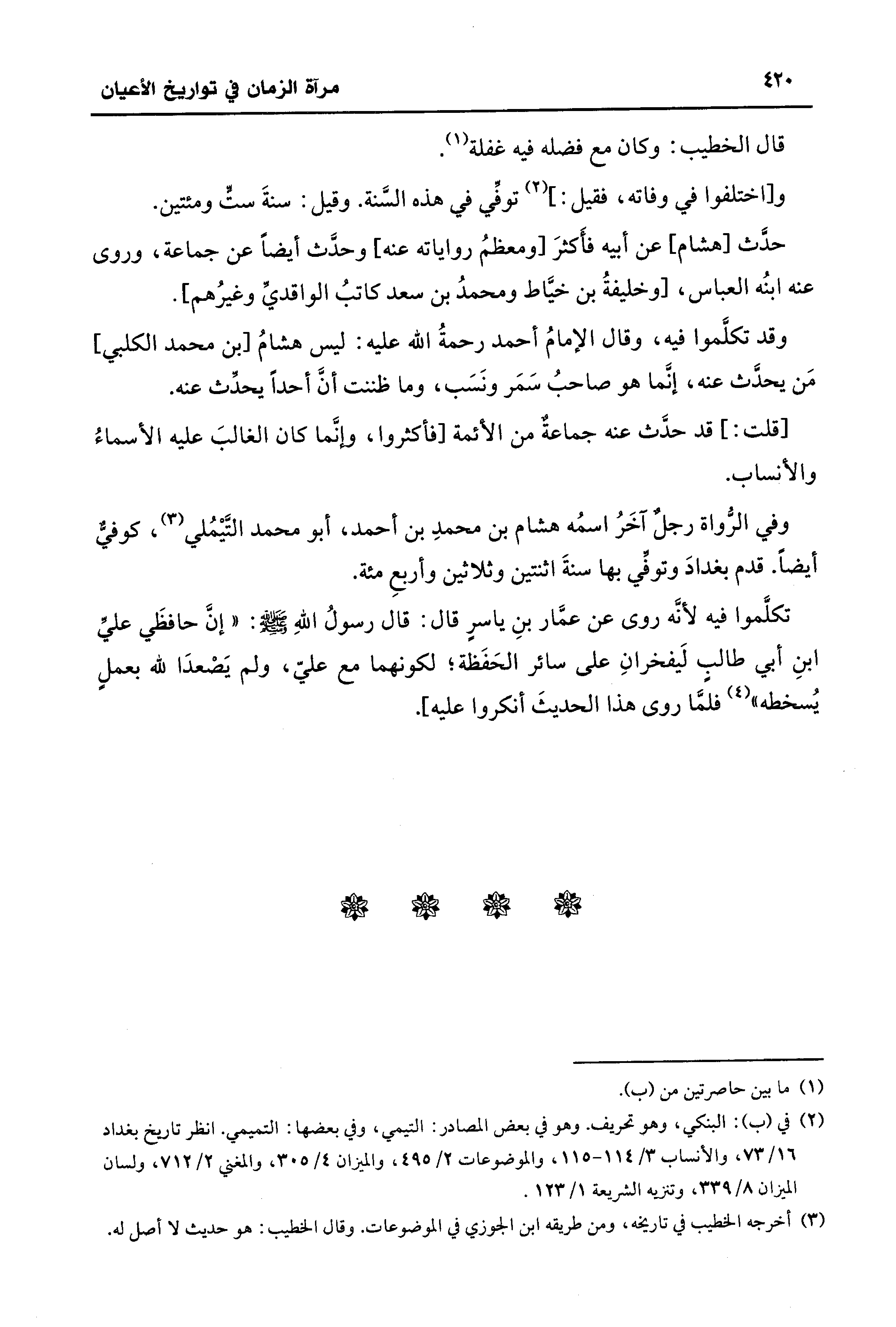وفي الرُّواة رجلٌ آخَرُ اسمُه هشام بن محمدِ بن أحمد، أبو محمد التَّيمُلي (¬3)، كوفيٌّ أيضًا. قدم بغدادَ وتوفي بها سنةَ اثنتين وثلاثين وأربعِ مئة.
