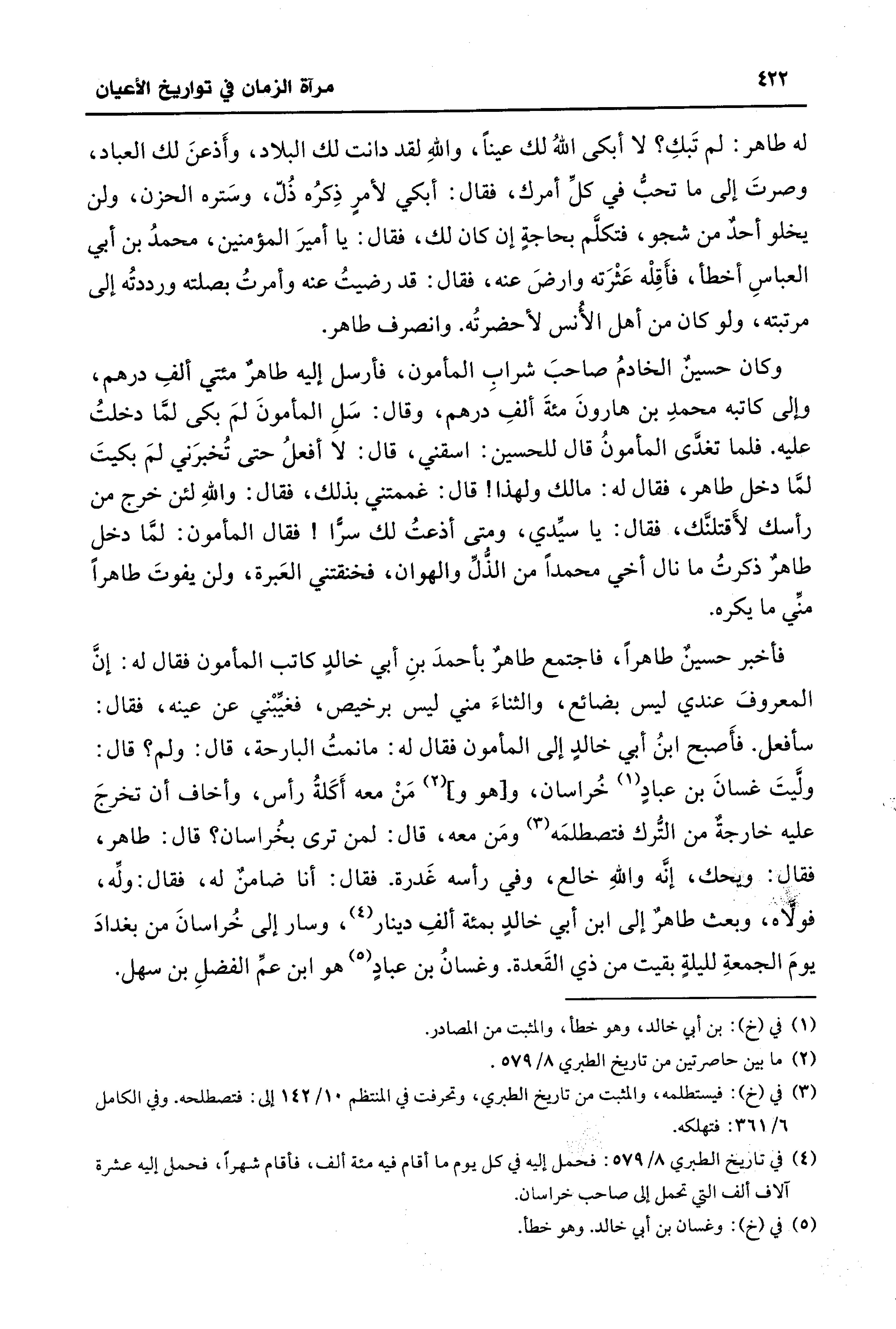 وكان حسينٌ الخادمُ صاحبَ شراب المأمون، فأرسل إليه طاهرٌ مئتي ألف درهم، وإلى كاتبه محمدِ بن هارونَ مئةَ ألفَ درهم، وقال: سَلِ المأمونَ لمَ بكى لمَّا دخلتُ عليه. فلما تغدَّى المأمونُ قال للحسين: اسقني، قال: لا أفعلُ حتى تُخبرَني لمَ بكيتَ لمَّا دخل طاهر، فقال له: ما لك ولهذا! قال: غممتني بذلك، فقال: واللهِ لئن خرج من رأسك لأَقتلنَّك، فقال: يا سيِّدي، ومتى أذعتُ لك سرًّا! فقال المأمون: لمَّا دخل طاهرٌ ذكرتُ ما نال أخي محمدًا من الذُّلِّ والهوان، فخنقتني العَبرة، ولن يفوتَ طاهرًا منِّي ما يكره.
