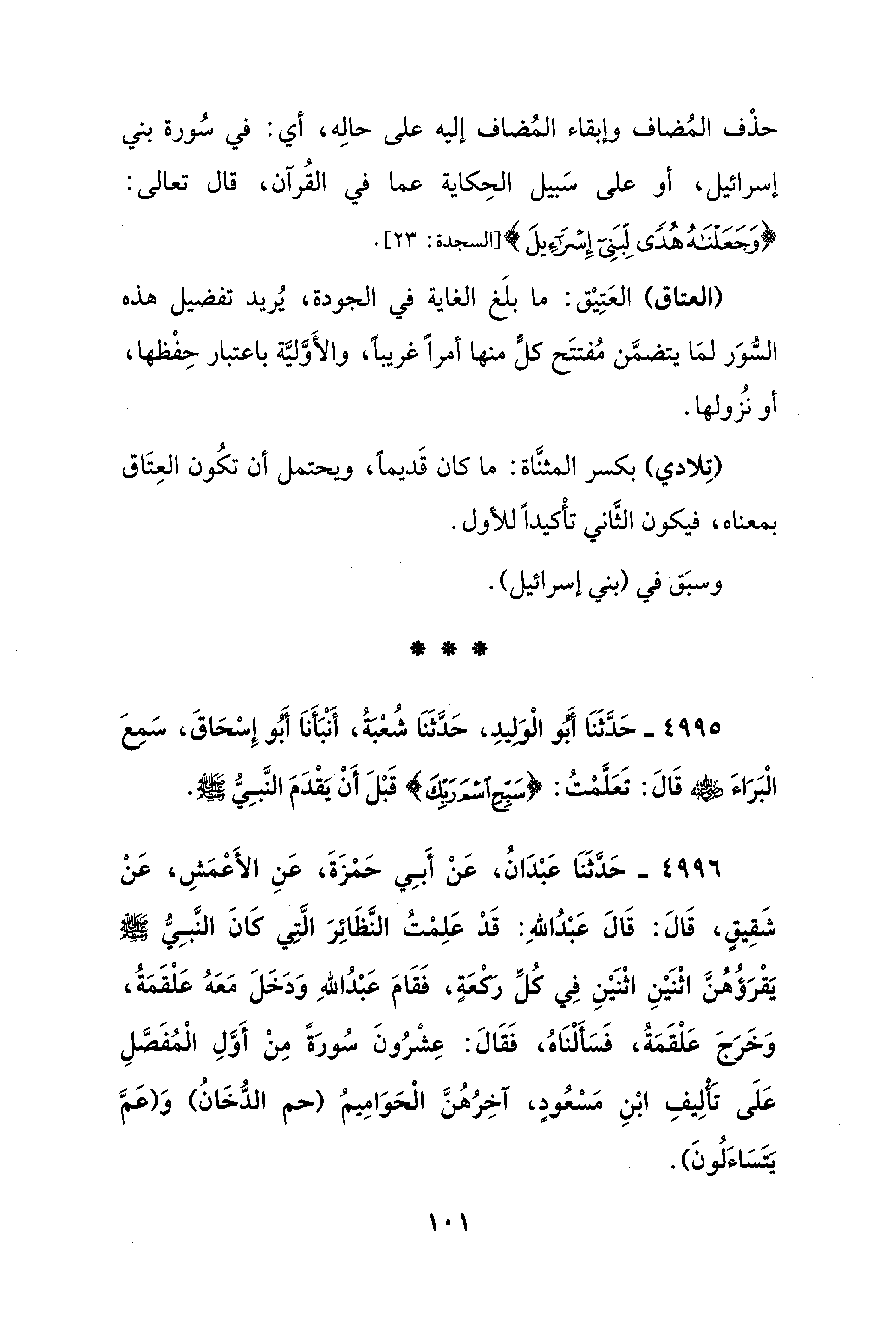 حذْف المُضاف وإبقاء المُضاف إليه على حالِه، أي: في سُورة بني إسرائيل، أو على سَبيل الحِكاية عما في القُرآن، قال تعالى: {وَجَعَلْنَاهُ هُدًى لِبَنِي إِسْرَائِيلَ} [السجدة: 23].
