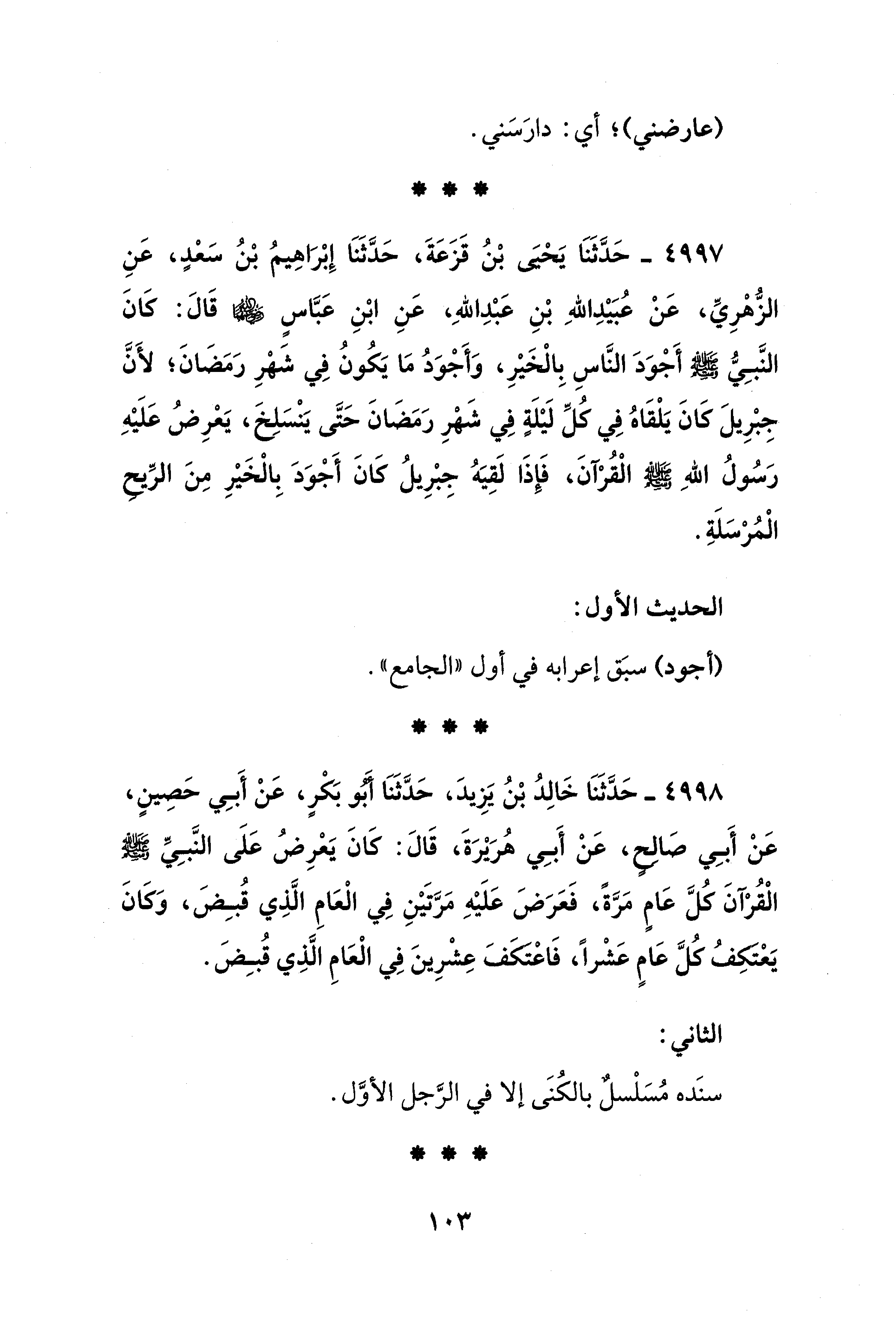 4997 - حَدَّثنا يَحْيَى بْنُ قَزَعَةَ، حَدَّثَنَا إِبْرَاهِيمُ بْنُ سَعْدٍ، عَنِ الزُّهْرِيِّ، عَنْ عُبَيْدِ اللهِ بْنِ عَبْدِ اللهِ، عَنِ ابْنِ عَبَّاسٍ - رضي الله عنهما - قَالَ: كَانَ النَّبِيُّ - صلى الله عليه وسلم - أَجْوَدَ النَّاسِ بِالْخَيْرِ، وَأَجْوَدُ مَا يَكُونُ فِي شَهْرِ رَمَضَانَ؛ لأَنَّ جِبْرِيلَ كَانَ يَلْقَاهُ فِي كُلِّ لَيْلَةٍ فِي شَهْرِ رَمَضَانَ حَتَّى يَنْسَلِخَ، يَعْرِضُ عَلَيْهِ رَسُولُ اللهِ - صلى الله عليه وسلم - الْقُرْآنَ، فَإِذَا لَقِيَهُ جِبْرِيلُ كَانَ أَجْوَدَ بِالْخَيْرِ مِنَ الرِّيح الْمُرْسَلَةِ.