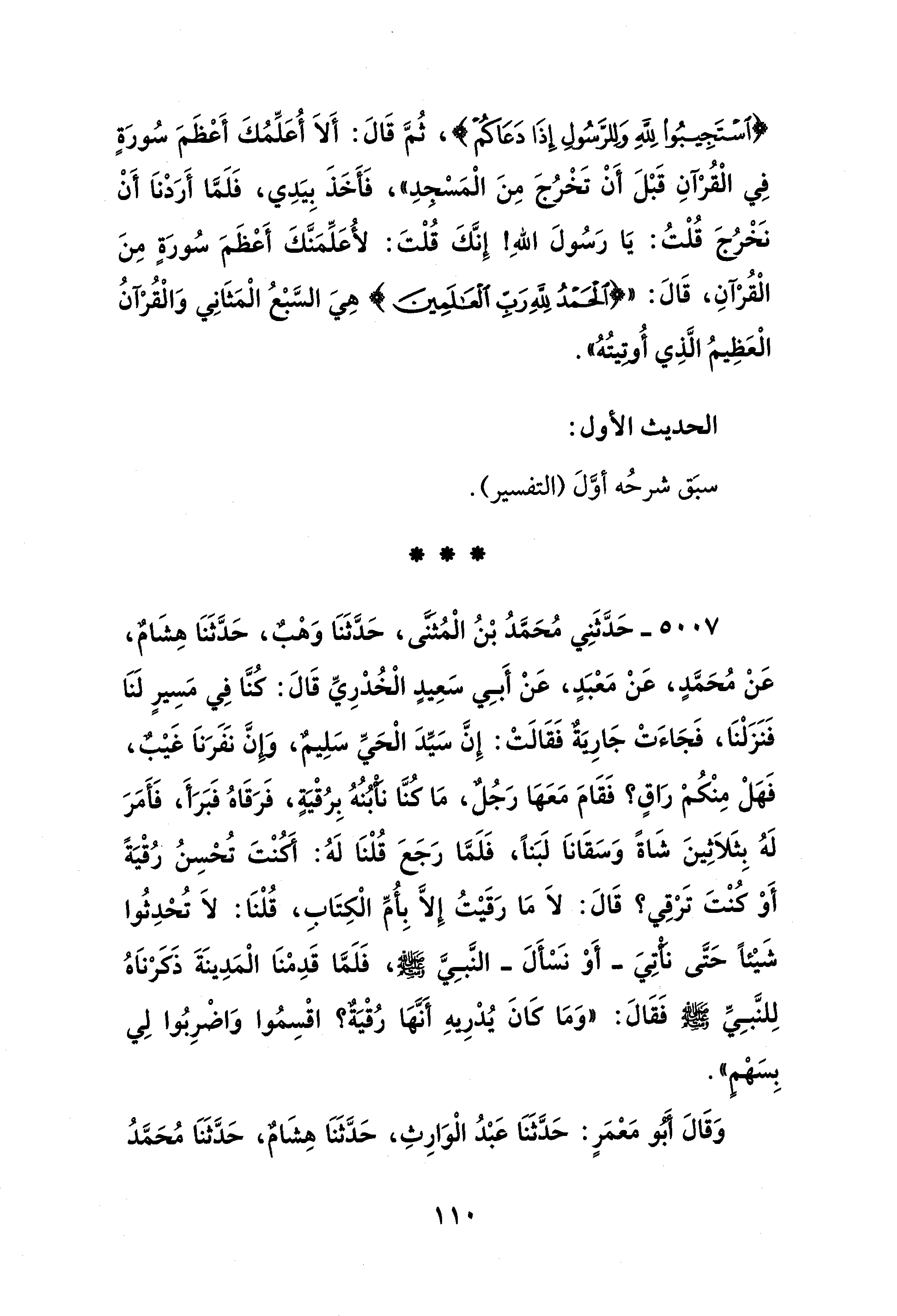 5007 - حَدَّثَنِي مُحَمَّدُ بْنُ الْمُثنَّى، حَدَّثَنَا وَهْبٌ، حَدَّثَنَا هِشَامٌ، عَنْ مُحَمَّدٍ، عَنْ مَعْبَدٍ، عَنْ أَبِي سَعِيدٍ الْخُدْرِيِّ قَالَ: كنَّا فِي مَسِيرٍ لنا فَنَزَلْنَا، فَجَاءَتْ جَارِيَةٌ فَقَالَتْ: إِنَّ سَيِّدَ الْحَيِّ سَلِيمٌ، وَإِنَّ نَفَرَنَا غَيْبٌ، فَهَلْ مِنْكُمْ رَاقٍ؟ فَقَامَ مَعَهَا رَجُلٌ، مَا كنَّا نَاْبُنُهُ بِرُقْيَةٍ، فَرَقَاهُ فَبَرَأَ، فَأَمَرَ لَهُ بِثَلاَثِينَ شَاةً وَسَقَاناَ لَبَنًا، فَلَمَّا رَجَعَ قُلْنَا لَهُ: كُنْتَ تُحْسِنُ رُقْيَةً أَوْ كُنْتَ تَرْقِي؟ قَالَ: لَا مَا رَقَيْتُ إِلَّا بِأُمِّ الْكِتَابِ، قُلْنَا: لَا تُحْدِثُوا شَيْئًا حَتَّى نَأْتِيَ -أَوْ نسأَلَ- النَّبِيَّ - صلى الله عليه وسلم -، فَلَمَّا قَدِمْنَا الْمَدِينَةَ ذَكَرْنَاهُ لِلنَّبِيِّ - صلى الله عليه وسلم - فَقَالَ: "وَمَا كَانَ يُدْرِيهِ أَنَّهَا رُقْيَةٌ؟ اقْسِمُوا وَاضْرِبُوا لِي بِسَهْمٍ".