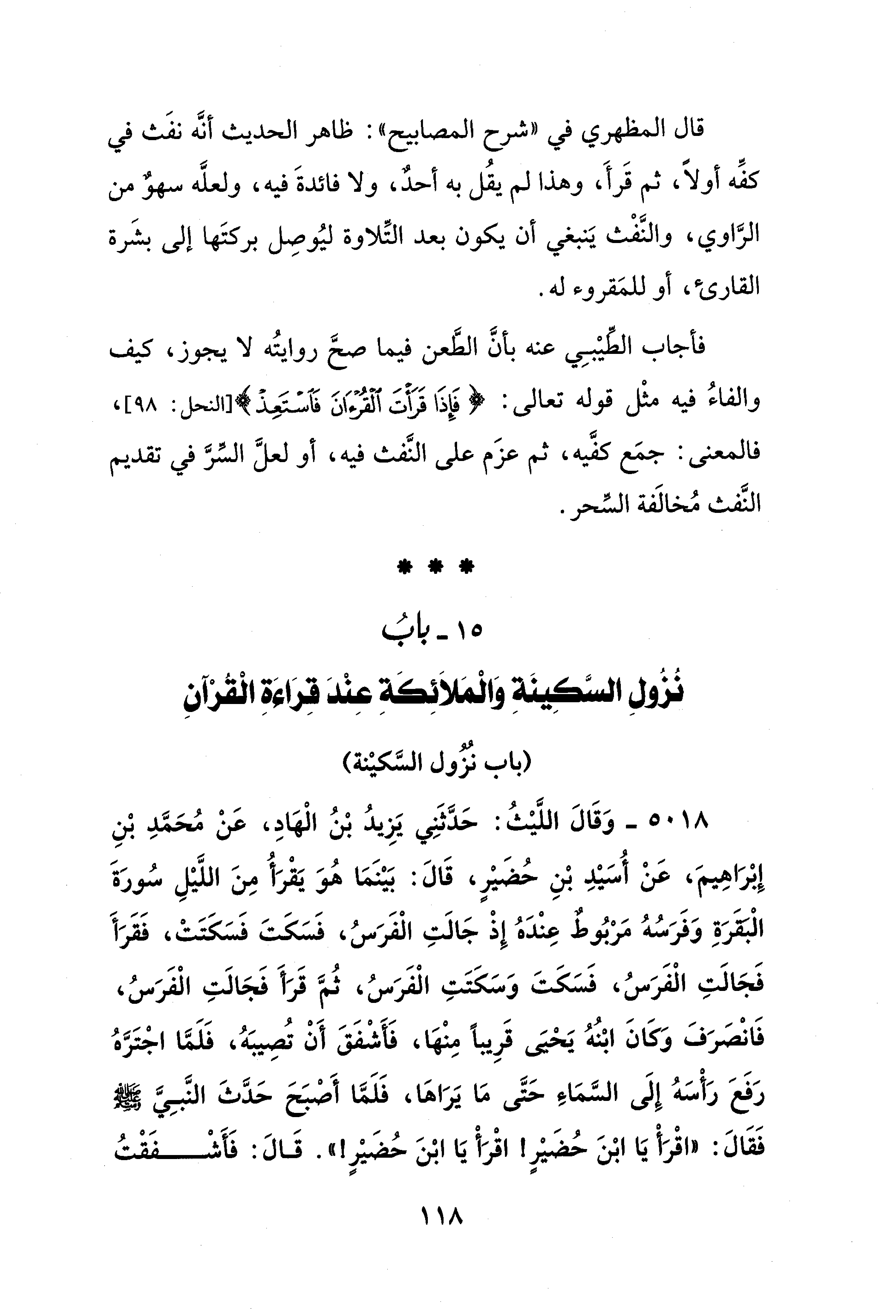 قال المظهري في "شرح المصابيح": ظاهر الحديث أنَّه نفَث في كفِّه أولًا، ثم قَرأَ، وهذا لم يقُل به أحدٌ، ولا فائدةَ فيه، ولعلَّه سهوٌ من الرَّاوي، والنَّفْث يَنبغي أن يكون بعد التِّلاوة ليُوصِل بركتَها إلى بشَرة القارئ، أو للمَقروء له.