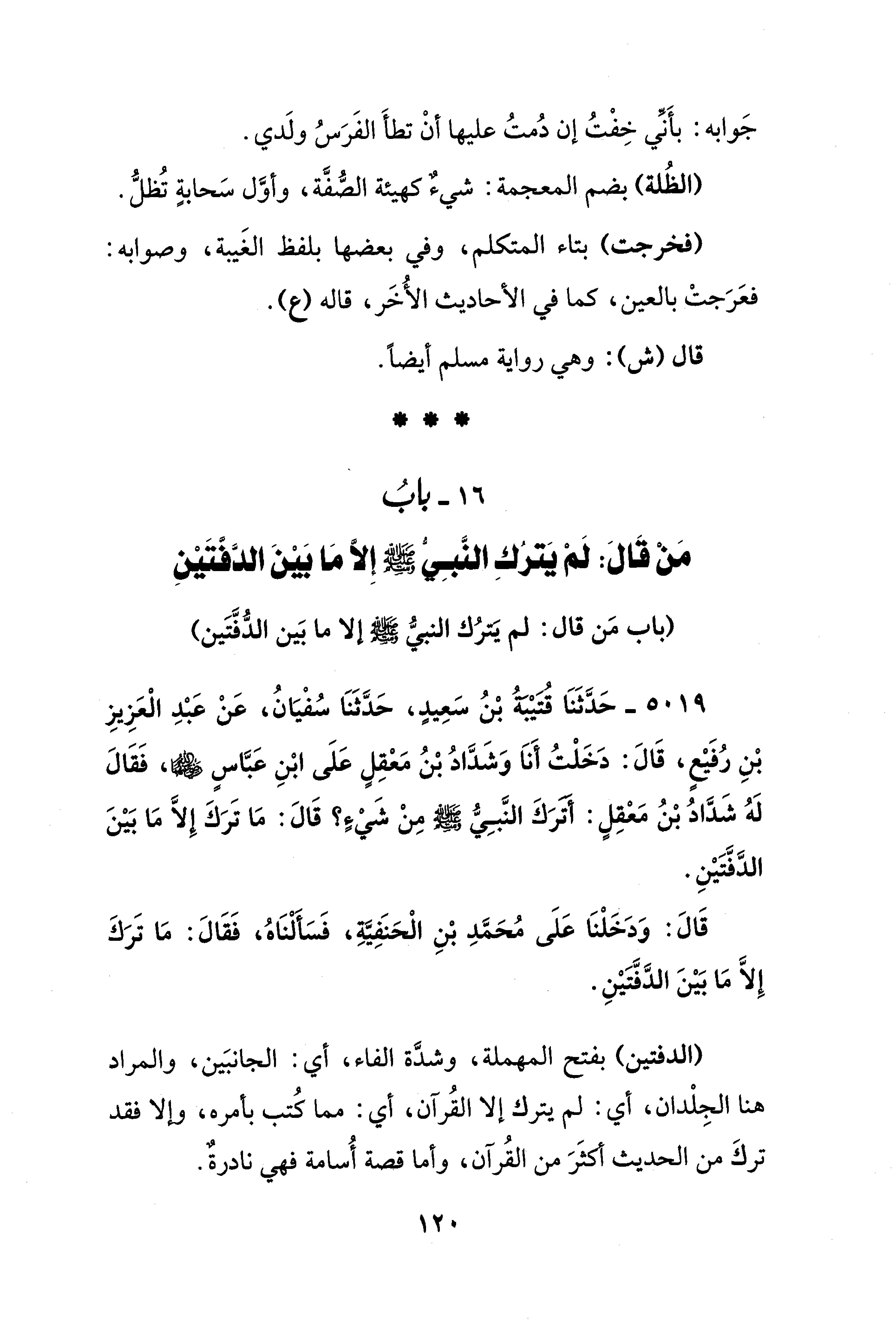 5019 - حَدَّثَنَا قُتَيْبَةُ بْنُ سَعِيدٍ، حَدَّثَنَا سُفْيَانُ، عَنْ عَبْدِ الْعَزِيزِ بْنِ رُفَيْعٍ، قَالَ: دَخَلْتُ أَنَا وَشَدَّادُ بْنُ مَعْقِلٍ عَلَى ابْنِ عَبَّاسٍ - رضي الله عنهما -، فَقَالَ لَهُ شَدَّادُ بْنُ مَعْقِلٍ: أَتَرَكَ النَّبِيُّ - صلى الله عليه وسلم - مِنْ شَيْء؟ قَالَ: مَا تَرَكَ إِلَّا مَا بَيْنَ الدَّفَّتَيْنِ.