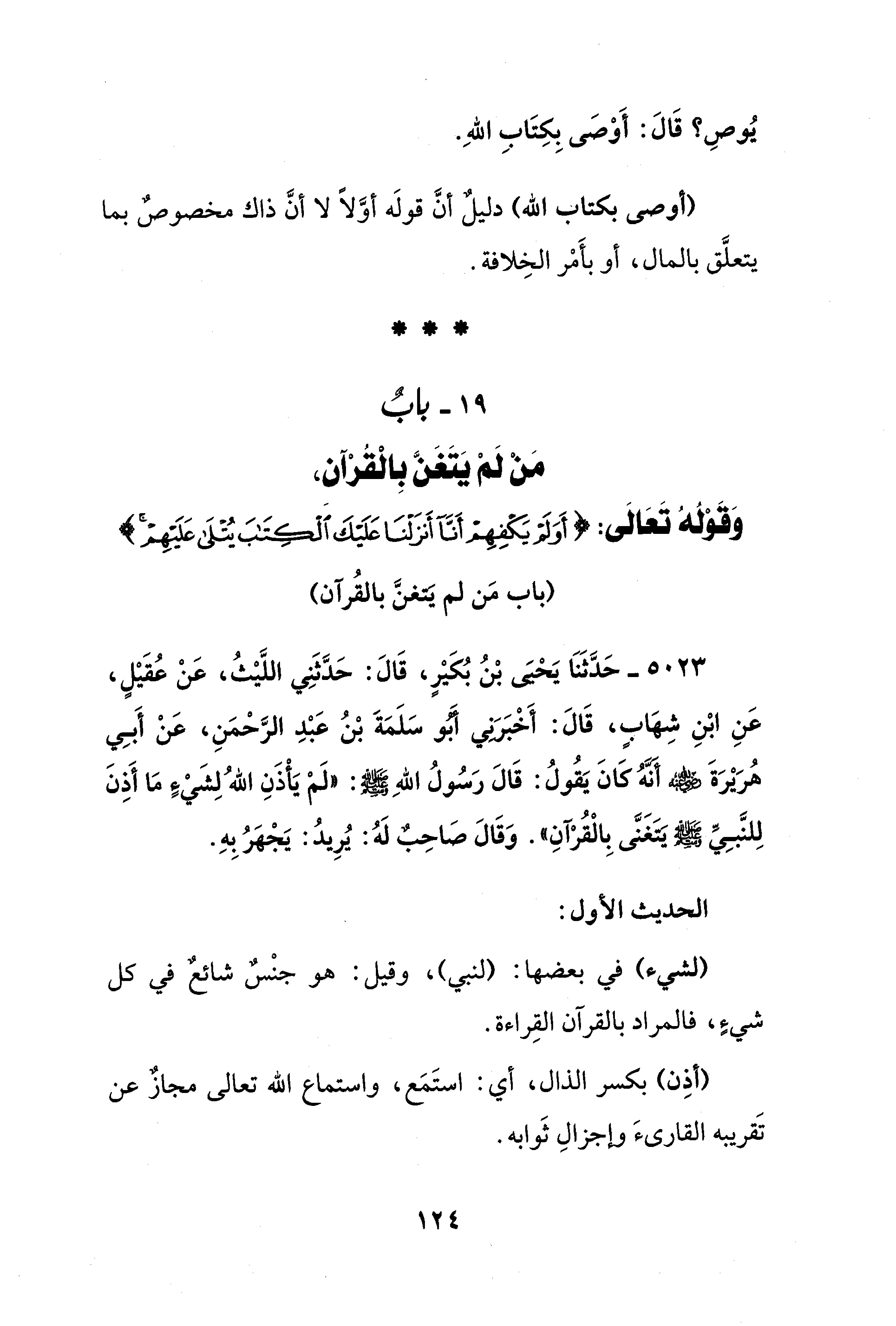 19 - بابٌ مَنْ لَمْ يَتَغَنَّ بِالْقُرْآن، وَقوْلُهُ تَعَالَى: {أَوَلَمْ يَكْفِهِمْ أَنَّا أَنْزَلْنَا عَلَيْكَ الْكِتَابَ يُتْلَى عَلَيْهِمْ}