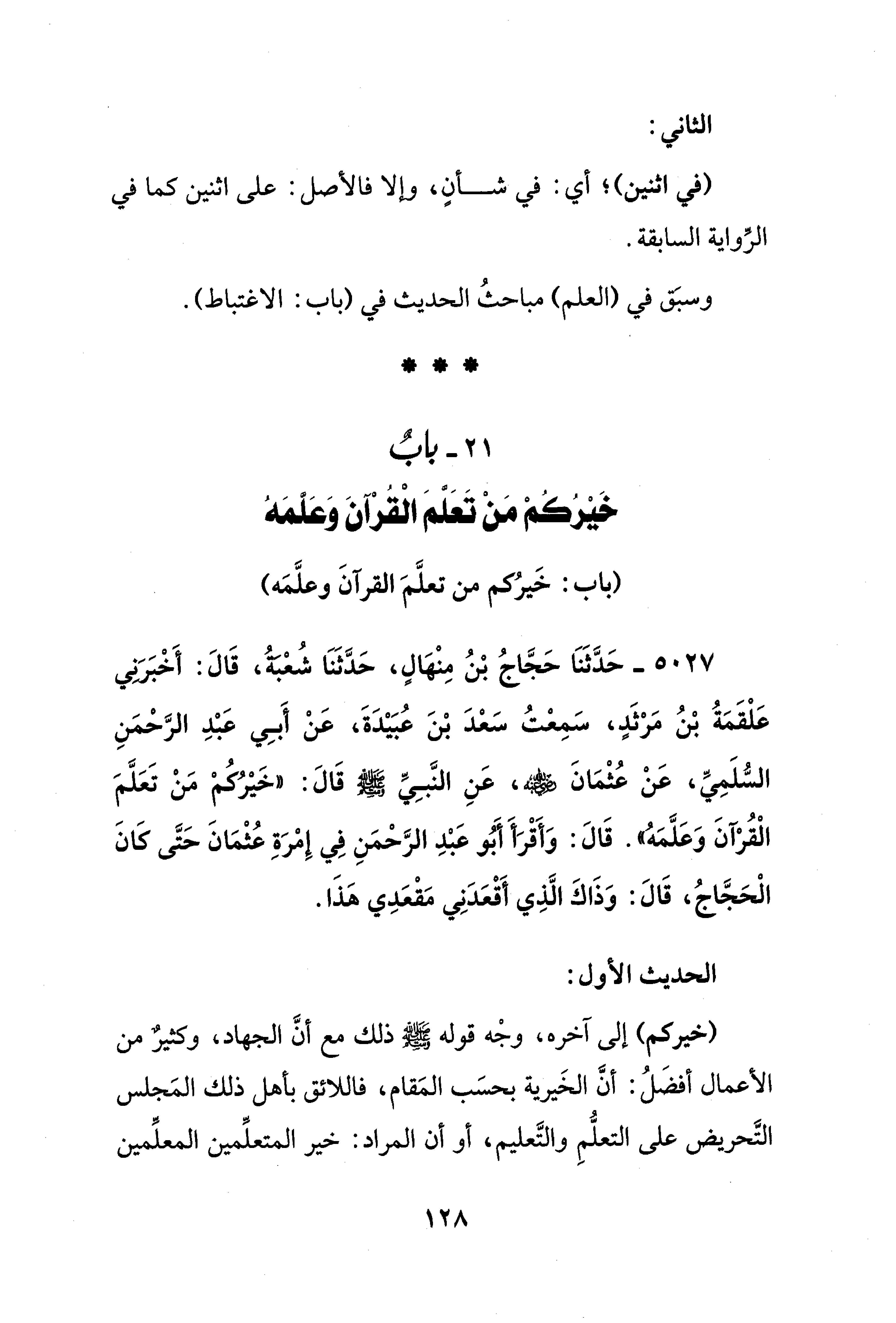 5027 - حَدَّثَنَا حَجَّاجُ بْنُ مِنْهَالٍ، حَدَّثَنَا شُعْبَةُ، قَالَ: أَخْبَرَنِي عَلْقَمَةُ بْنُ مَرْثَدٍ، سَمِعْتُ سَعْدَ بْنَ عُبَيْدَةَ، عَنْ أَبِي عَبْدِ الرَّحْمَنِ السُّلَمِيِّ، عَنْ عُثْمَانَ - رضي الله عنه -، عَنِ النَّبِيِّ - صلى الله عليه وسلم - قَالَ: "خَيْرُكُمْ مَنْ تَعَلَّمَ الْقُرْآنَ وَعَلَّمَهُ". قَالَ: وَأَقْرَأَ أَبُو عَبْدِ الرَّحْمَنِ فِي إِمْرَةِ عُثْمَانَ حَتَّى كَانَ الْحَجَّاجُ، قَالَ: وَذَاكَ الَّذِي أَقْعَدَنِي مَقْعَدِي هَذَا.