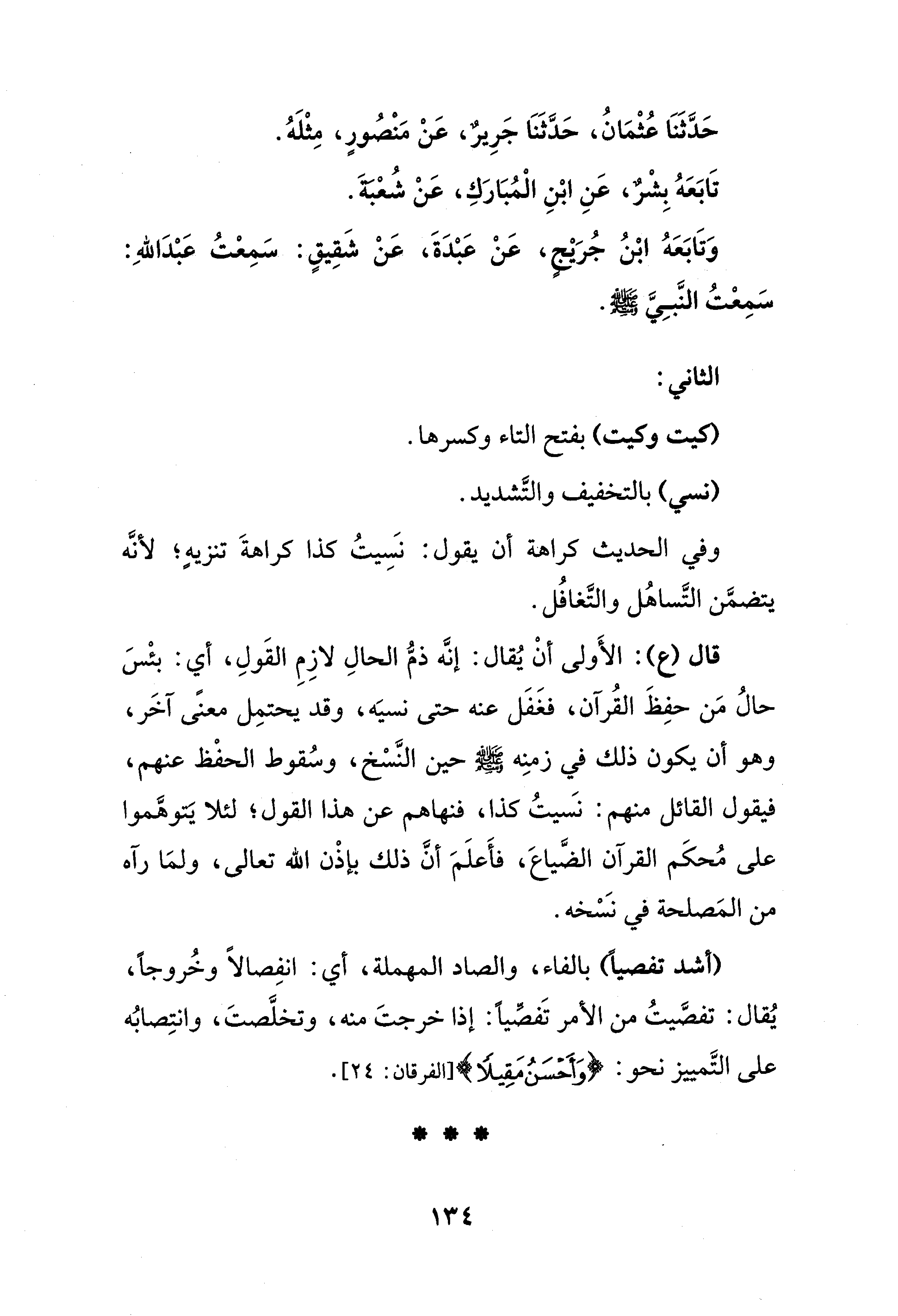 قال (ع): الأَولى أنْ يُقال: إنَّه ذمُّ الحالِ لازِمِ القَولِ، أي: بئْسَ حالُ مَن حفِظَ القُرآن، فغَفَل عنه حتى نسيَه، وقد يحتمِل معنًى آخَر، وهو أن يكون ذلك في زمنِه - صلى الله عليه وسلم - حين النَّسْخ، وسُقوط الحفْظ عنهم، فيقول القائل منهم: نسَيتُ كذا، فنهاهم عن هذا القول؛ لئلا يَتوهَّموا على مُحكَم القرآن الضَّياعَ، فأَعلَمَ أنَّ ذلك بإذْن الله تعالى، ولمَا رآه من المَصلحة في نسخه.