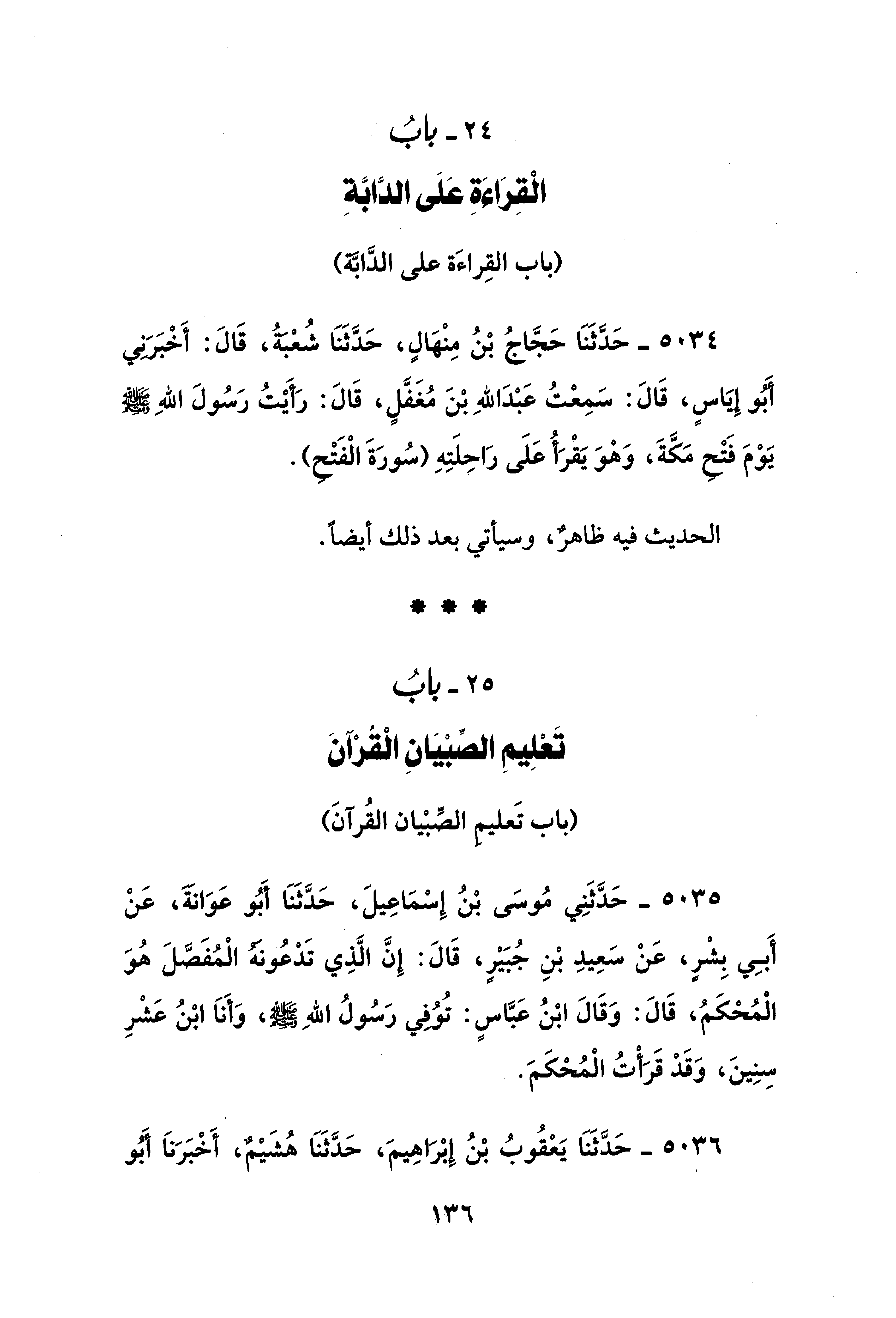 5035 - حَدَّثَنِي مُوسَى بْنُ إِسْمَاعِيلَ، حَدَّثَنَا أَبُو عَوَانَةَ، عَنْ أَبِي بِشْرٍ، عَنْ سَعِيدِ بْنِ جُبَيْرٍ، قَالَ: إِنَّ الَّذِي تَدْعُونا الْمُفَصَّلَ هُوَ الْمُحْكَمُ، قَالَ: وَقَالَ ابْنُ عَبَّاسٍ: تُوُفِي رَسُولُ اللهِ - صلى الله عليه وسلم -، وَأَنَا ابْنُ عَشْرِ سِنِينَ، وَقَدْ قَرَأْتُ الْمُحْكَمَ.