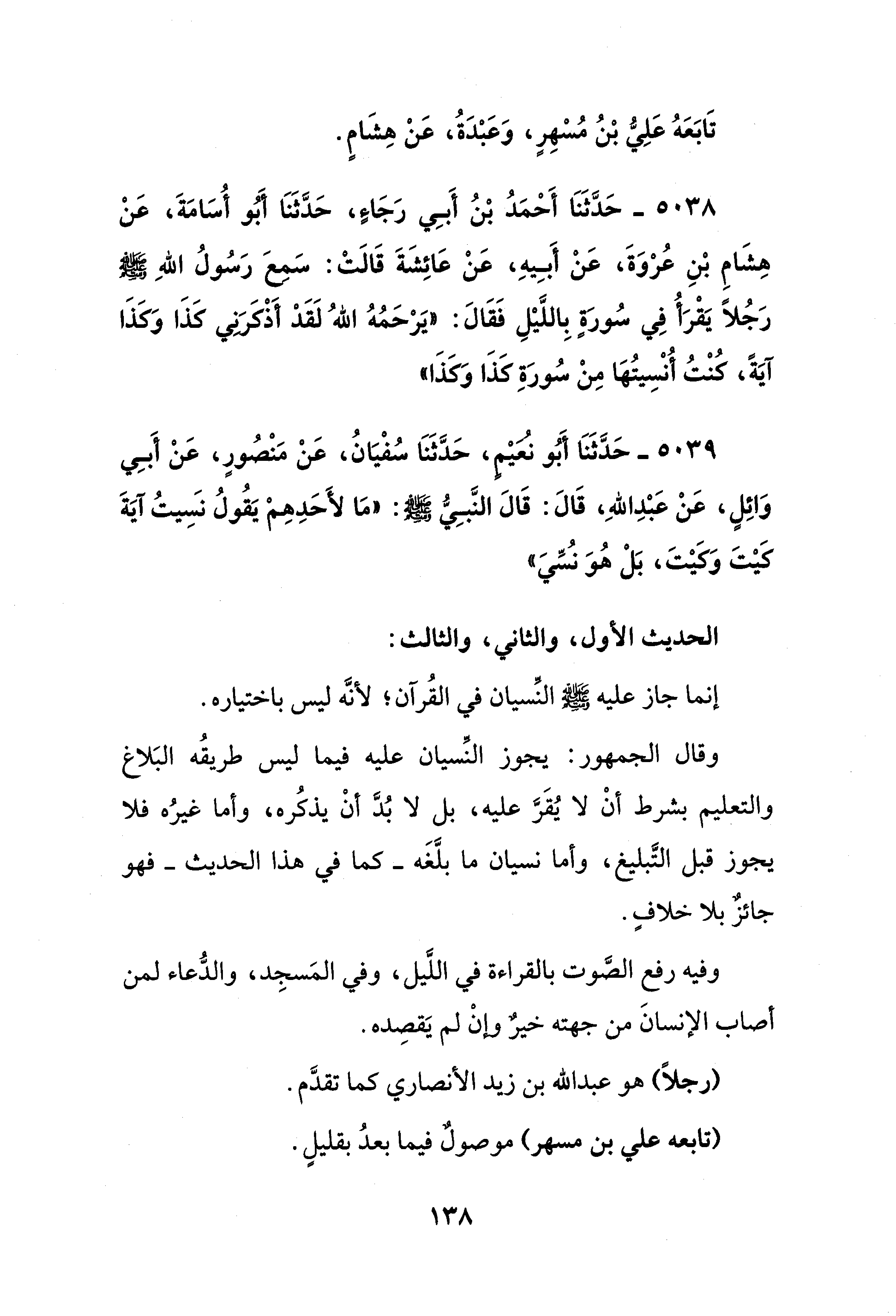 وقال الجمهور: يجوز النِّسيان عليه فيما ليس طريقُه البَلاغ والتعليم بشرط أنْ لا يُقَرَّ عليه، بل لا بُدَّ أنْ يذكُره، وأما غيرُه فلا يجوز قبل التَّبليغ، وأما نسيان ما بلَّغَه -كما في هذا الحديث- فهو جائزٌ بلا خلافٍ.