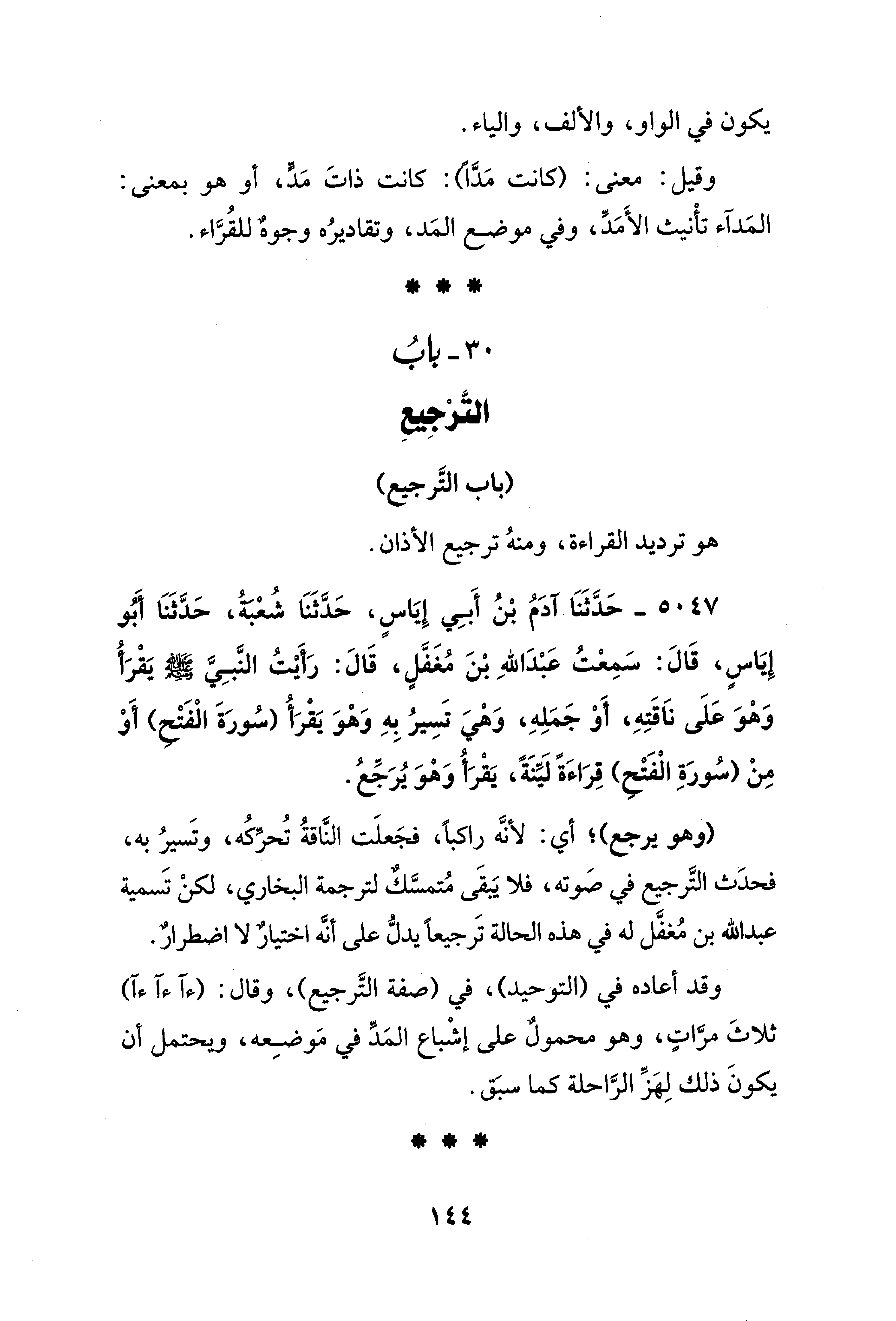 5047 - حَدَّثَنَا آدَمُ بْنُ أَبِي إِيَاسٍ، حَدَّثَنَا شُعْبة, حَدَّثَنَا أَبُو إِيَاسٍ، قَالَ: سَمِعْتُ عَبْدَ اللهِ بْنَ مُغَفَّلٍ، قَالَ: رَأَيتُ النَّبِيَّ - صلى الله عليه وسلم - يَقْرَأُ وَهْوَ عَلَى نَاقَتِهِ، أَوْ جَمَلِهِ، وَهْيَ تَسِيرُ بِهِ وَهْوَ يَقْرَأُ (سُورَةَ الْفَتْح) أَوْ مِنْ (سُورَةِ الْفَتْح) قِرَاءَةً لَيِّنَةً، يَقْرَأُ وَهْوَ يُرَجِّعُ.