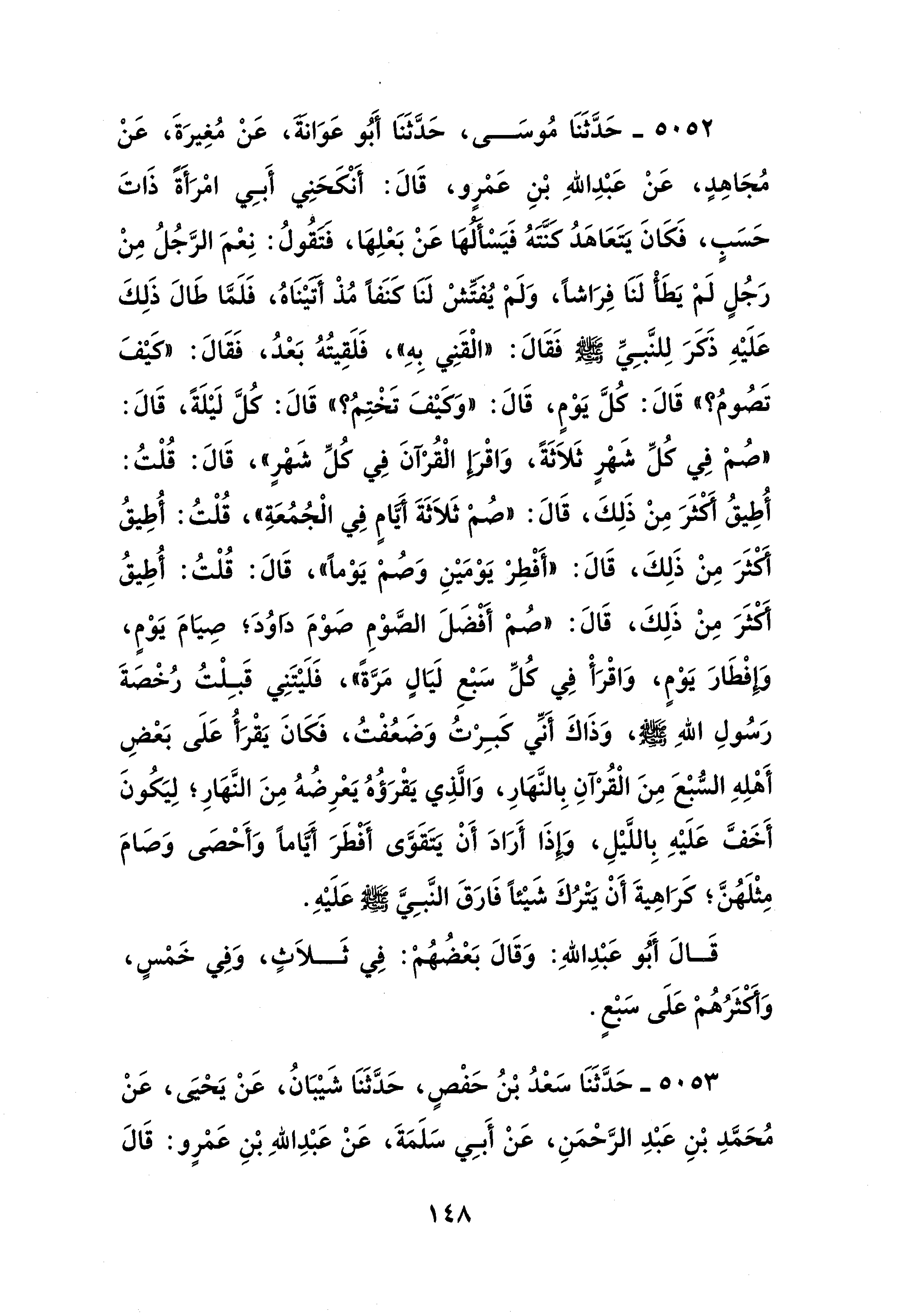 5052 - حَدَّثَنَا مُوسَى، حَدَّثَنَا أَبُو عَوَانَةَ، عَنْ مُغِيرَةَ، عَنْ مُجَاهِدٍ، عَنْ عَبْدِ اللهِ بْنِ عَمْرٍو، قَالَ: أَنْكَحَنِي أَبِي امْرَأَةً ذَاتَ حَسَبٍ، فَكَانَ يَتَعَاهَدُ كنَّتَهُ فَيَسْألهَا عَنْ بَعْلِهَا، فتَقُولُ: نِعْمَ الرَّجُلُ مِنْ رَجُلٍ لَمْ يَطأْ لَنَا فِرَاشًا، وَلَمْ يُفَتِّشْ لَنَا كَنَفًا مُذْ أتيْنَاهُ، فَلَمَّا طَالَ ذَلِكَ عَلَيْهِ ذَكَرَ لِلنَّبِيِّ - صلى الله عليه وسلم - فَقَالَ: "الْقَنِي بِهِ"، فَلَقِيتُهُ بَعْدُ، فَقَالَ: "كَيْفَ تَصُومُ؟ " قَالَ: كُلَّ يَوْمٍ، قَالَ: "وَكَيْفَ تَخْتِمُ؟ " قَالَ: كُلَّ لَيْلَةً، قَالَ: "صُمْ فِي كُلِّ شَهْرٍ ثَلاَثَةً، وَاقْرَإِ الْقُرْآنَ فِي كُلِّ شَهْر"، قَالَ: قُلْتُ: أُطِيقُ أكثَرَ مِنْ ذَلِكَ، قَالَ: "صُمْ ثَلاَثَةَ أَيَّامٍ فِي الْجُمُعَةِ"، قُلْتُ: أُطِيقُ أكثَرَ مِنْ ذَلِكَ، قَالَ: "أَفْطِرْ يَوْمَيْنِ وَصُمْ يَوْمًا"، قَالَ: قُلْتُ: أُطِيقُ أَكثَرَ مِنْ ذَلِكَ، قَالَ: "صُمْ أَفْضَلَ الصَّوْمِ صَوْمَ دَاوُدَ؛ صِيَامَ يَوْمٍ، وَإِفْطَارَ يَوْمٍ، وَاقْرَأْ فِي كُلِّ سَبع لَيَالٍ مَرَّةً"، فَلَيْتَنِي قَبِلْتُ رُخْصَةَ رَسُولِ اللهِ - صلى الله عليه وسلم -، وَذَاكَ أَنِّي كَبِرْتُ وَضَعُفْتُ، فَكَانَ يَقْرَأُ عَلَى بَعْضِ أَهْلِهِ السُّبْعَ مِنَ الْقُرْآنِ بِالنَّهَارِ، وَالَّذِي يَقْرَؤُهُ يَعْرِضُهُ مِنَ النَّهَارِ؛ لِيَكُونَ أَخَفَّ عَلَيْهِ بِاللَّيْلِ، وَإِذَا أَرَادَ أَنْ يَتَقَوَّى أَفْطَرَ أَيَّامًا وَأَحْصَى وَصَامَ مِثْلَهُنَّ؛ كَرَاهِيةَ أَنْ يَتْرُكَ شَيْئًا فَارَقَ النَّبِيَّ - صلى الله عليه وسلم - عَلَيْهِ.